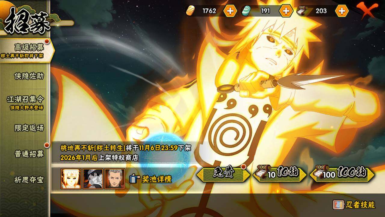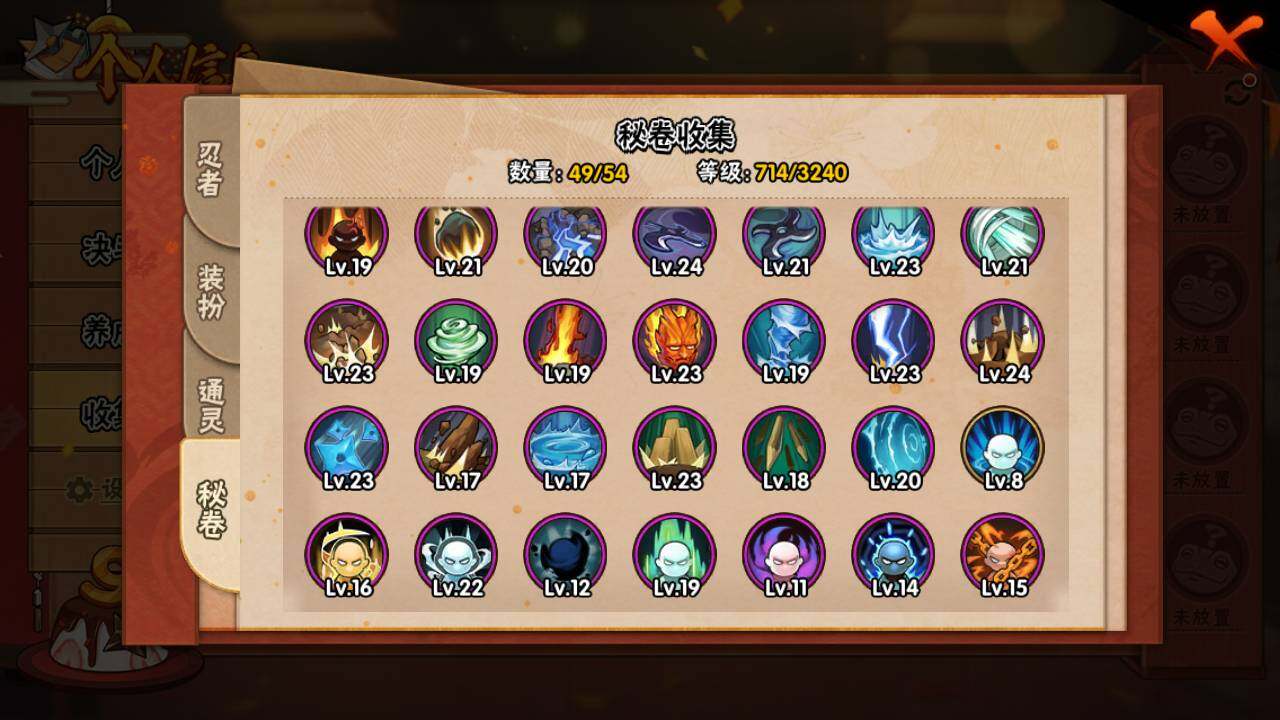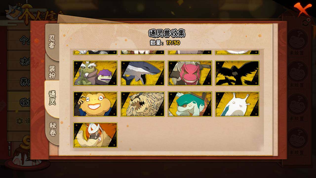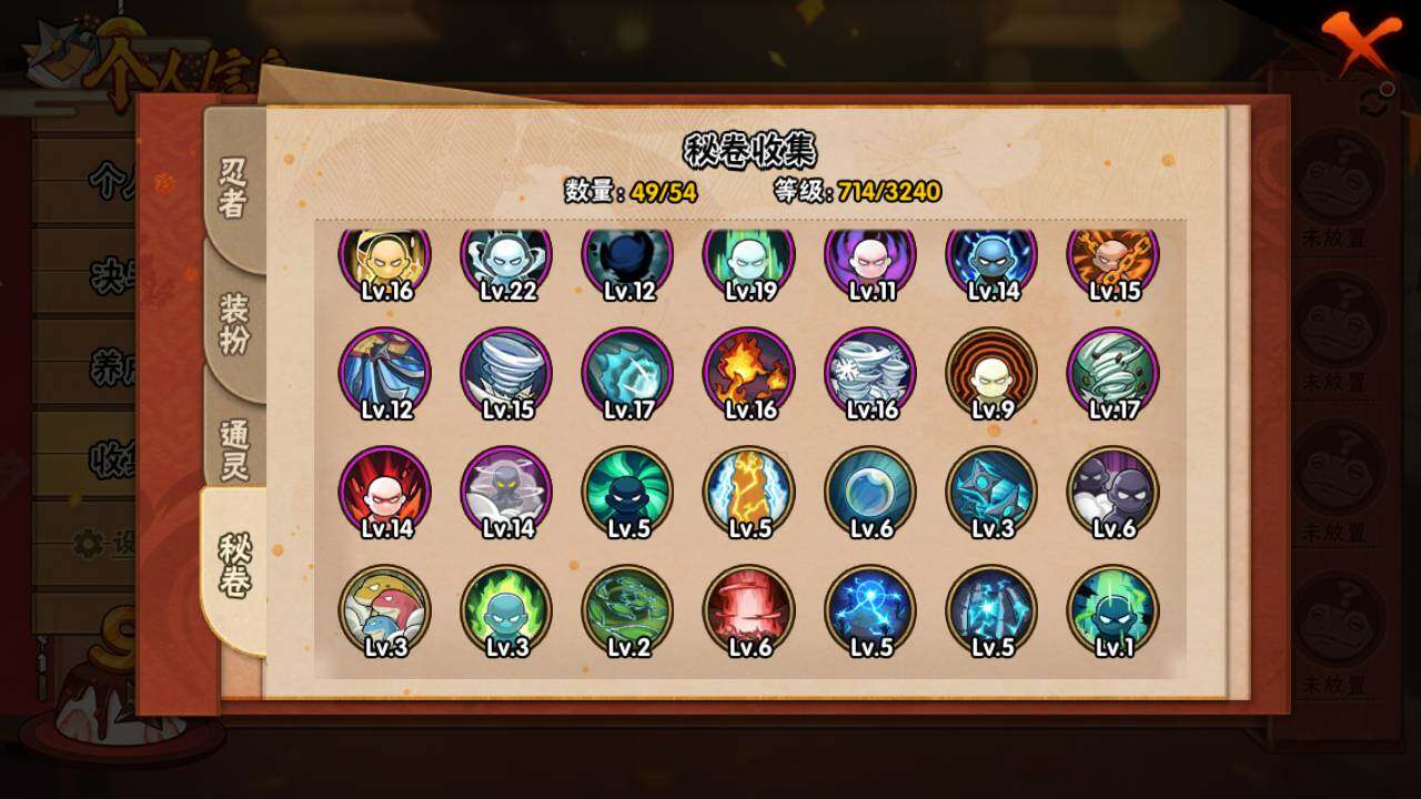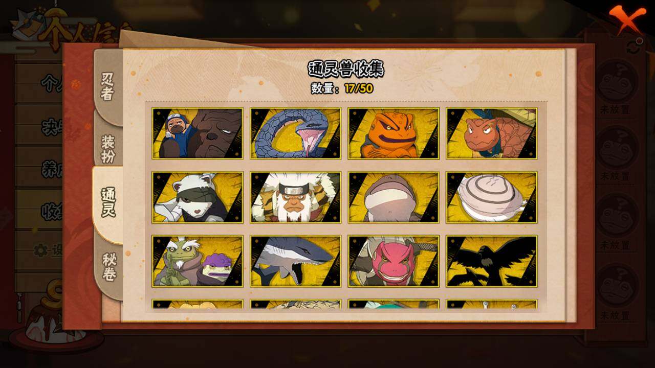 【S级忍者】:宇智波斑「秽土转生」(3星),宇智波斑「秽土转生·解」(3星),宇智波带土「忍界大战」(3星),艾「忍界大战」(3星),宇智波鼬「须佐能乎」(3星),宇智波止水「须佐能乎」(3星),旗木卡卡西「须佐能乎」(3星),自来也(3星),自来也「舞之豪杰」(3星),大蛇丸(4星),自来也「传说中的三忍」(3星),纲手「百豪」(3星),波风水门(3星),漩涡鸣人「九喇嘛连结」(3星),迈特凯「死门」(3星),佩恩「天道」(3星),宇智波佐助「永恒万花筒」(3星),宇智波斑 「白面具」(3星宇智波斑「白面具」),大筒木桃式(3星)