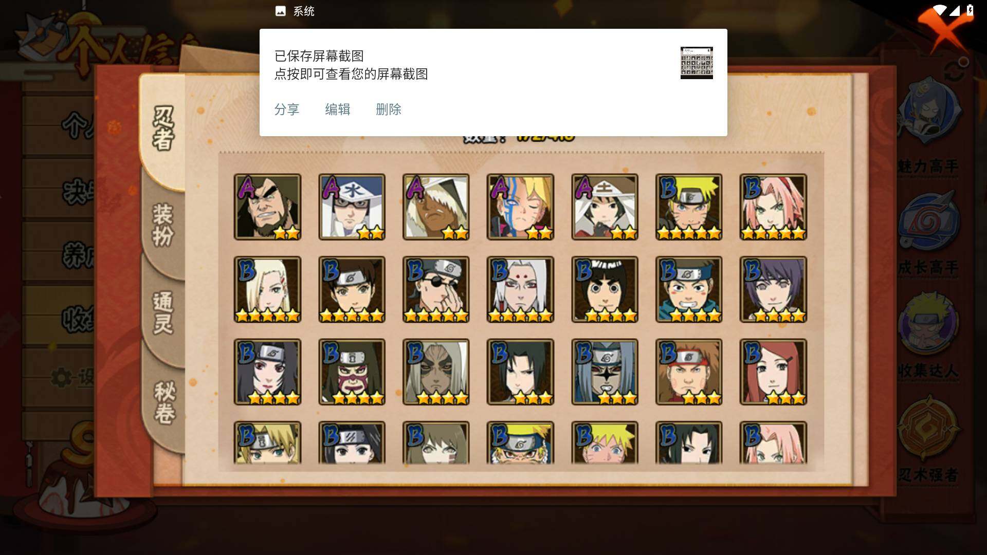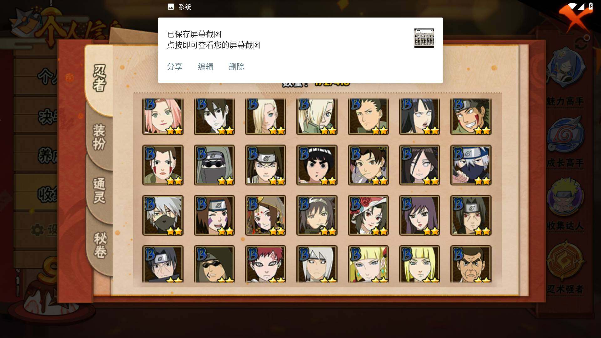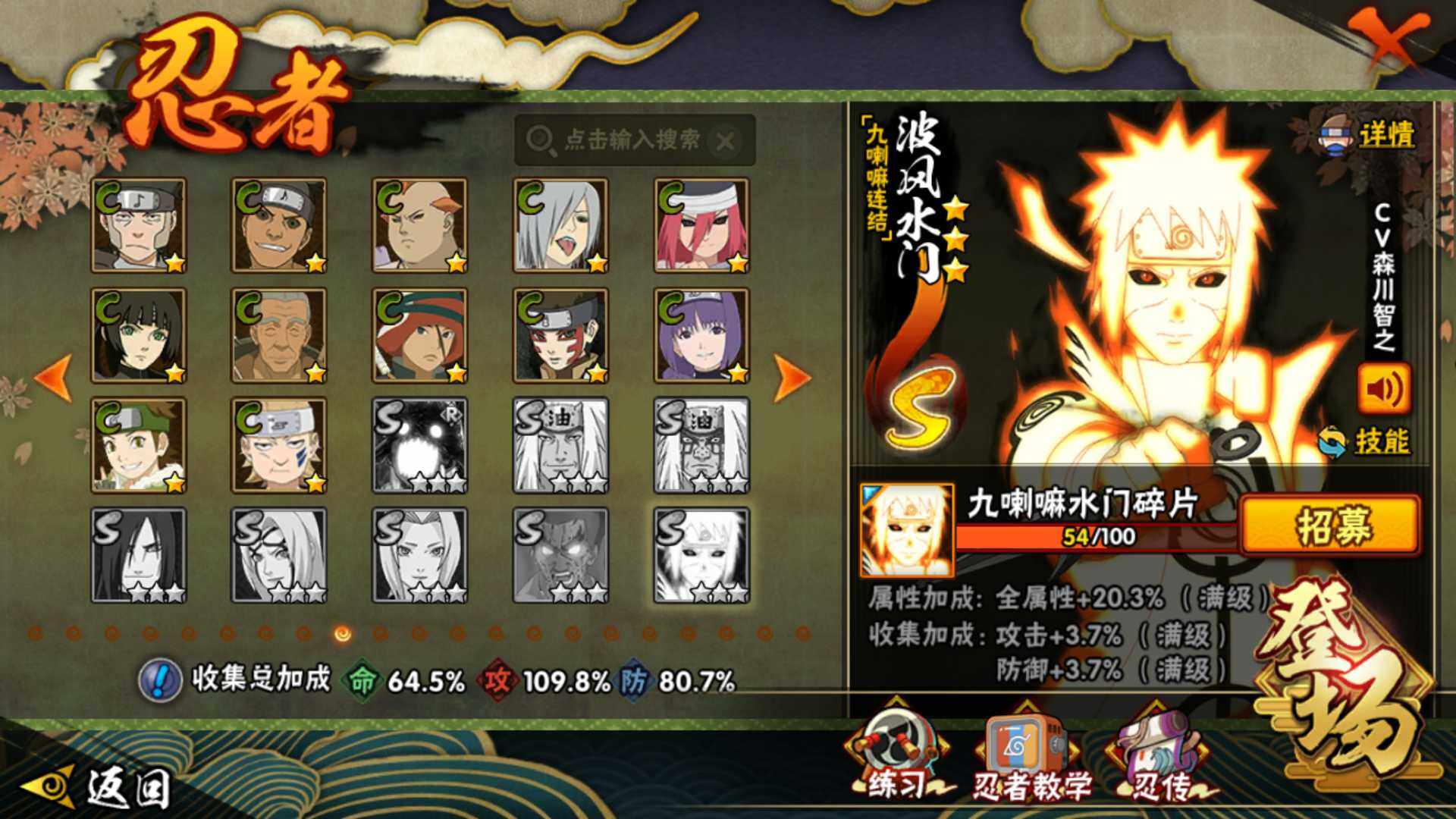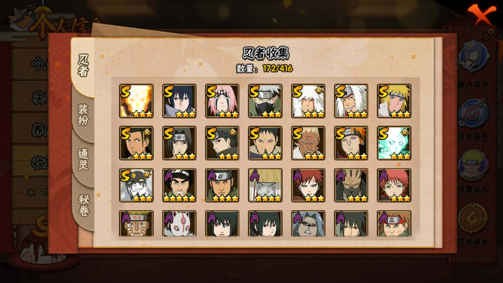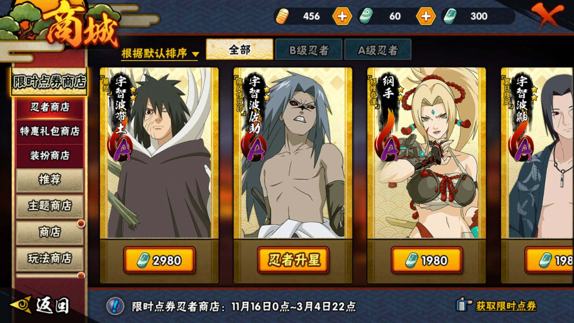 【S级忍者】:春野樱「忍界大战」(3星),宇智波带土「忍界大战」(3星),艾「忍界大战」(3星),宇智波鼬「须佐能乎」(3星),宇智波止水「须佐能乎」(3星),旗木卡卡西「须佐能乎」(3星),千手柱间「木叶创立」(3星),自来也「舞之豪杰」(3星),自来也「传说中的三忍」(3星),波风水门(3星),漩涡鸣人「九喇嘛连结」(3星),佩恩「天道」(3星),宇智波佐助「永恒万花筒」(3星),大筒木桃式(3星),大筒木舍人「最终章」(3星)
