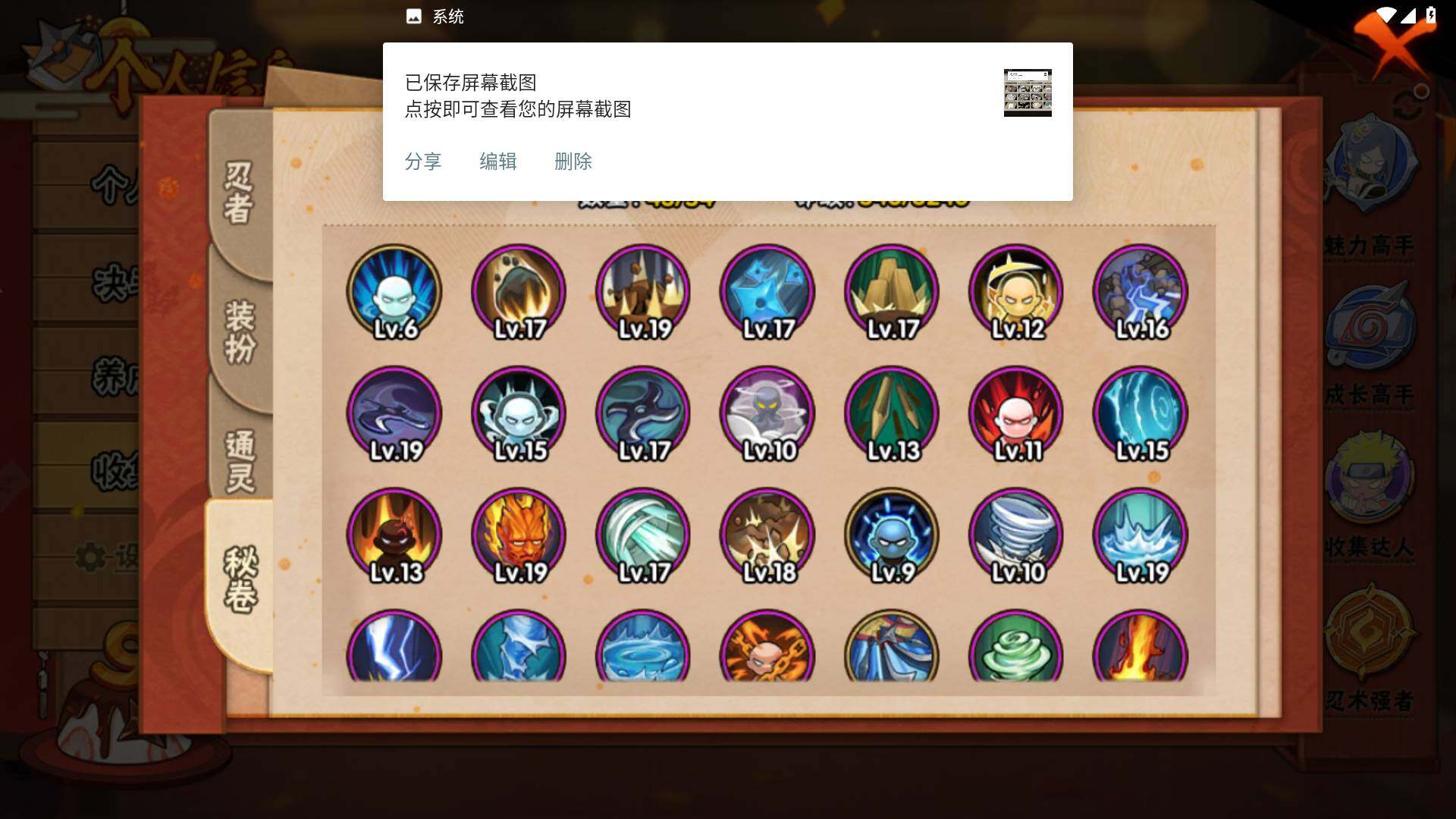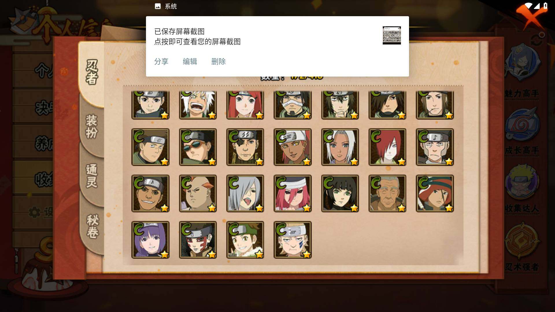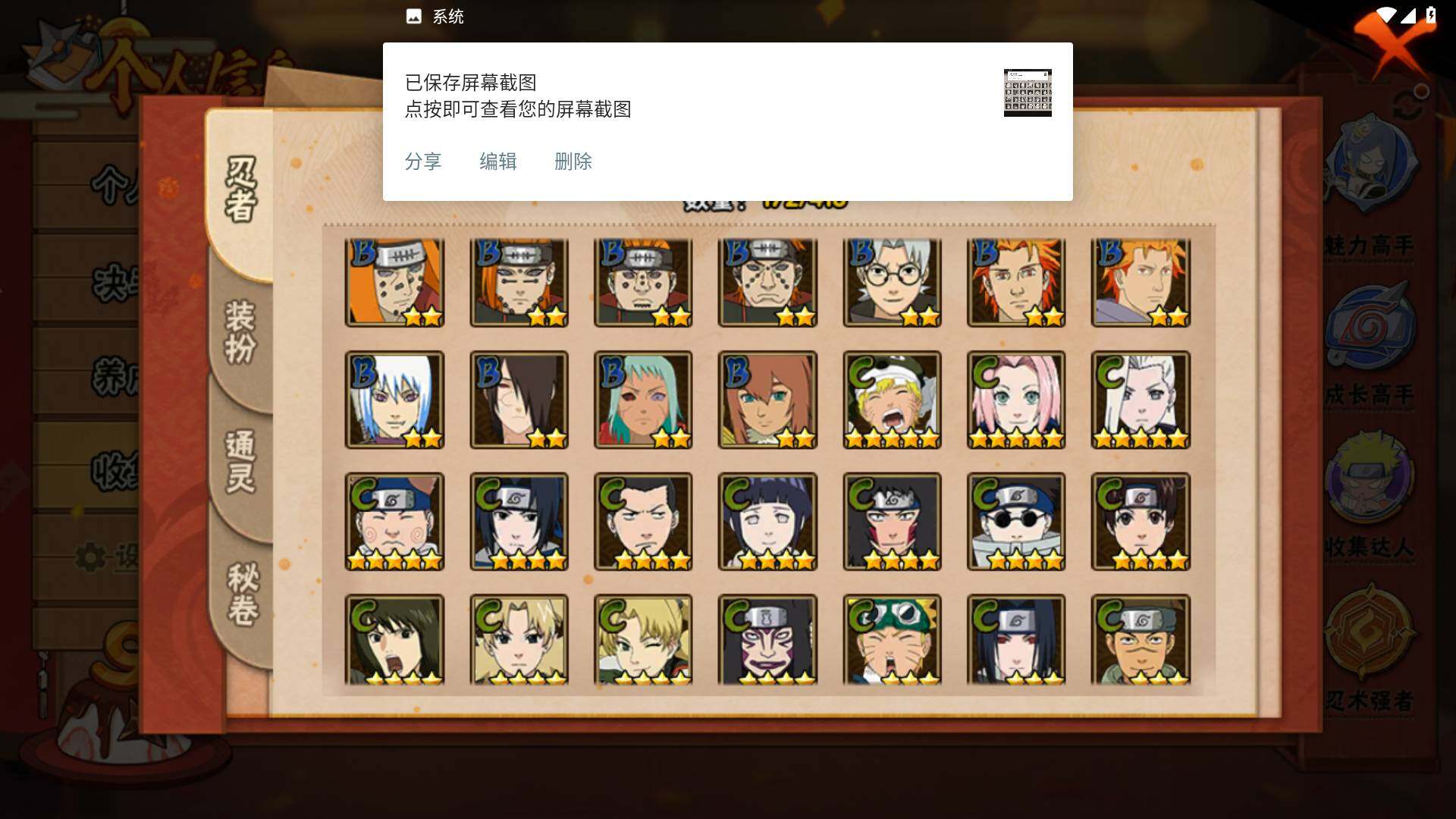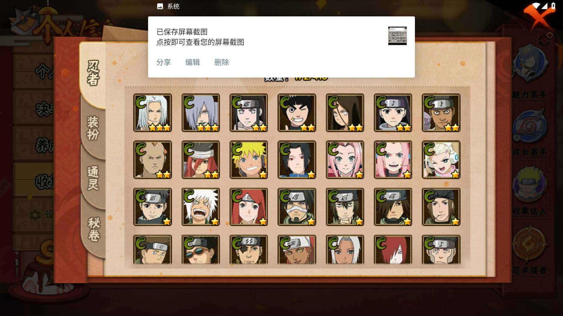 【S级忍者】:春野樱「忍界大战」(3星),宇智波带土「忍界大战」(3星),艾「忍界大战」(3星),宇智波鼬「须佐能乎」(3星),宇智波止水「须佐能乎」(3星),旗木卡卡西「须佐能乎」(3星),千手柱间「木叶创立」(3星),自来也「舞之豪杰」(3星),自来也「传说中的三忍」(3星),波风水门(3星),漩涡鸣人「九喇嘛连结」(3星),佩恩「天道」(3星),宇智波佐助「永恒万花筒」(3星),大筒木桃式(3星),大筒木舍人「最终章」(3星)