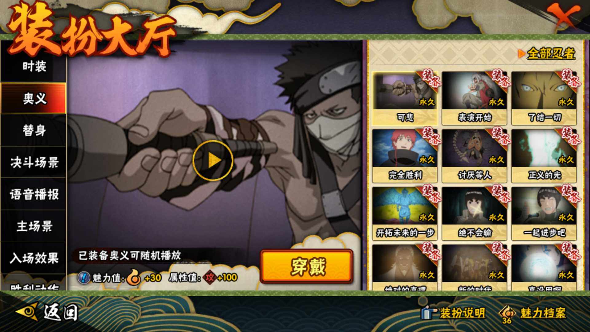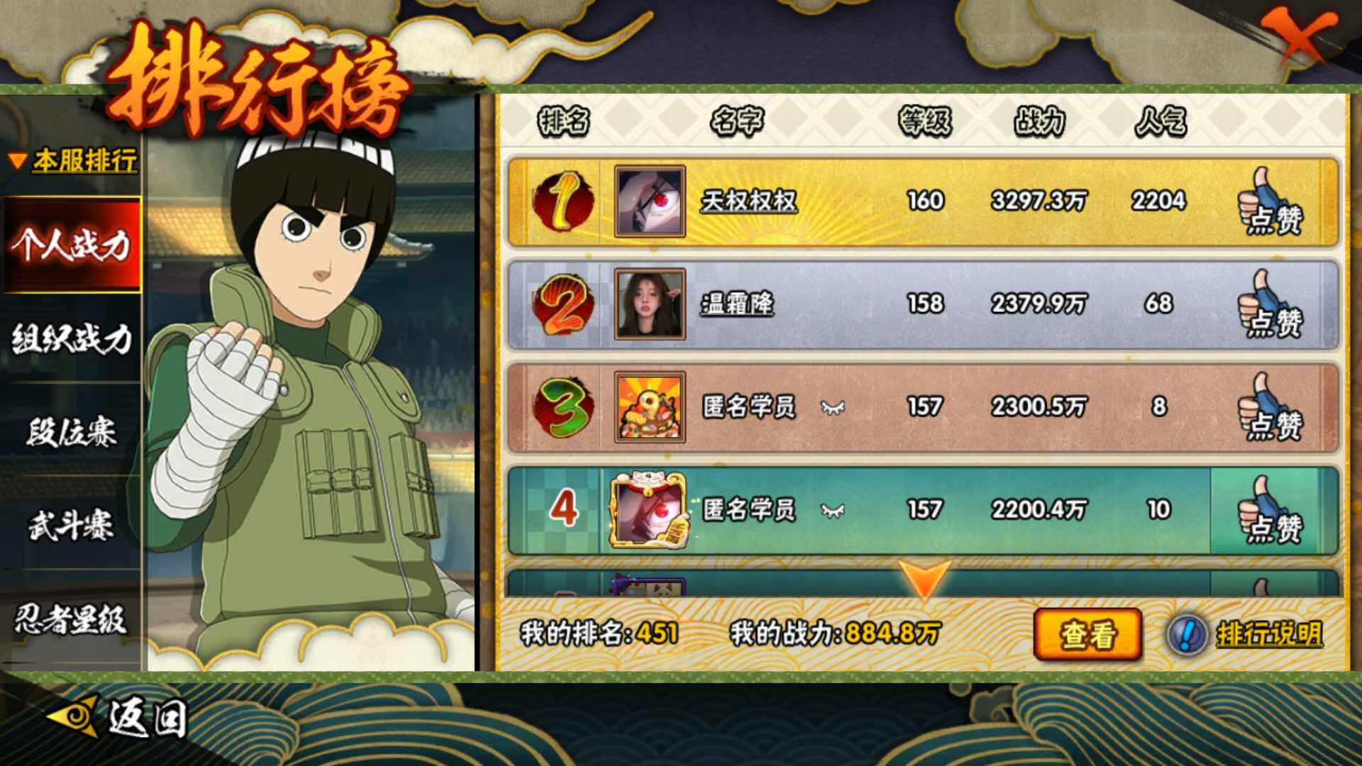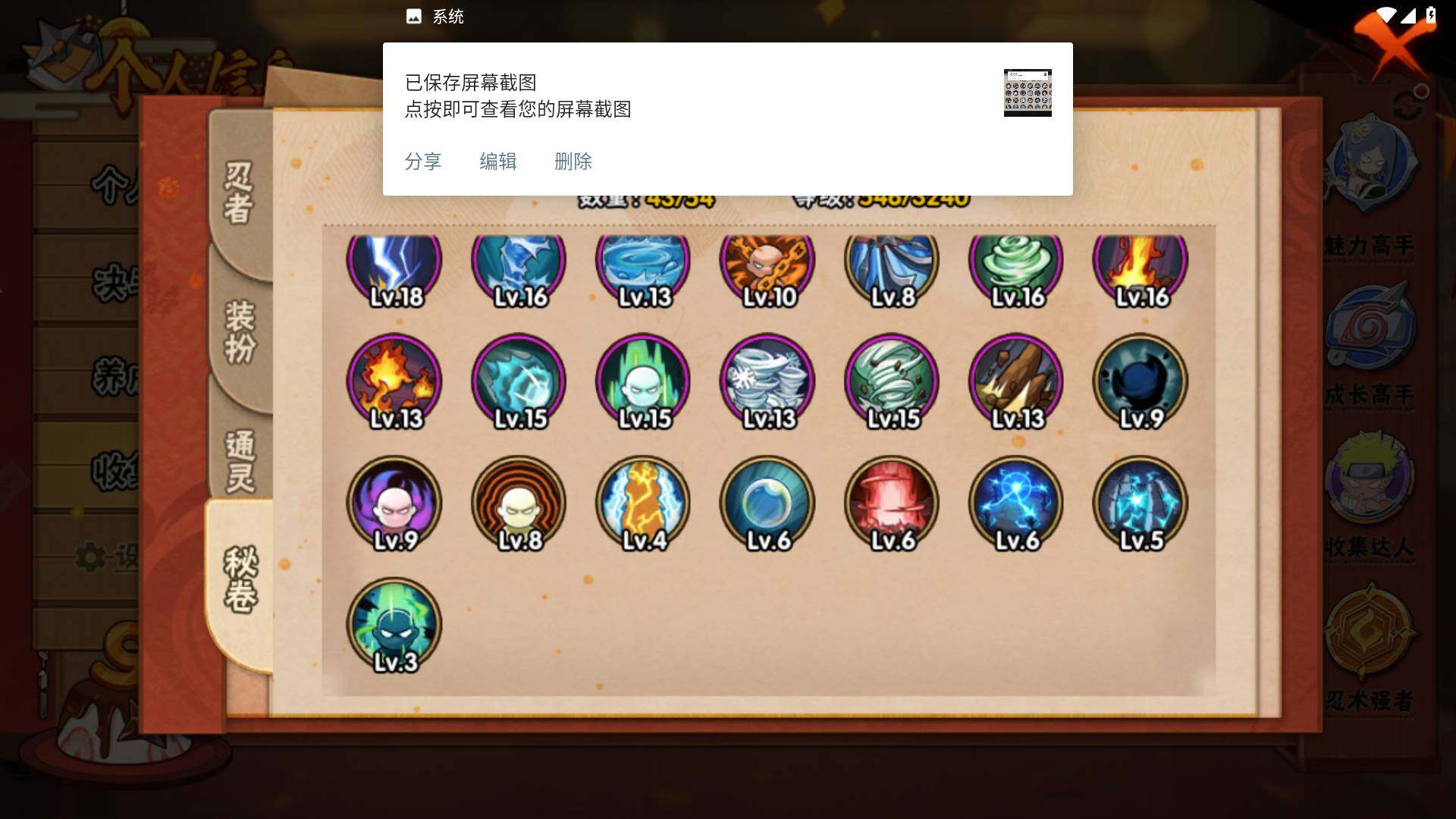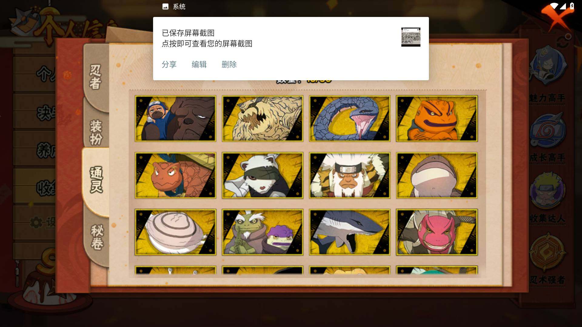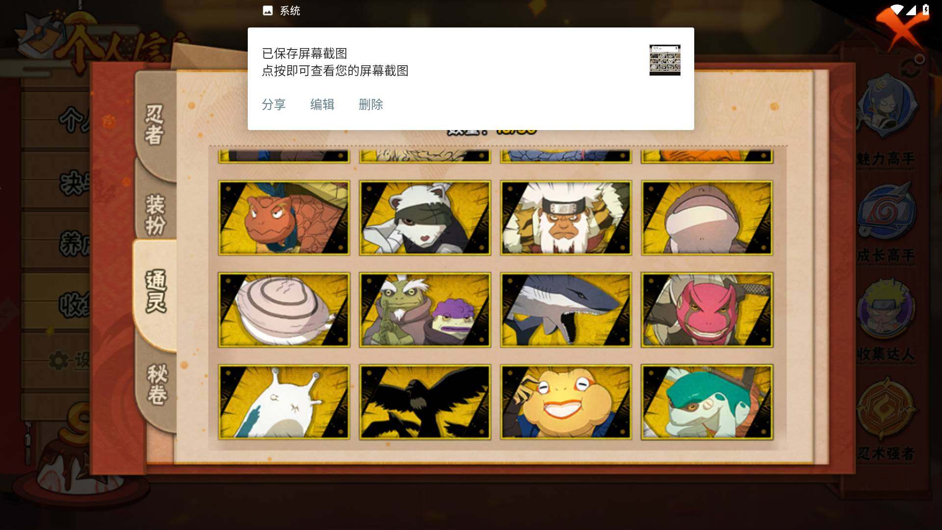 【S级忍者】:春野樱「忍界大战」(3星),宇智波带土「忍界大战」(3星),艾「忍界大战」(3星),宇智波鼬「须佐能乎」(3星),宇智波止水「须佐能乎」(3星),旗木卡卡西「须佐能乎」(3星),千手柱间「木叶创立」(3星),自来也「舞之豪杰」(3星),自来也「传说中的三忍」(3星),波风水门(3星),漩涡鸣人「九喇嘛连结」(3星),佩恩「天道」(3星),宇智波佐助「永恒万花筒」(3星),大筒木桃式(3星),大筒木舍人「最终章」(3星)
