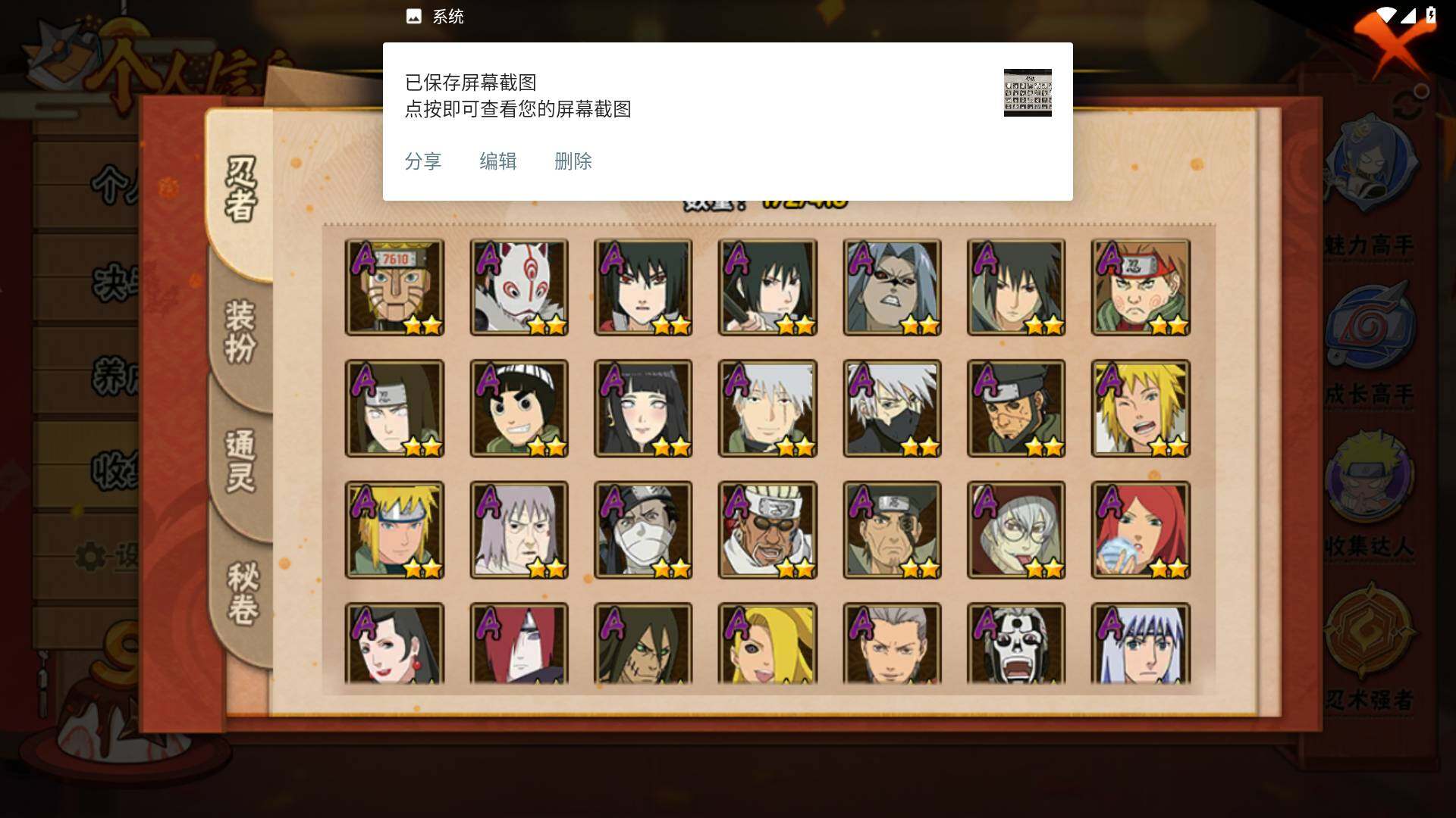 【A级忍者】:长门「青年」(2星),波风水门「青年」(2星),波风水门「新春限定」(2星),达鲁伊「博人传」(2星),迪达拉「秽土转生」(2星),奇拉比(2星),飞段(2星),飞段「死司凭血」(2星),干柿鬼鲛(4星),漩涡博人「桃式显现」(2星),机械鸣人「初始形态」(2星),迈特凯(5星),旗木卡卡西「万花筒写轮眼」(2星),旗木卡卡西「幻之真容」(2星),桃地再不斩(2星),我爱罗「疾风传」(3星),蝎(3星),蝎「绯流琥」(3星),角都「秽土转生」(2星),猿飞阿斯玛(4星),猿飞阿斯玛「秽土转生」(2星),宇智波佐助「须佐能乎」(2星),宇智波佐助「疾风传咒印」(2星),宇智波佐助「万花筒写轮眼」(2星),药师兜「半蛇斗篷」(2星),日向宁次「忍界大战」(2星),日向雏田「最终章」(2星),长十郎「六代目水影」(2星),神秘面具男「忍者之路」(2星),李洛克「忍界大战」(2星),黑土「博人传」(2星),秋道丁次「忍界大战」(2星),千代「近松十人卫」(2星),神农「羁绊」(2星),土台「忍界大战」(2星),不缘(2星),不风(2星),加藤断(2星),宇智波泉奈(2星)【二次: 不可二次实名】
