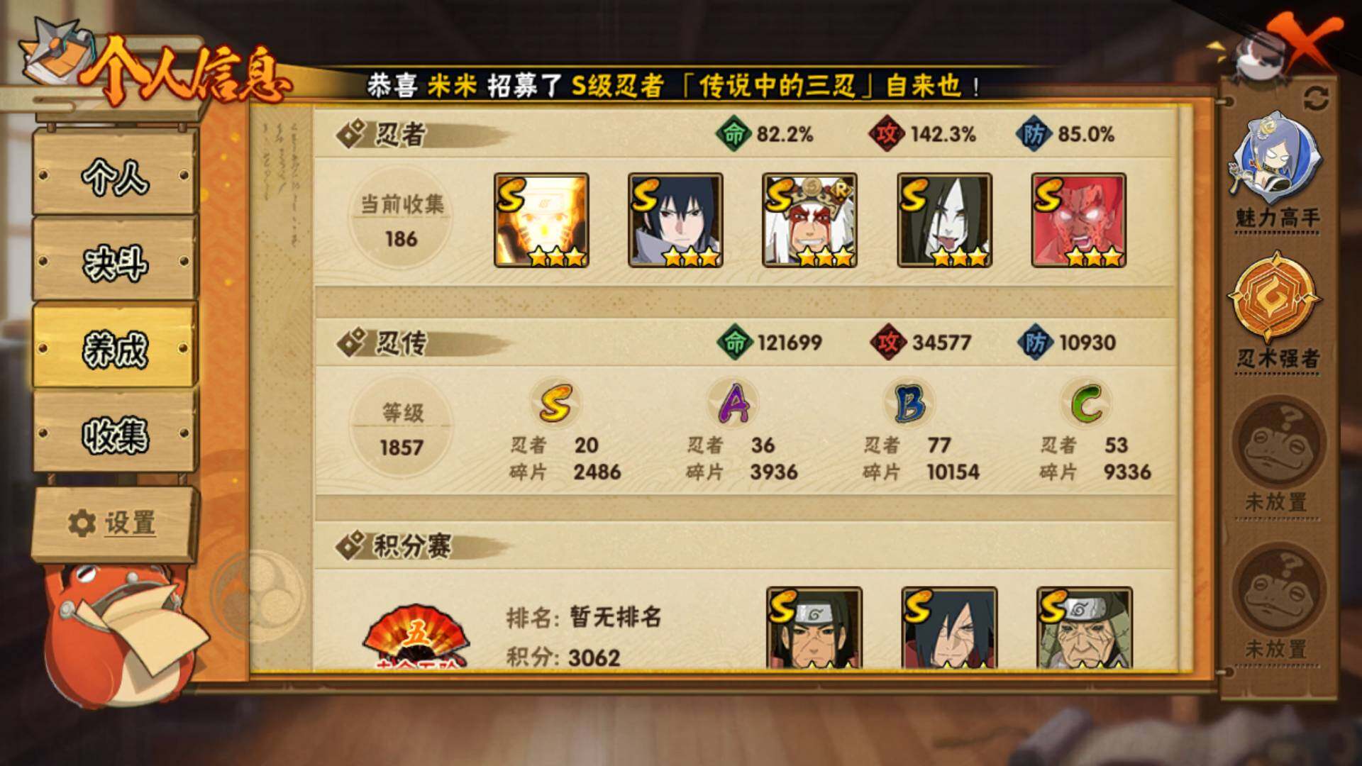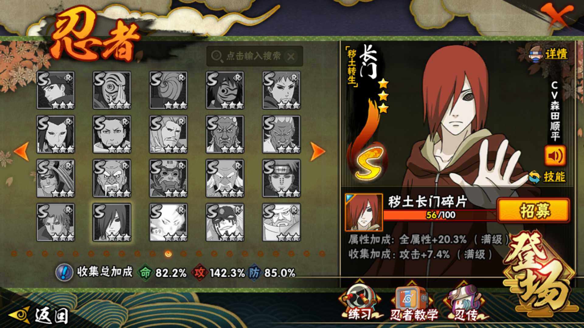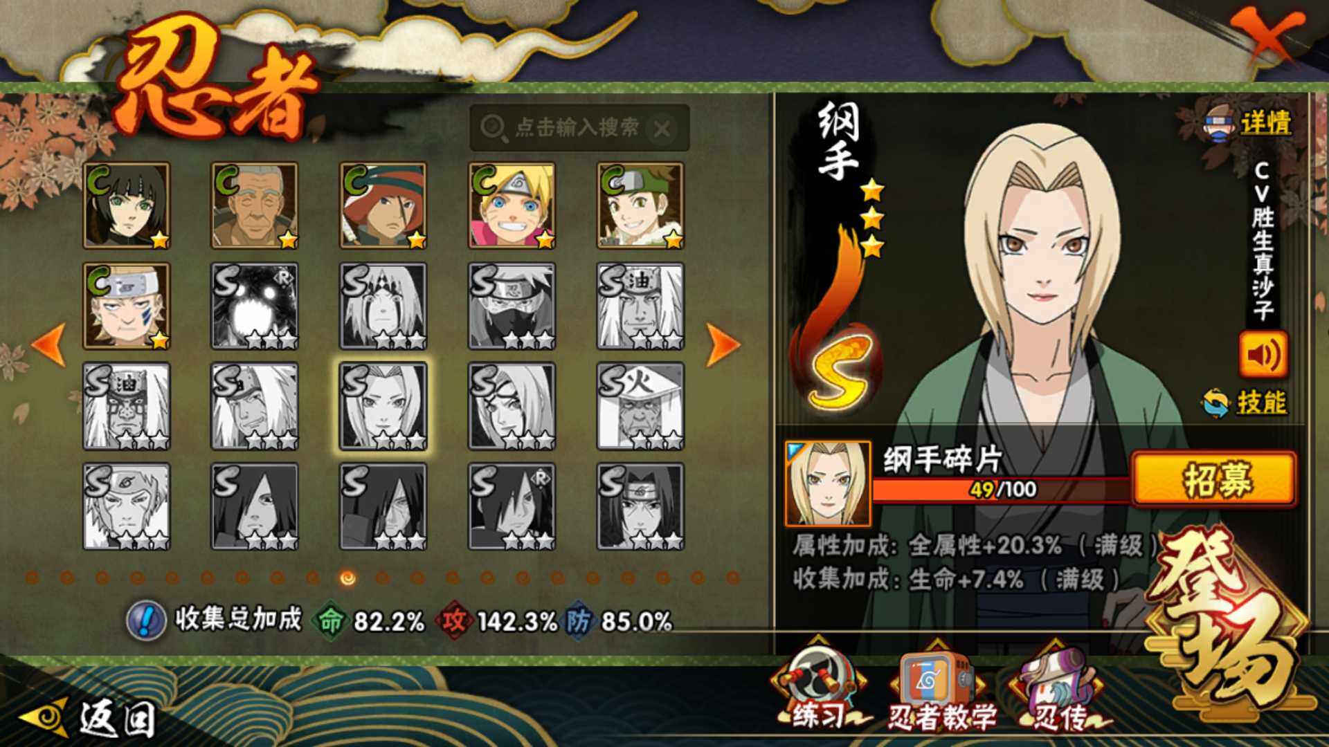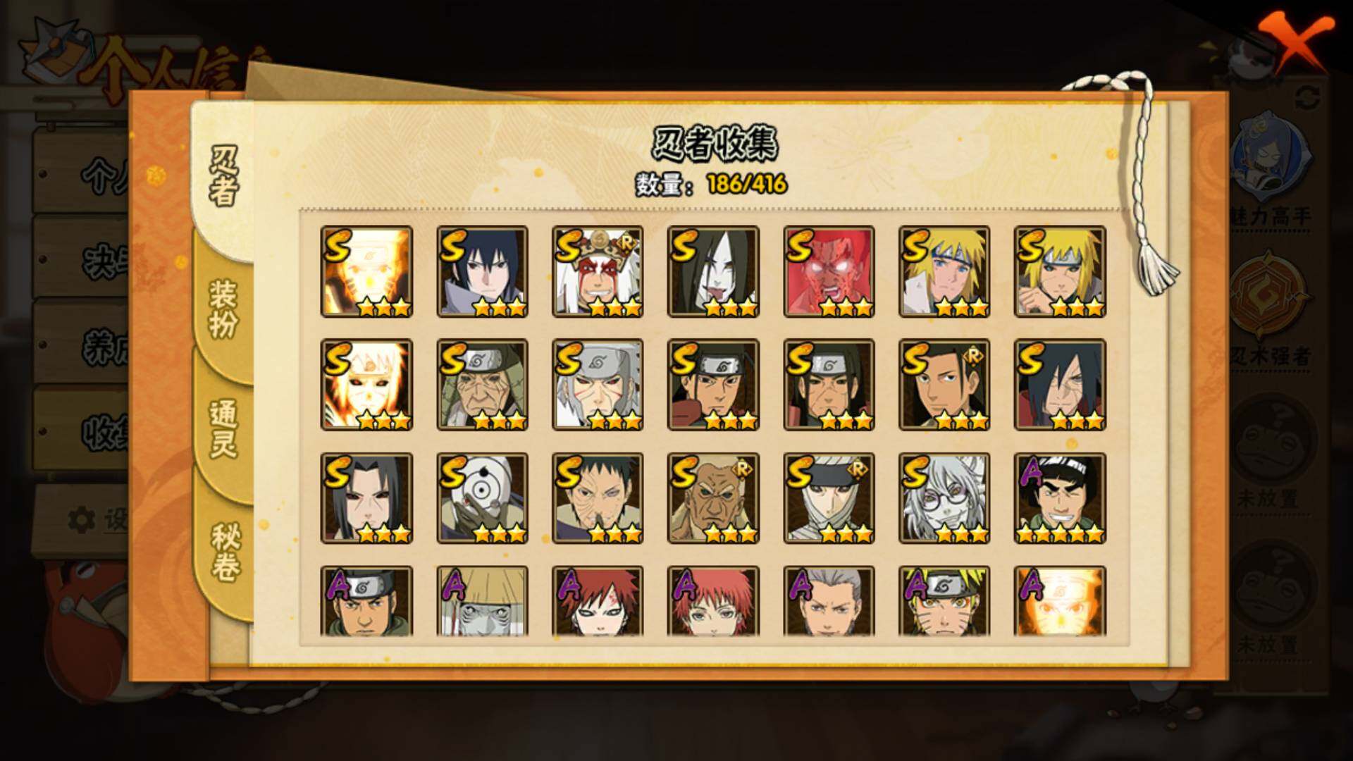 【S级忍者】:猿飞日斩「秽土转生」(3星),波风水门「秽土转生」(3星),千手扉间「秽土转生」(3星),千手柱间「秽土转生」(3星),宇智波鼬「秽土转生」(3星),宇智波斑「秽土转生·解」(3星),宇智波带土「忍界大战」(3星),千手柱间「木叶创立」(3星),无「二代目土影」(3星),艾「三代目雷影」(3星),自来也「舞之豪杰」(3星),大蛇丸(3星),千手柱间(3星),波风水门(3星),药师兜「仙人模式」(3星),漩涡鸣人「九喇嘛连结」(3星),迈特凯「死门」(3星),宇智波佐助「永恒万花筒」(3星),宇智波斑 「白面具」(3星宇智波斑「白面具」),波风水门「九喇嘛连结」(3星)