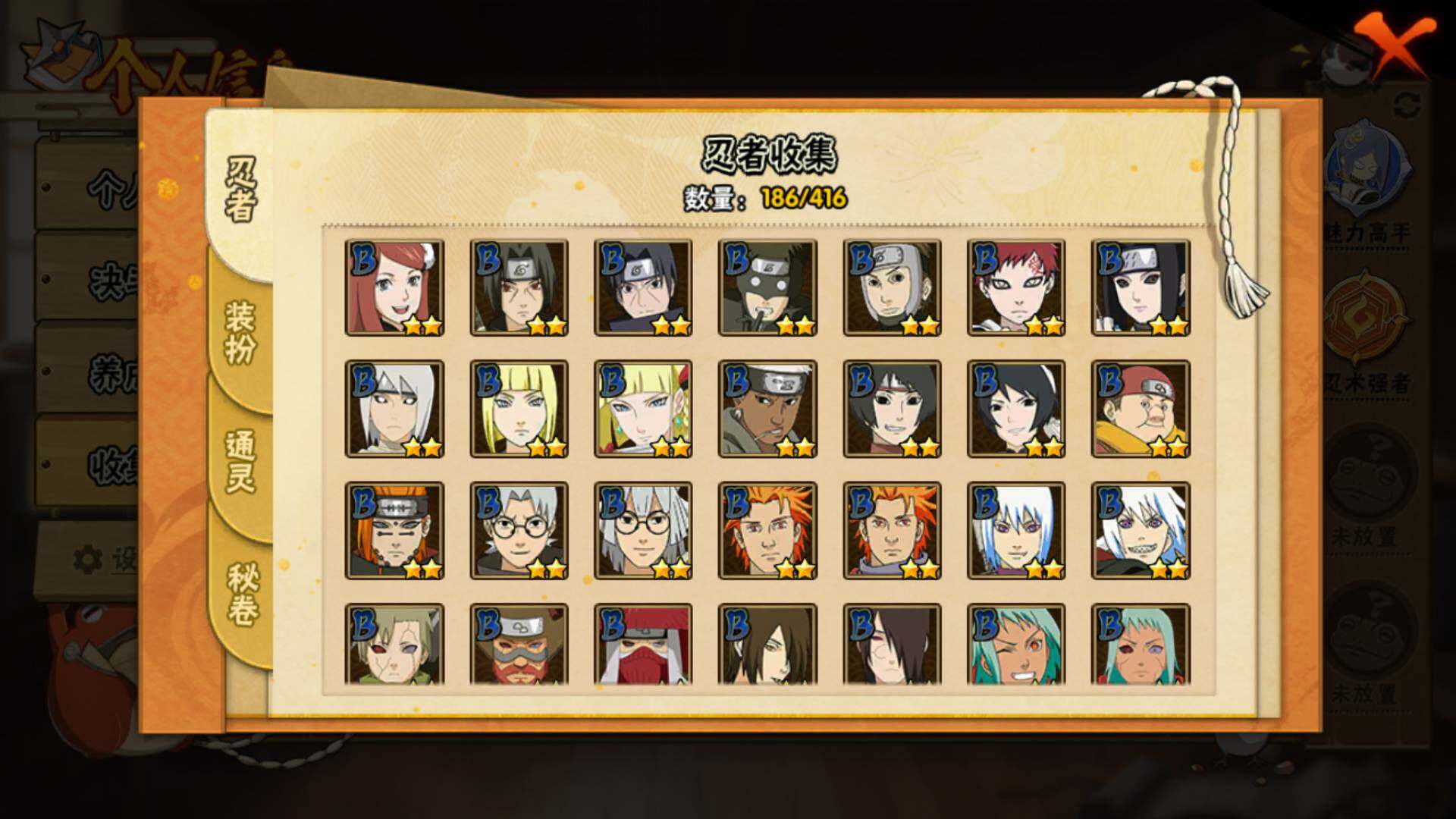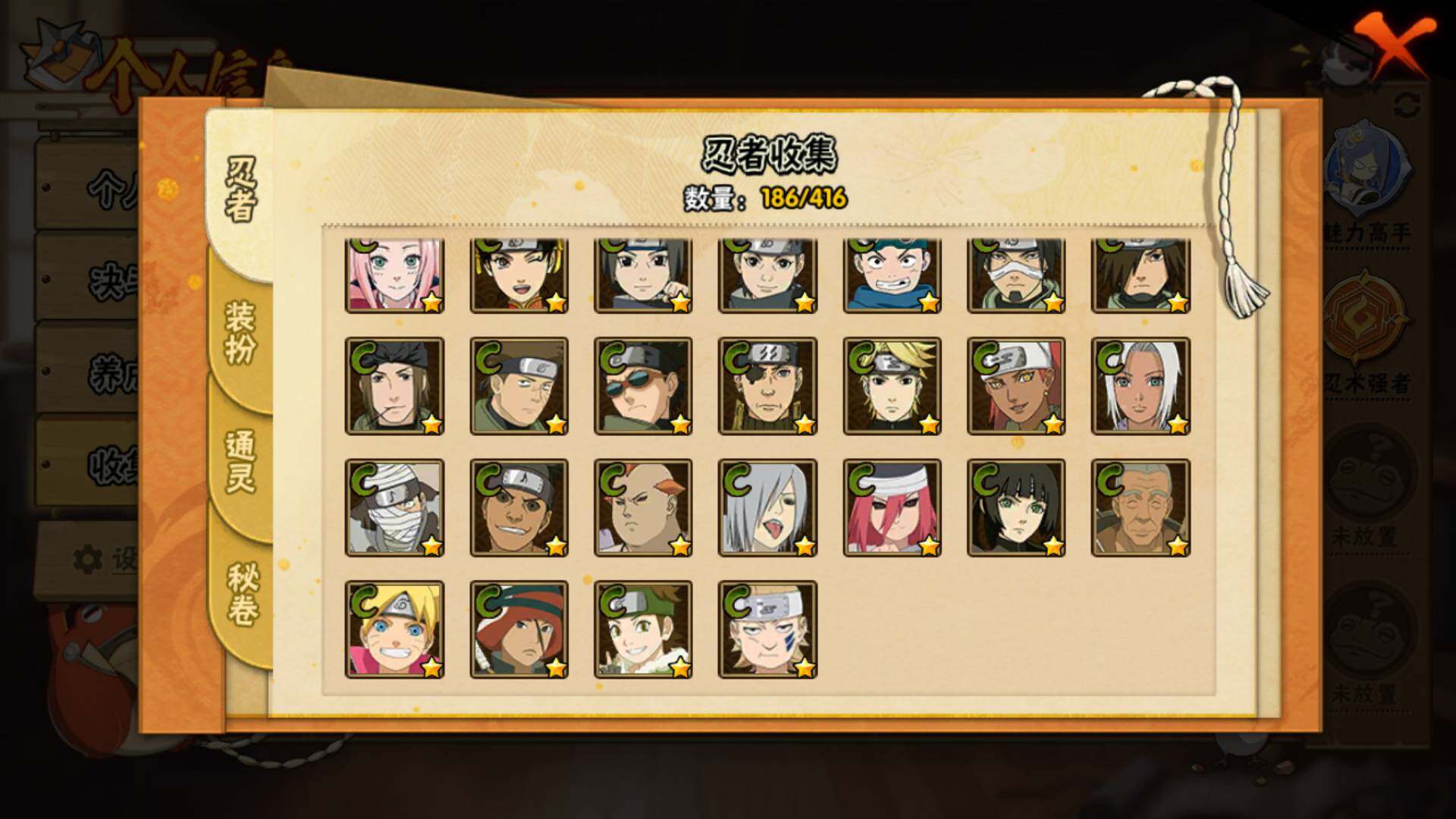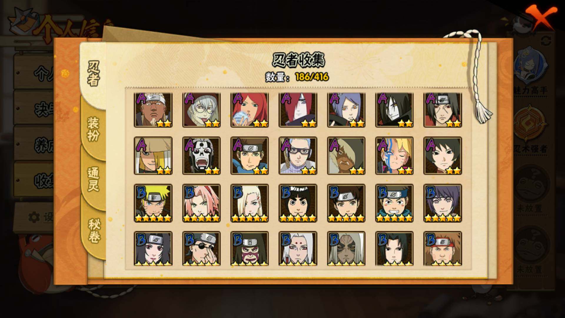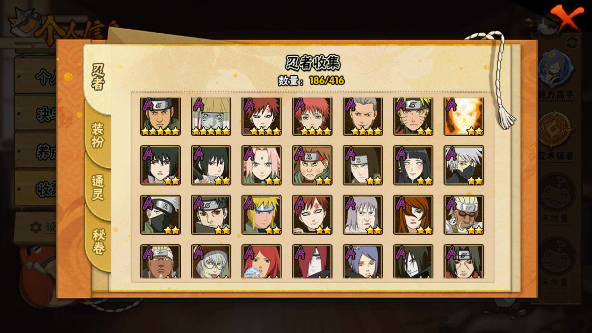 【A级忍者】:艾「青年」(2星),长门「青年」(2星),波风水门「青年」(2星),达鲁伊「博人传」(2星),迪达拉(2星),大蛇丸「晓」(2星),奇拉比「忍界大战」(2星),飞段(4星),飞段「死司凭血」(2星),干柿鬼鲛(5星),漩涡博人「桃式显现」(2星),漩涡鸣人「仙人模式」(2星),漩涡鸣人「九尾查克拉」(2星),迈特凯(5星),旗木卡卡西「忍界大战」(2星),旗木卡卡西「万花筒写轮眼」(2星),我爱罗「疾风传」(4星),我爱罗「忍界大战」(2星),蝎(4星),小南(2星),猿飞阿斯玛(5星),宇智波止水(2星),宇智波鼬(2星),宇智波佐助「须佐能乎」(2星),宇智波佐助「万花筒写轮眼」(2星),药师兜「半蛇斗篷」(2星),照美冥「五代目水影」(2星),日向宁次「忍界大战」(2星),日向雏田「最终章」(2星),长十郎「六代目水影」(2星),猿飞木叶丸「博人传」(2星),黑土「博人传」(2星),春野樱「百豪」(2星),秋道丁次「忍界大战」(2星),千代「近松十人卫」(2星),不风(2星)【二次: 不可二次实名】