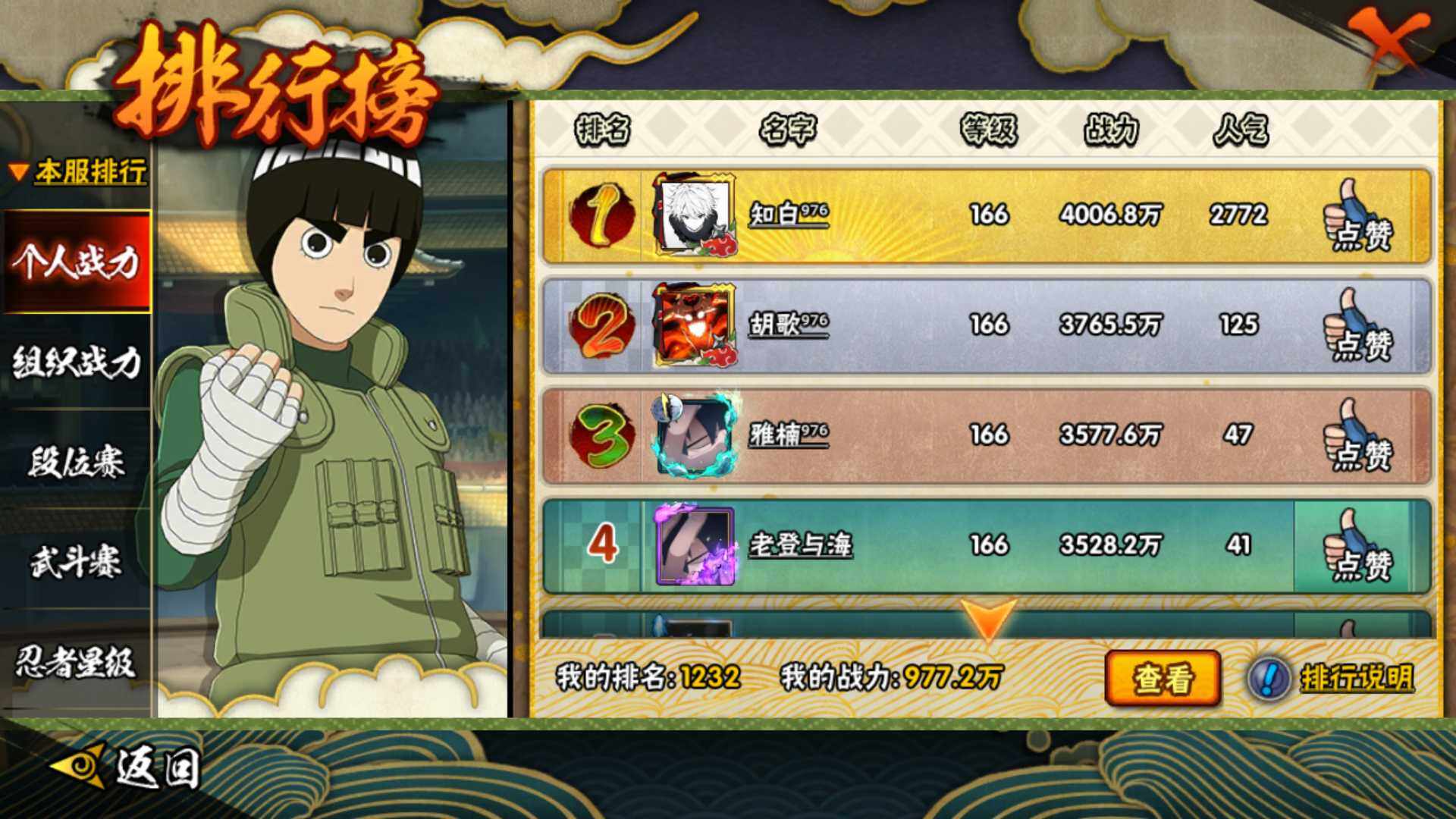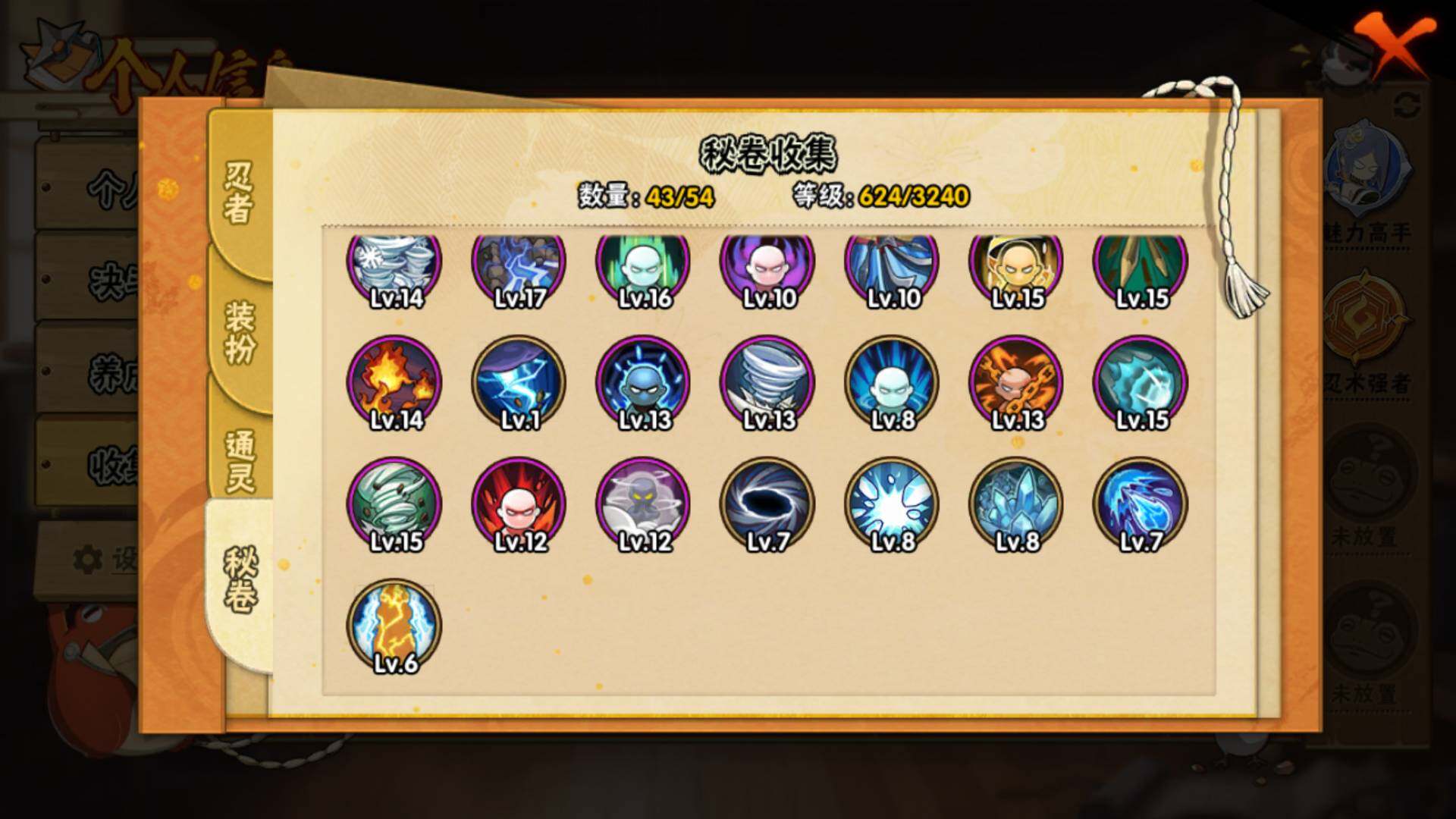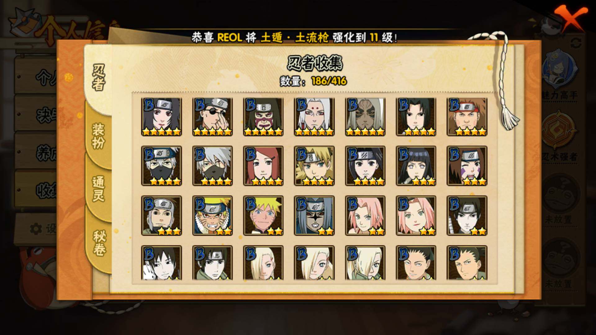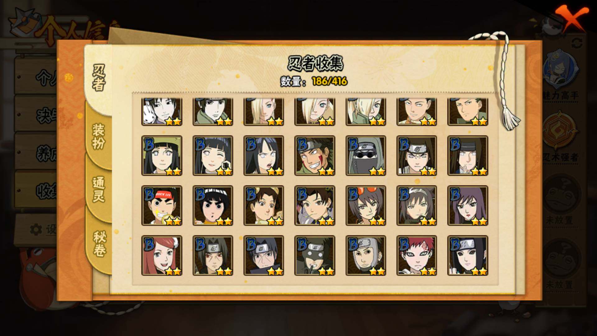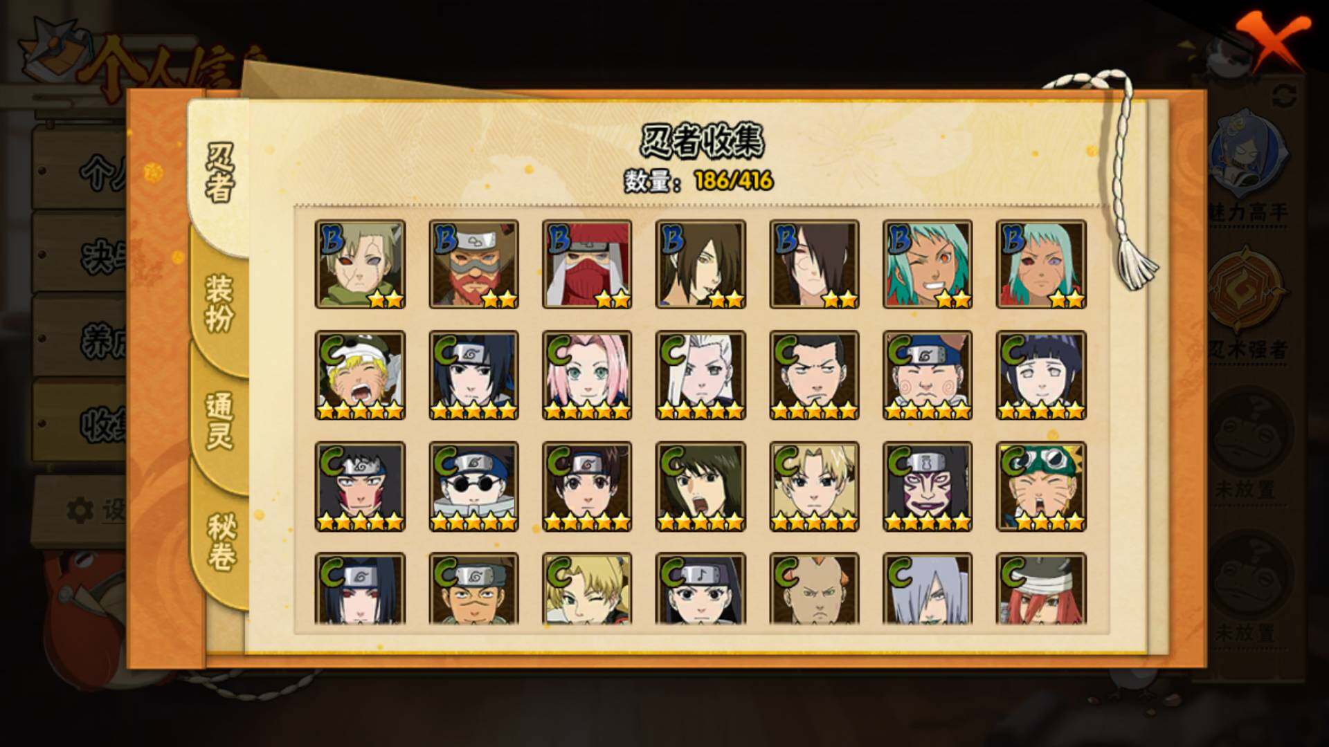 【A级忍者】:艾「青年」(2星),长门「青年」(2星),波风水门「青年」(2星),达鲁伊「博人传」(2星),迪达拉(2星),大蛇丸「晓」(2星),奇拉比「忍界大战」(2星),飞段(4星),飞段「死司凭血」(2星),干柿鬼鲛(5星),漩涡博人「桃式显现」(2星),漩涡鸣人「仙人模式」(2星),漩涡鸣人「九尾查克拉」(2星),迈特凯(5星),旗木卡卡西「忍界大战」(2星),旗木卡卡西「万花筒写轮眼」(2星),我爱罗「疾风传」(4星),我爱罗「忍界大战」(2星),蝎(4星),小南(2星),猿飞阿斯玛(5星),宇智波止水(2星),宇智波鼬(2星),宇智波佐助「须佐能乎」(2星),宇智波佐助「万花筒写轮眼」(2星),药师兜「半蛇斗篷」(2星),照美冥「五代目水影」(2星),日向宁次「忍界大战」(2星),日向雏田「最终章」(2星),长十郎「六代目水影」(2星),猿飞木叶丸「博人传」(2星),黑土「博人传」(2星),春野樱「百豪」(2星),秋道丁次「忍界大战」(2星),千代「近松十人卫」(2星),不风(2星)【二次: 不可二次实名】