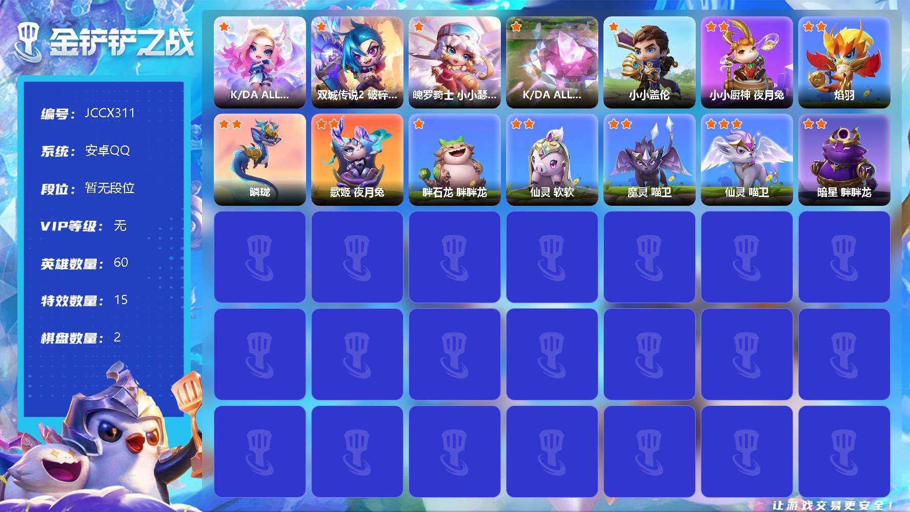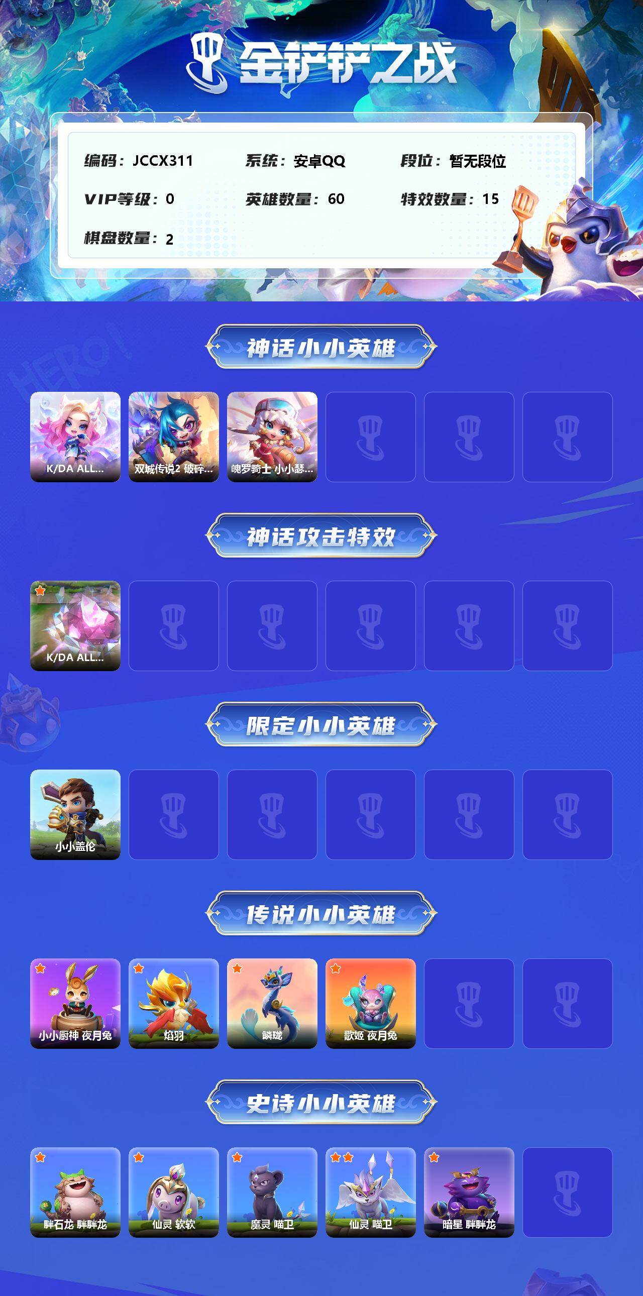 【JCCX311】3神话/60小小英雄/2棋盘/K/DA ALL OUT 小小阿狸/双城传说2 破碎者 小小金克丝/魄罗骑士 小小瑟庄妮/K/DA ALL OUT 小小阿狸(专属)/超究极微光飞弹/小小盖伦/小小厨神 夜月兔/焰羽/鳞珑/歌姬 夜月兔/胖石龙 胖胖龙/仙灵 软软/魔灵 喵卫/仙灵 喵卫/暗星 胖胖龙【按系统: 安卓qq】