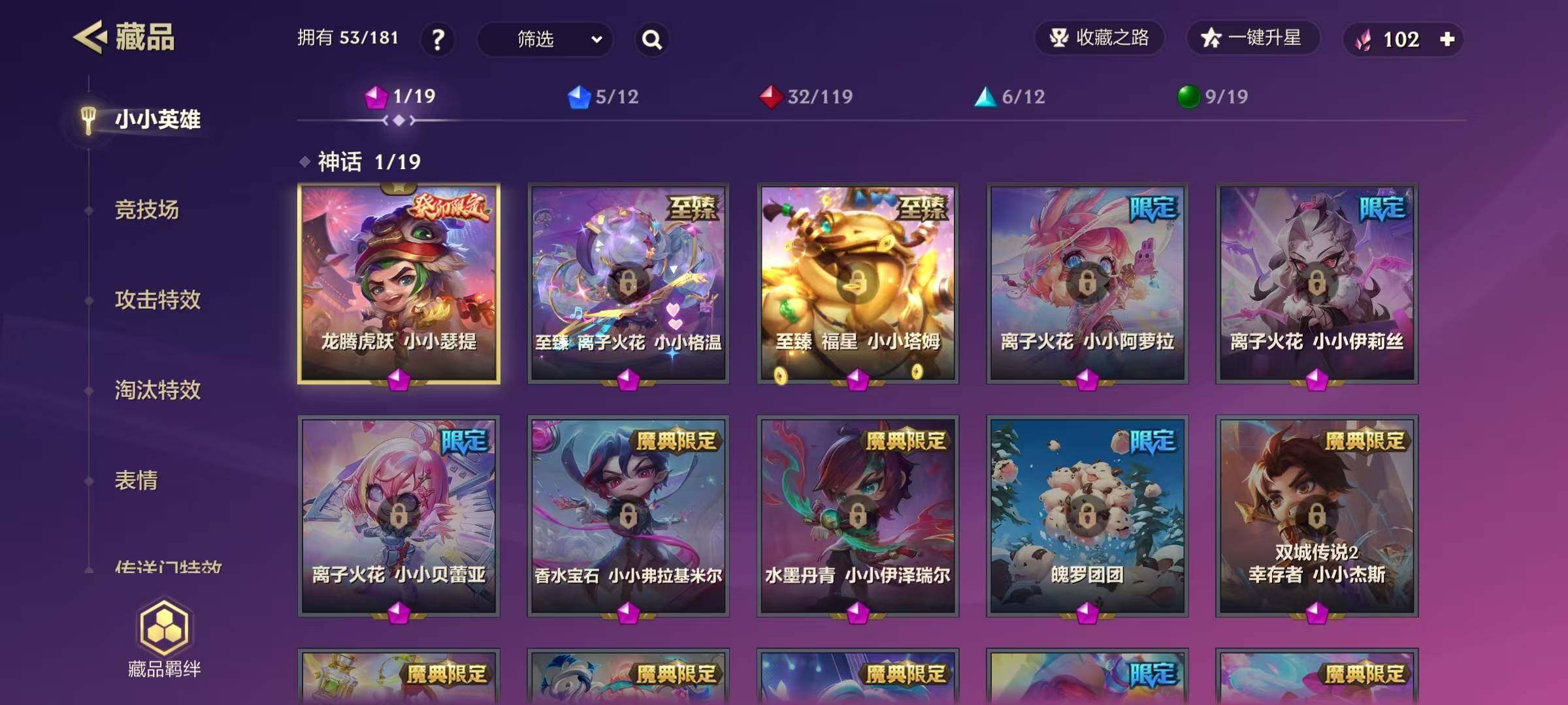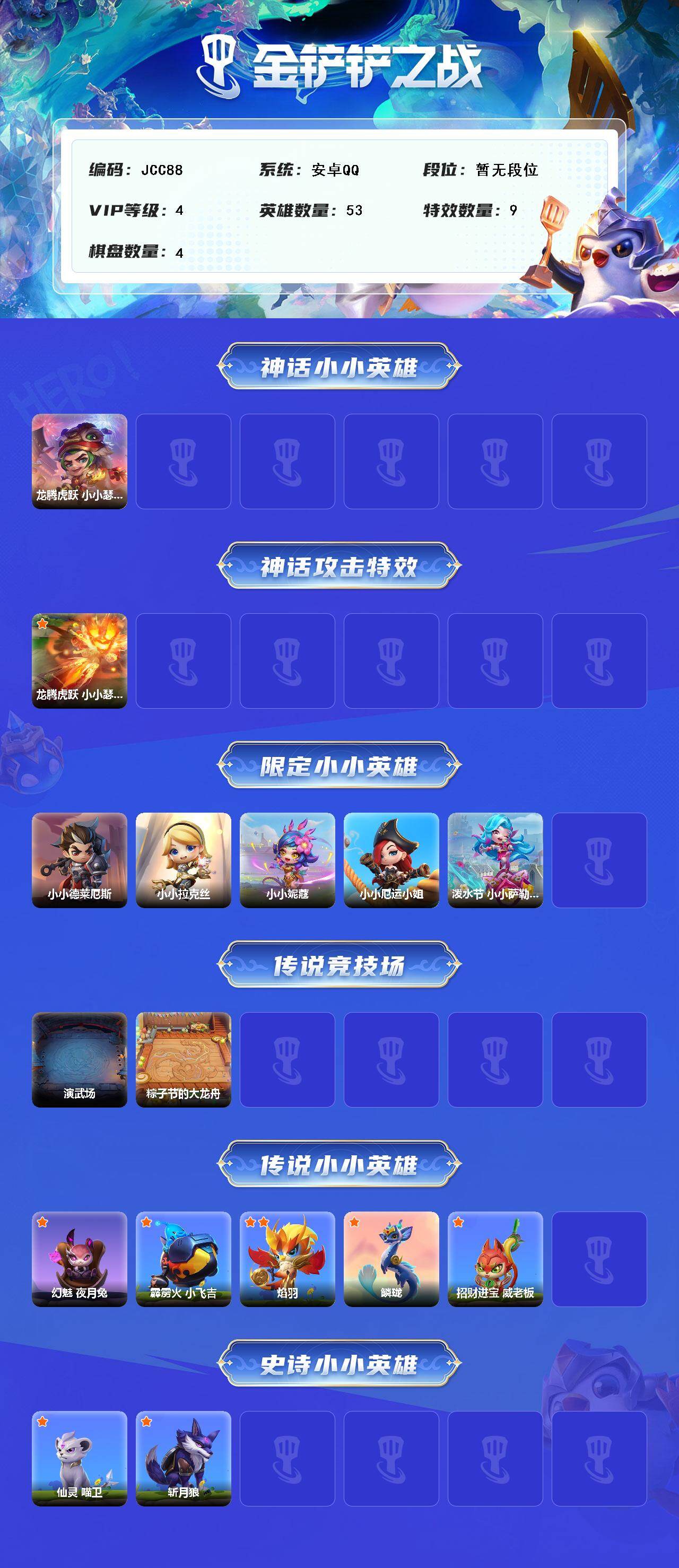 【JCC88】1神话/53小小英雄/4棋盘/龙腾虎跃小小瑟提/龙腾虎跃 小小瑟提(专属)/小小德莱厄斯/小小拉克丝/小小妮蔻/小小厄运小姐/泼水节 小小萨勒芬妮/演武场/粽子节的大龙舟/幻魅 夜月兔/霹雳火 小飞吉/焰羽/鳞珑/招财进宝 威老板/仙灵 喵卫/斩月狼【按系统: 安卓qq】