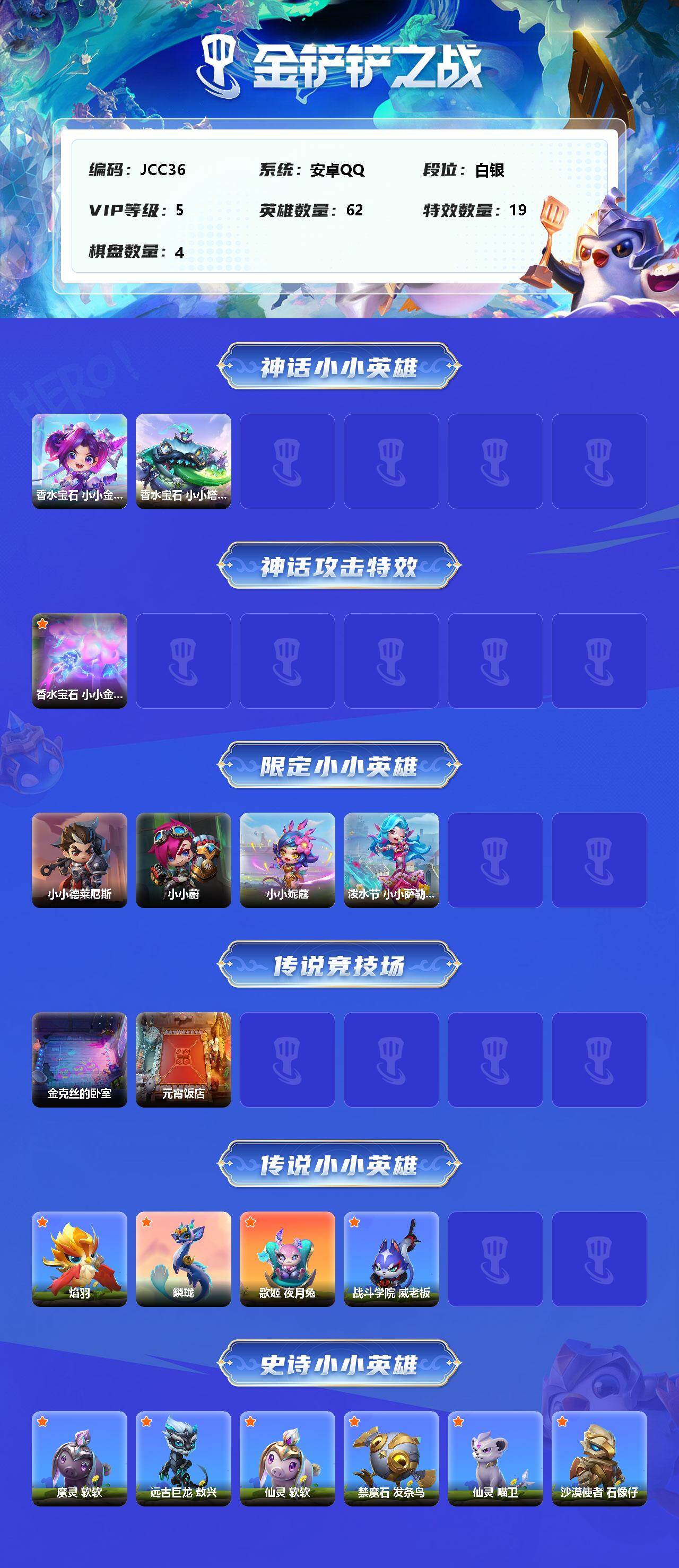 【JCC36】2神话/62小小英雄/4棋盘/香水宝石 小小金克丝/香水宝石 小小塔姆/香水宝石 小小金克丝(专属)/小小德莱厄斯/小小蔚/小小妮蔻/泼水节 小小萨勒芬妮/金克丝的卧室/元宵饭店/焰羽/鳞珑/歌姬 夜月兔/战斗学院 威老板/魔灵 软软/远古巨龙 敖兴/仙灵 软软/禁魔石 发条鸟/仙灵 喵卫/沙漠使者 石像仔【按系统: 安卓qq】