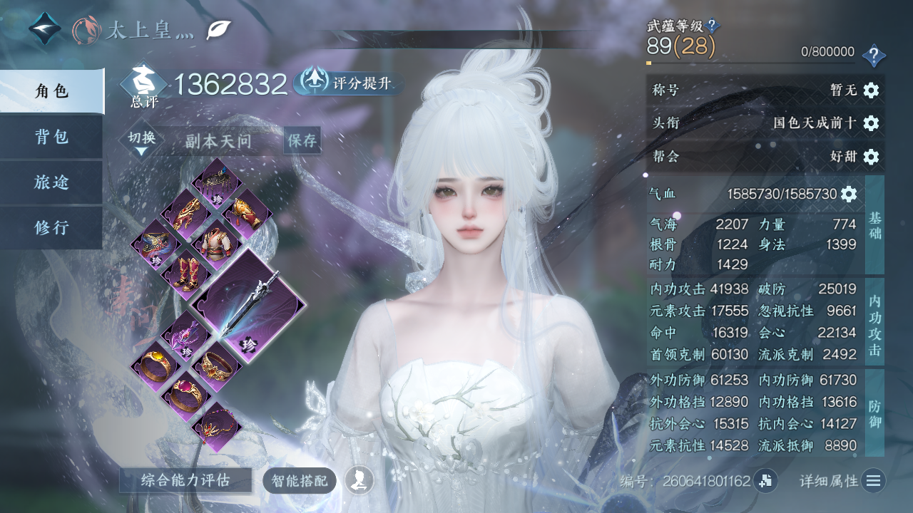 【氪金12W高质量一醉外观号 26高质量自染+转盘头仙瑶+一颗可交易石头有额度 转盘脚印+ 昼宇灵晖 祥瑞兔床 】 战力值136.28 总评136.28 角色等级89 衣品值282580 国色值286290 已用天赏石78 未用天赏石1 天霓染数量28 【无换绑冷却】 【素问】 【女】 【8级】 【一醉轻王侯】 稀有道具4 转盘外观1 天赏外观17 天霓染11 天赏灵宠4 祥瑞坐骑4 商城外观44 配饰5 稀有道具:昼宇灵晖,疾风开浪,万仞碎岳,天赏石; 转盘外观:仙瑶; 天赏外观:裁星谕,幽岚,煦风漫,绛珠,蚀金幻雾,鸾栖,魔韵灵仙,幽蝶语,霓幻浮生,缠梦,霓华,惊焰,青冥曙晖,花楹誓约,水母武器,绝技丹青纵横·龙潭墨云,绝技青丘雪; 天霓染:银菱傣语*1,青羽惊梦*1,云山鹤影*1,苦昼短*1,温语愈心*1,春日序曲*1,凤吟振羽*1,南风知暑*1,糯粽缠青*1,皓雪冰临*1,倾心*1; 天赏灵宠:灵宠·璇玑星,灵宠·冰曜绒,灵宠·羲紫凰,灵宠·天狼星; 祥瑞坐骑:玉霄飞练,奔虹赤,牛奶酥,隐云涧; 商城外观:夜雨倾澜,猩红猎夜,粉蔷曳风,昙月花恋,雾都往事,佛心膳缘,雾蓝星瞳,糖云蜜杏,鎏金夜帷,羽信絮梦,逸夏浮澜,潇湘黛影,雪团云绒,逸夏浮澜,烹椒听雀,青羽惊梦,幽蝶魅影,幻音星缘,暗蔷魅影,音律织光,幽梦逢她,云绣露华,御龙扬旌,云梦萤星,紫霄云旗,血宴风华,岁鳞衔新,跃动心芒,赤焰飞彤,湖岚镜心,温语愈心,星迹梦语,芳汀花影,春日序曲,玄喵夜行,南谯丽影,灵鹿瑶羽,金祷昼梦,金粉绮梦,烽火浮生,似水幽华,皓雪冰临,白灵雪魅,对影邀月; 配饰:娇狐曳,幽月倾梦,天丝织夜,夜阑玄翼,太虚宝册;【职业分类: 素问】
