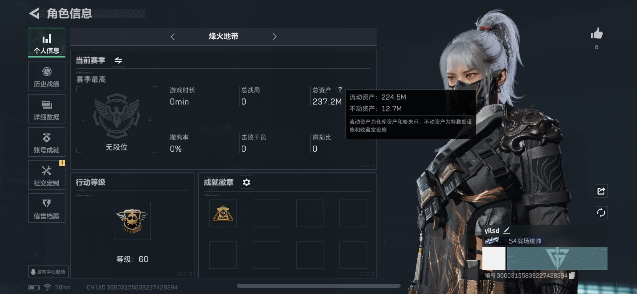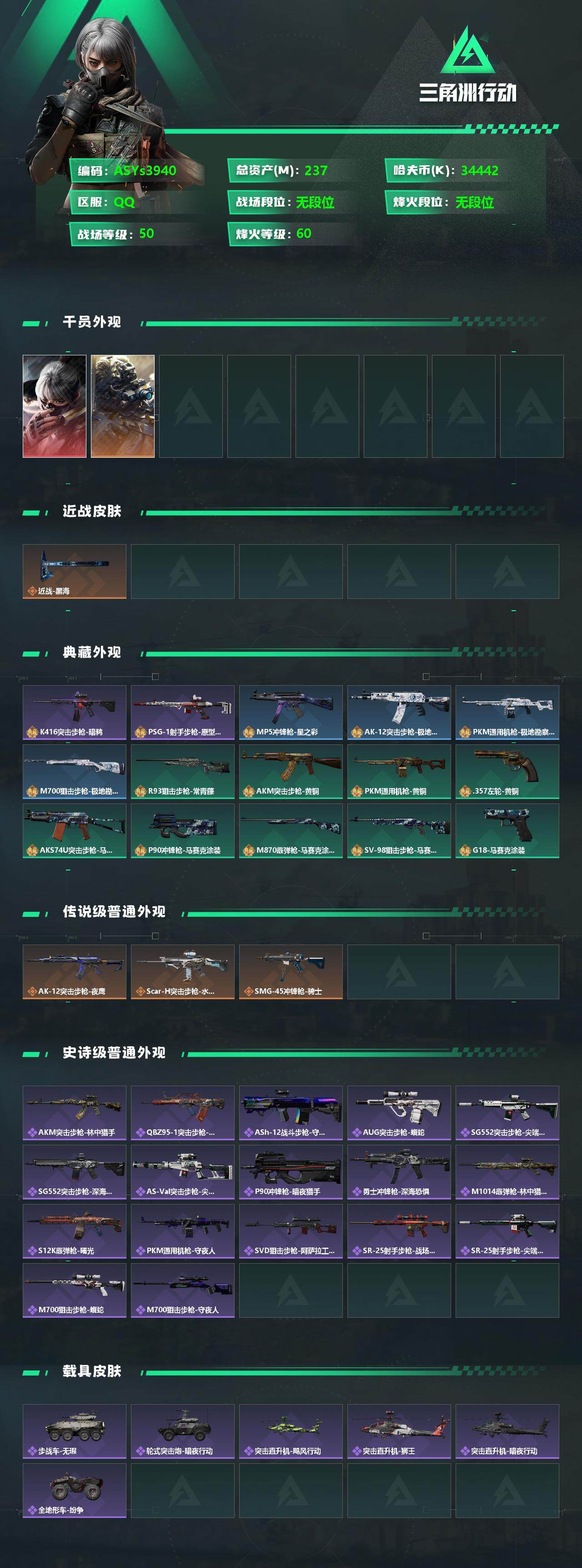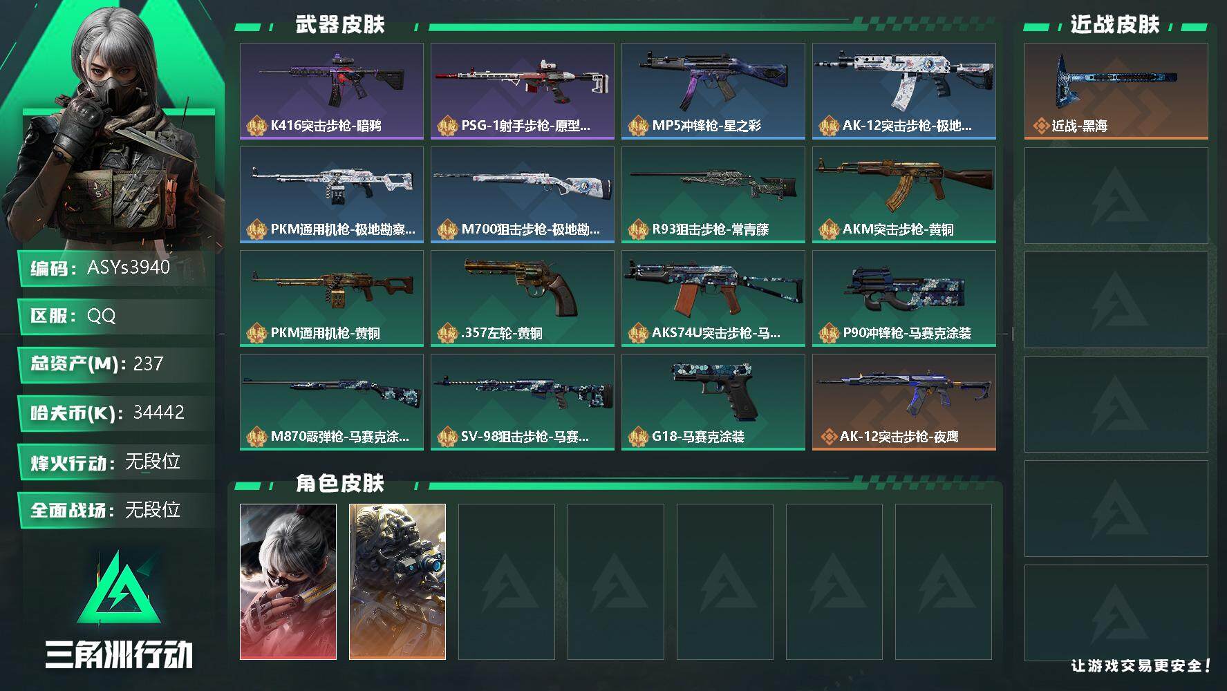 PX_2148293-三端互通】【可二次】ASYs3940-特勤处:仓库7级/训练中心6级/靶场4级-总资产237.2M-哈夫币3444W-烽火等级:60级【勾选了部分账号,详细看图,平台认证商家店铺,保证金商家,安全有保障,性价比超高,永久包赔】