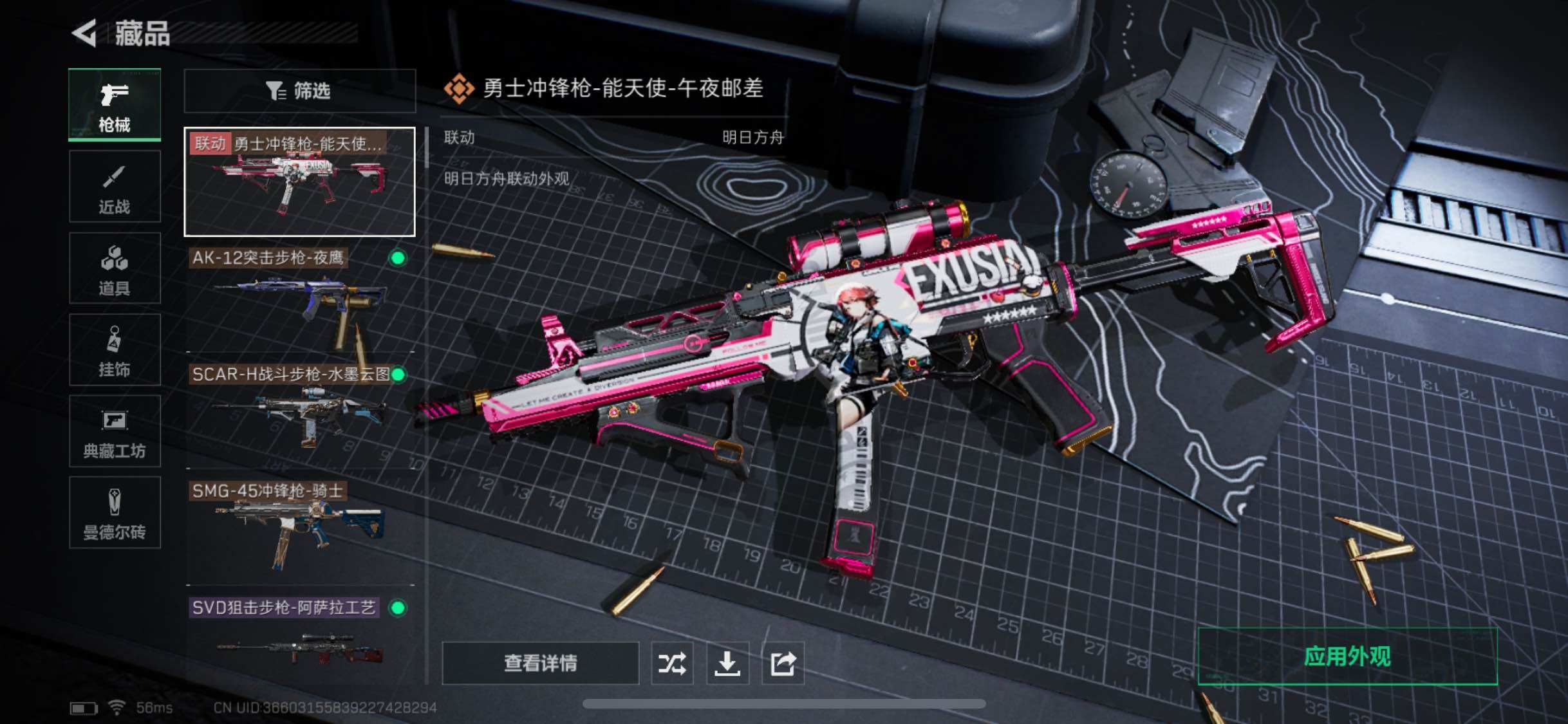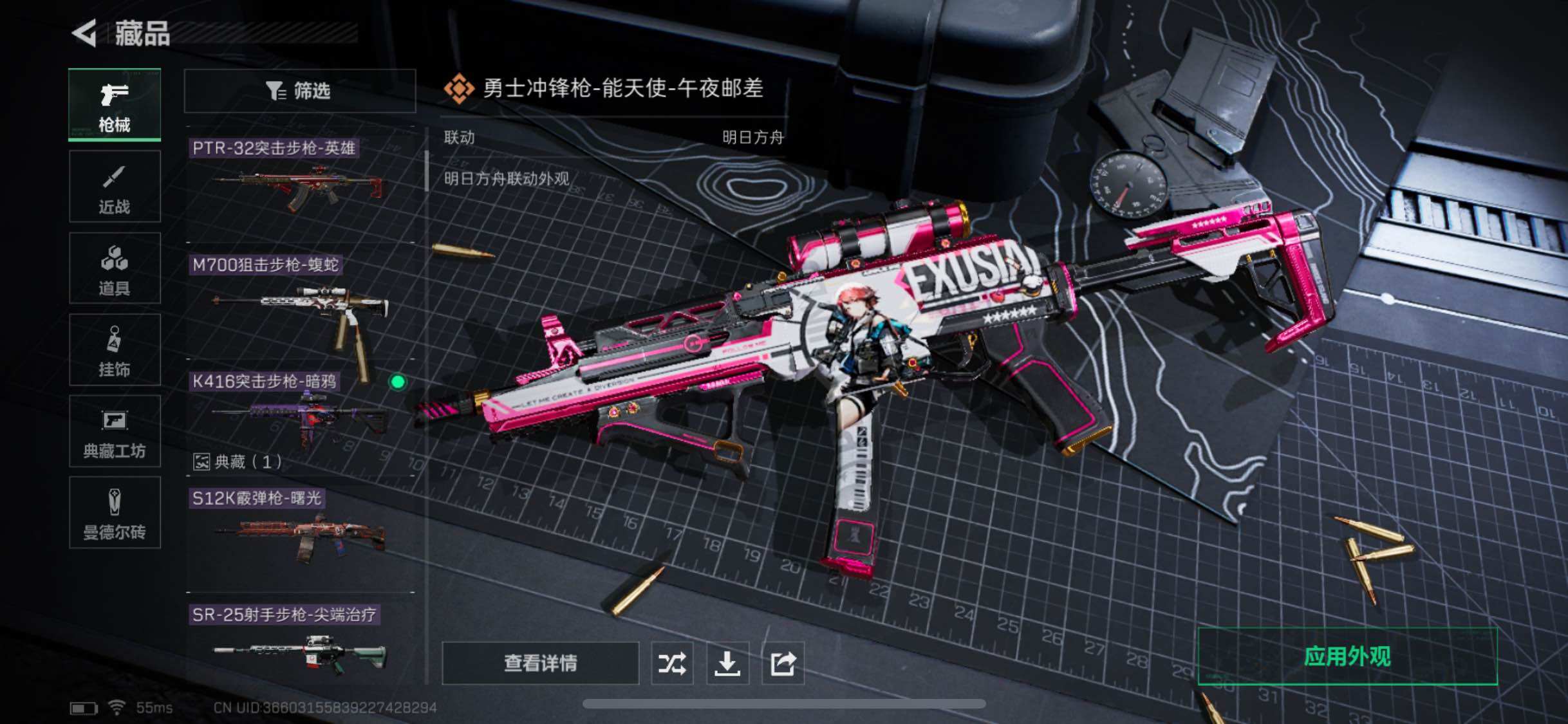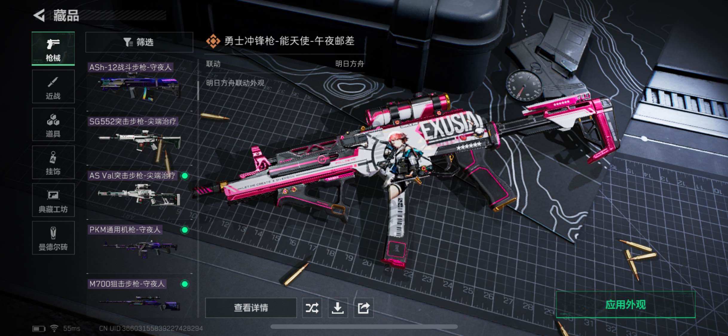 【典藏外观】:K416突击步枪-暗鸦,PSG-1射手步枪-原型机,MP5冲锋枪-星之彩,AK-12突击步枪-极地勘察队,PKM通用机枪-极地勘察队,M700狙击步枪-极地勘察队,R93狙击步枪-常青藤,AKM突击步枪-黄铜,PKM通用机枪-黄铜,.357左轮-黄铜,AKS-74U突击步枪-马赛克涂装,P90冲锋枪-马赛克涂装,M870霰弹枪-马赛克涂装,SV-98狙击步枪-马赛克涂装,G18-马赛克涂装