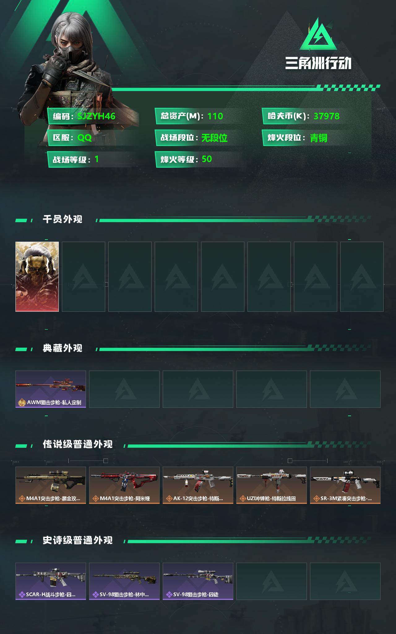 【SJZYH46】总资产(M):110M/哈夫币(K):37978K/哈夫币(K):37978K/全面战场等级:1_段位:无段位/烽火地带等级:50_段位:青铜/红狼-蚀金玫瑰/AWM狙击步枪-私人定制/M4A1突击步枪-蚀金玫瑰/M4A1突击步枪-阿米娅/AK-12突击步枪-特斯拉线圈/UZI冲锋枪-特斯拉线圈/SR-3M紧凑突击步枪-特斯拉线圈/SCAR-H战斗步枪-囚徒/SV-98狙击步枪-林中猎手/SV-98狙击步枪-囚徒/SCAR-H战斗步枪-荣耀列队/MP5冲锋枪-弄臣/MP5冲锋枪-虎啸/Vector冲锋枪-先锋/SMG-45-行动开启/SMG-45冲锋枪-幻影结构/M1014霰弹枪-幻影结构/Mini-14射手步枪-荣耀列队/SV-98狙击步枪-星链科技/G18-星链科技/M4A1突击步枪-粉色涂装/M4A1突击步枪-高雅黑/QBZ95-1突击步枪-高雅黑/QBZ95-1突击步枪-海浪/QBZ95-1突击步枪-海色/M16A4突击步枪-山林猎人/AUG突击步枪-浅蓝涂装/M7战斗步枪-红色涂装/SG552突击步枪-海浪/SCAR-H战斗步枪-数码迷彩/PTR-32突击步枪-黄蜂/MP5冲锋枪-黄蜂/Vector冲锋枪-几何迷彩/M1014霰弹枪-海浪/PKM通用机枪-彩墨喷涂/M249轻机枪-黄蜂/SR-25射手步枪-黄蜂/SV-98狙击步枪-红色涂装/沙漠之鹰-海浪/军牌-特斯拉线圈/军牌-装备修理/军牌-零号大坝/军牌-来点薯条/军牌-修整/军牌-信誉优秀/军牌-小心鳄鱼/挂饰-黑金玫瑰/挂饰-特斯拉线圈/挂饰-阿萨拉狙击兵/挂饰-阿萨拉霰弹兵/挂饰-阿萨拉徽章【登录方式: QQ登录】