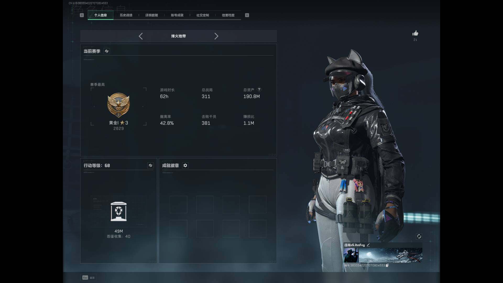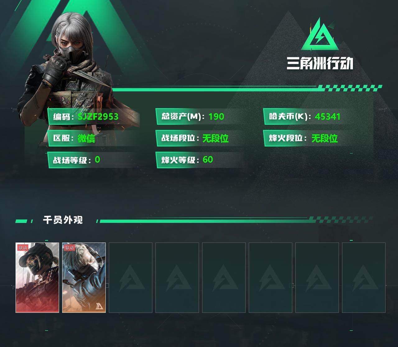 【SJZF2953】总资产(M):190.8M/哈夫币(K):45341K/哈夫币(K):45341K/传说枪皮数:10/烽火地带等级:60_段位:无段位/露娜-黑·天际线/蜂医-送葬人·无题密令/近战-黑鹰【登录方式: 微信登录】 【实名情况: 可二次实名】