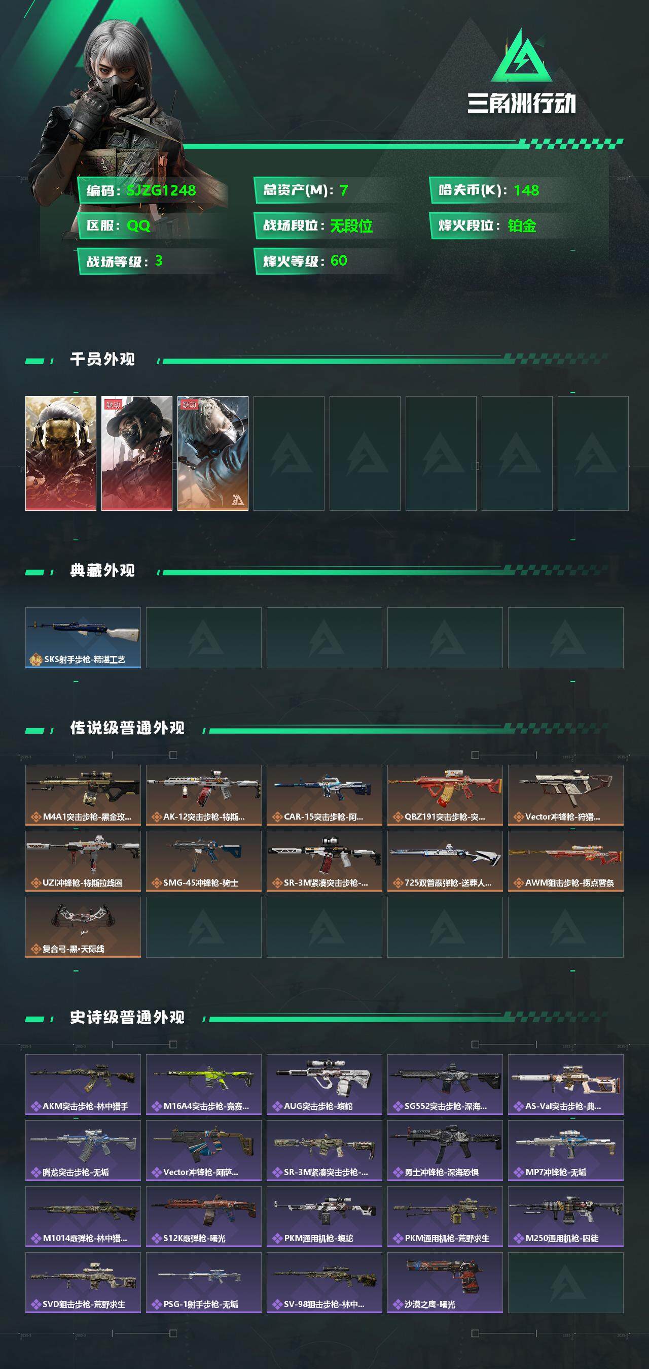 【SJZG1248】总资产(M):7M/哈夫币(K):148K/哈夫币(K):148K/全面战场等级:3_段位:无段位/烽火地带等级:60_段位:铂金/红狼-蚀金玫瑰/露娜-黑·天际线/蜂医-送葬人·无题密令/SKS射手步枪-精湛工艺/M4A1突击步枪-蚀金玫瑰/AK-12突击步枪-特斯拉线圈/CAR-15突击步枪-阿米娅/腾龙突击步枪-捞点薯条/Vector冲锋枪-狩猎时刻/UZI冲锋枪-特斯拉线圈/SMG-45冲锋枪-骑士/SR-3M紧凑突击步枪-特斯拉线圈/725双管霰弹枪-送葬人-无题密令/AWM狙击步枪-捞点薯条/复合弓-黑·天际线/AKM突击步枪-林中猎手/M16A4突击步枪-竞赛选手/AUG突击步枪-蝮蛇/SG552突击步枪-深海恐惧/AS Val突击步枪-典狱官/腾龙突击步枪-无垢/Vector冲锋枪-阿萨拉文明/SR-3M紧凑突击步枪-荒野求生/勇士冲锋枪-深海恐惧/MP7冲锋枪-无垢/M1014霰弹枪-林中猎手/S12K霰弹枪-曙光/PKM通用机枪-蝮蛇/PKM通用机枪-荒野求生/M250通用机枪-囚徒/SVD狙击步枪-荒野求生/PSG-1射手步枪-无垢/SV-98狙击步枪-林中猎手/沙漠之鹰-曙光/ASh-12战斗步枪-星链科技/K416突击步枪-黑骑士/K416突击步枪-虎啸/SCAR-H战斗步枪-童趣/SCAR-H战斗步枪-荣耀列队/PTR-32突击步枪-天网/腾龙突击步枪-雪崩/MP5冲锋枪-弄臣/MP5冲锋枪-虎啸/P90冲锋枪-浅鲨小队/P90冲锋枪-新生/Vector冲锋枪-行动开启/UZI冲锋枪-前沿科技/SMG-45-行动开启/SMG-45冲锋枪-幻影结构/SMG-45冲锋枪-天网/SR-3M紧凑突击步枪-雪崩/MP7冲锋枪-幻影结构/M1014霰弹枪-幻影结构/M250通用机枪-虎啸/Mini-14射手步枪-荣耀列队/SKS射手步枪-弄臣/SKS射手步枪-雪崩/SR-25射手步枪-开拓/SR-9射手步枪-街头涂鸦/SV-98狙击步枪-星链科技/G18-星链科技/M4A1突击步枪-粉色涂装/M4A1突击步枪-高雅黑/M4A1突击步枪-海色/AKM突击步枪-彩墨喷涂/QBZ95-1突击步枪-高雅黑/QBZ95-1突击步枪-海浪/QBZ95-1突击步枪-海色/QBZ191突击步枪-三角洲力量/K416突击步枪-几何迷彩/K416突击步枪-高雅黑/M16A4突击步枪-山林猎人/AUG突击步枪-浅蓝涂装/M7战斗步枪-红色涂装/SG552突击步枪-浅蓝涂装/SG552突击步枪-海浪/SG552突击步枪-彩墨喷涂/AK-12突击步枪-落花/SCAR-H战斗步枪-数码迷彩/G3战斗步枪-高雅黑/G3战斗步枪-山林猎人/PTR-32突击步枪-黄蜂/腾龙突击步枪-彩墨喷涂/MP5冲锋枪-海色/MP5冲锋枪-黄蜂/P90冲锋枪-安全工作/Vector冲锋枪-几何迷彩/UZI冲锋枪-海色/UZI冲锋枪-山林猎人/野牛冲锋枪-彩墨喷涂/QCQ171冲锋枪-三角洲力量/M1014霰弹枪-高雅黑/M1014霰弹枪-海浪/PKM通用机枪-彩墨喷涂/M249轻机枪-黄蜂/QJB201轻机枪-山林猎人/Mini-14射手步枪-山林猎人/SR-25射手步枪-黄蜂/SV-98狙击步枪-红色涂装/M700狙击步枪-山林猎人/M1911-坚固材料/军牌-特斯拉线圈/军牌-失重/军牌-送葬人·无题密令/军牌-装备修理/军牌-静谧时光/军牌-展示/军牌-享受音乐/军牌-永恒/军牌-零号大坝/军牌-来点薯条/军牌-钻石皇后酒店/军牌-神秘艺术/军牌-幸福国/军牌-信誉优秀/军牌-下午茶/军牌-小心鳄鱼/挂饰-黑金玫瑰/挂饰-黑/挂饰-幸运鼠鼠/挂饰-特斯拉线圈/挂饰-晶石回响/挂饰-重装记者/挂饰-演出导演/挂饰-阿萨拉狙击兵/挂饰-阿萨拉霰弹兵/挂饰-乐队纪念/挂饰-阿萨拉徽章【登录方式: QQ登录】