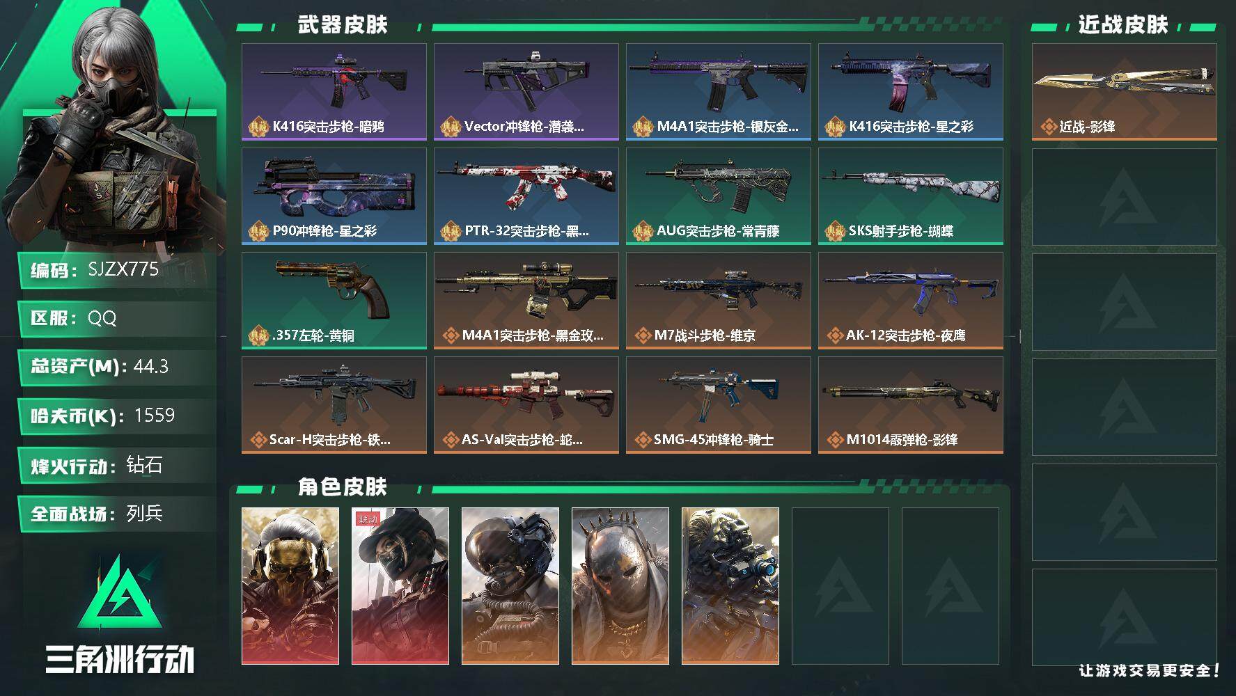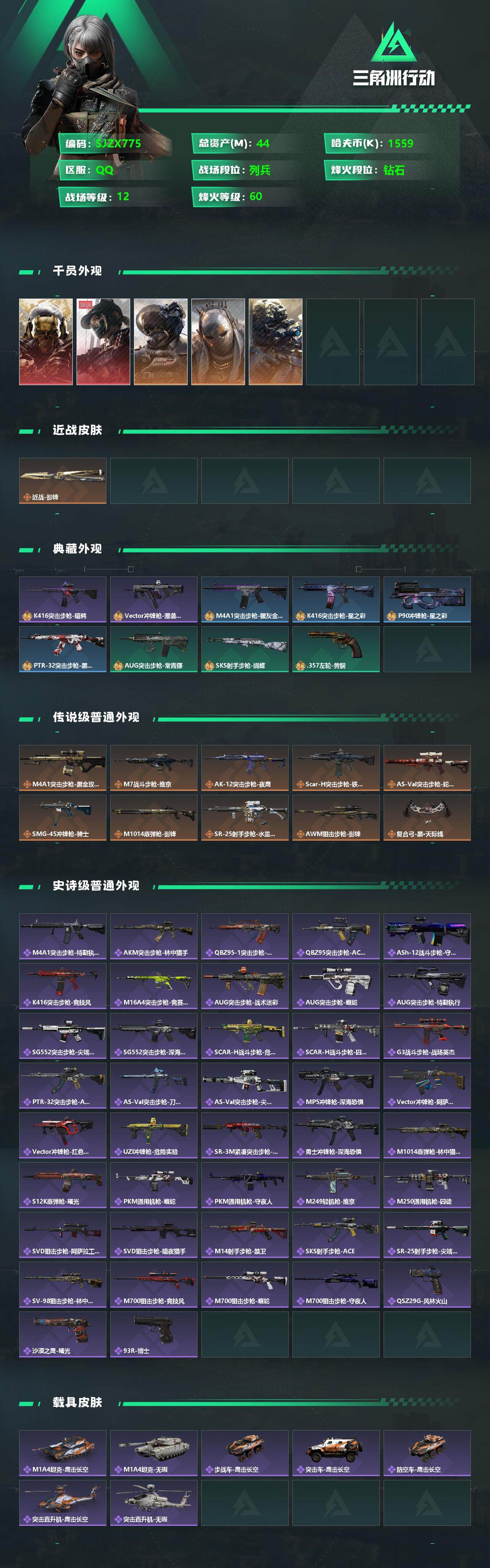 【SJZX775】总资产(M):44.3M/哈夫币(K):1559K/哈夫币(K):1559K/全面战场等级:12_段位:列兵/烽火地带等级:60_段位:钻石/红狼-蚀金玫瑰/露娜-黑·天际线/威龙-壮志凌云/牧羊人-街头之王/无名-夜鹰/近战-影锋/K416突击步枪-暗鸦/Vector冲锋枪-潜袭者/M4A1突击步枪-银灰金属/K416突击步枪-星之彩/P90冲锋枪-星之彩/PTR-32突击步枪-黑潮/AUG突击步枪-常青藤/SKS射手步枪-蝴蝶/.357左轮-黄铜/M4A1突击步枪-蚀金玫瑰/M7战斗步枪-维京/AK-12突击步枪-夜鹰/SCAR-H战斗步枪-铁艺苍穹/AS Val突击步枪-蛇年祥瑞/SMG-45冲锋枪-骑士/M1014霰弹枪-影锋/SR-25射手步枪-水墨云图/AWM狙击步枪-影锋/复合弓-黑·天际线/M4A1突击步枪-特勤执行/AKM突击步枪-林中猎手/QBZ95-1突击步枪-曙光/QBZ95-1突击步枪-ACE/ASh-12战斗步枪-守夜人/K416突击步枪-竞技风/M16A4突击步枪-竞赛选手/AUG突击步枪-战术迷彩/AUG突击步枪-蝮蛇/AUG突击步枪-特勤执行/SG552突击步枪-尖端治疗/SG552突击步枪-深海恐惧/SCAR-H战斗步枪-危险实验/SCAR-H战斗步枪-囚徒/G3战斗步枪-战场英杰/PTR-32突击步枪-ACE/AS Val突击步枪-刀锋/AS Val突击步枪-尖端治疗/MP5冲锋枪-深海恐惧/Vector冲锋枪-阿萨拉文明/Vector冲锋枪-红色彗星/UZI冲锋枪-危险实验/SR-3M紧凑突击步枪-英雄/勇士冲锋枪-深海恐惧/M1014霰弹枪-林中猎手/S12K霰弹枪-曙光/PKM通用机枪-蝮蛇/PKM通用机枪-守夜人/M249轻机枪-维京/M250通用机枪-囚徒/SVD狙击步枪-阿萨拉工艺/SVD狙击步枪-暗夜猎手/M14射手步枪-禁卫/SKS射手步枪-ACE/SR-25射手步枪-尖端治疗/SV-98狙击步枪-林中猎手/M700狙击步枪-竞技风/M700狙击步枪-蝮蛇/M700狙击步枪-守夜人/QSZ92G-风林火山/沙漠之鹰-曙光/93R-博士/M4A1突击步枪-战术小队/M4A1突击步枪-夜幕/QBZ95-1突击步枪-精准打击/ASh-12战斗步枪-星链科技/K416突击步枪-碳纤维/K416突击步枪-夜幕/M16A4突击步枪-远航/M7战斗步枪-前沿科技/SG552突击步枪-禁止进入/SCAR-H战斗步枪-远航/SCAR-H战斗步枪-荣耀列队/G3战斗步枪-夜幕/PTR-32突击步枪-天网/CAR15突击步枪-亚特兰蒂斯/MP5冲锋枪-弄臣/MP5冲锋枪-巡逻队/P90冲锋枪-蛇年新春/P90冲锋枪-浅鲨小队/P90冲锋枪-新生/Vector冲锋枪-先锋/VECTOR冲锋枪-街头涂鸦/VECTOR冲锋枪-蜂窝科技/Vector冲锋枪-行动开启/野牛冲锋枪-新生/SMG-45冲锋枪-哈夫克卫队/SMG-45-行动开启/SMG-45冲锋枪-幻影结构/勇士冲锋枪-前沿科技/PP19冲锋枪-星链科技/MP7冲锋枪-幻影结构/M1014霰弹枪-弄臣/M1014霰弹枪-幻影结构/M870霰弹枪-蛇年新春/PKM通用机枪-英雄/M250通用机枪-天网/QJB201轻机枪-远航/Mini-14射手步枪-蛇年新春/Mini-14射手步枪-荣耀列队/SVD狙击步枪-战术行动/SVD狙击步枪-夜幕/M14射手步枪-医疗协议/M14射手步枪-哈夫克卫队/SKS射手步枪-弄臣/SR-25射手步枪-开拓/SR-25射手步枪-蜂窝科技/SR-9射手步枪-街头涂鸦/SV-98狙击步枪-星链科技/R93狙击步枪-远航/G18C-夜幕/G18-星链科技/93R-蜂窝科技/M4A1突击步枪-粉色涂装/M4A1突击步枪-高雅黑/M4A1突击步枪-蛛网/M4A1突击步枪-海色/QBZ95-1突击步枪-高雅黑/QBZ95-1突击步枪-海浪/QBZ95-1突击步枪-海色/Ash-12突击步枪-风云涌动/K416突击步枪-几何迷彩/K416突击步枪-高雅黑/K416突击步枪-风云涌动/M16A4突击步枪-山林猎人/AUG突击步枪-浅蓝涂装/AUG突击步枪-风云涌动/AUG突击步枪-落花/M7战斗步枪-红色涂装/M7战斗步枪-落花/SG552突击步枪-浅蓝涂装/SG552突击步枪-精钢/SG552突击步枪-海浪/AK-12突击步枪-冰川/AK-12突击步枪-坚固材料/AK-12突击步枪-落花/SCAR-H战斗步枪-沙色涂装/SCAR-H战斗步枪-数码迷彩/SCAR-H突击步枪-矩阵/G3战斗步枪-高雅黑/PTR-32突击步枪-坚固材料/PTR-32突击步枪-黄蜂/MP5冲锋枪-矩阵/MP5冲锋枪-蛛网/MP5冲锋枪-安全工作/MP5冲锋枪-海色/MP5冲锋枪-黄蜂/P90冲锋枪-三角洲力量/P90冲锋枪-冰川/P90冲锋枪-安全工作/P90冲锋枪-落花/Vector冲锋枪-几何迷彩/UZI冲锋枪-矩阵/UZI冲锋枪-海色/勇士冲锋枪-矩阵/勇士冲锋枪-精钢/勇士冲锋枪-坚固材料/QCQ171冲锋枪-三角洲力量/M1014霰弹枪-高雅黑/M1014霰弹枪-风云涌动/M1014霰弹枪-海浪/S12K霰弹枪-精钢/M249轻机枪-精钢/M249轻机枪-冰川/M249轻机枪-黄蜂/QJB201轻机枪-三角洲力量/VSS射手步枪-矩阵/SVD狙击步枪-风云涌动/M14射手步枪-落花/SKS射手步枪-坚固材料/SR-25射手步枪-黄蜂/SR-9射手步枪-落花/SV-98狙击步枪-红色涂装/SV-98狙击步枪-冰川/QSZ92G-风云涌动/.357左轮-精钢/沙漠之鹰-海浪/G18-浅蓝涂装/M1911-坚固材料/M1A4坦克-鹰击长空/M1A4坦克-无瑕/步战车-鹰击长空/突击车-鹰击长空/防空车-鹰击长空/突击直升机-鹰击长空/突击直升机-无瑕/军牌-影锋/军牌-摇滚涂鸦/军牌-虚拟世界/军牌-巴克什/军牌-新年雪仗/军牌-夜鹰/军牌-壮志凌云/军牌-行动规划/军牌-最后一刻/军牌-装备修理/军牌-坠机点/军牌-植入/军牌-蓄势待发/军牌-夜间撤离/军牌-静谧时光/军牌-展示/军牌-享受音乐/军牌-永恒/军牌-夕阳/军牌-零号大坝/军牌-来点薯条/军牌-钻石皇后酒店/军牌-繁星/军牌-神秘艺术/军牌-幸福国/军牌-烟火/军牌-信誉优秀/军牌-蛟龙/军牌-小心鳄鱼/挂饰-黑金玫瑰/挂饰-影锋/挂饰-黑/挂饰-王国之杖/挂饰-白王后/挂饰-灵魂摇滚/挂饰-relink/挂饰-维京/挂饰-王牌座驾/挂饰-小羊/挂饰-重装记者/挂饰-阿萨拉狙击兵/挂饰-阿萨拉霰弹兵/挂饰-阿萨拉徽章【登录方式: QQ登录】