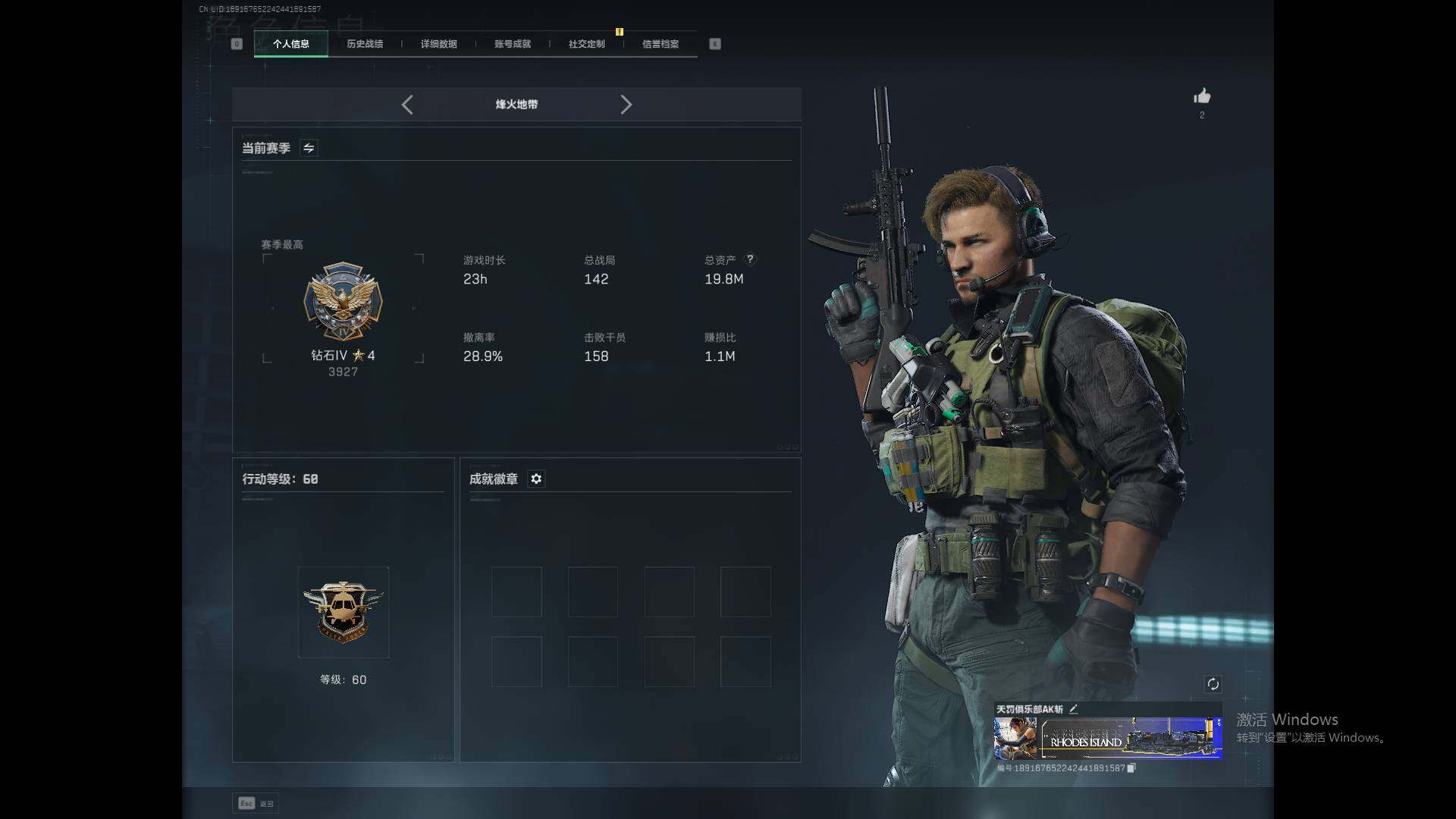 【SJZF3078】总资产(M):19.8M/哈夫币(K):435K/哈夫币(K):435K/全面战场等级:1_段位:无段位/烽火地带等级:60_段位:钻石/露娜-黑·天际线/近战-黑鹰【登录方式: QQ登录】 【实名情况: 不可二次实名】