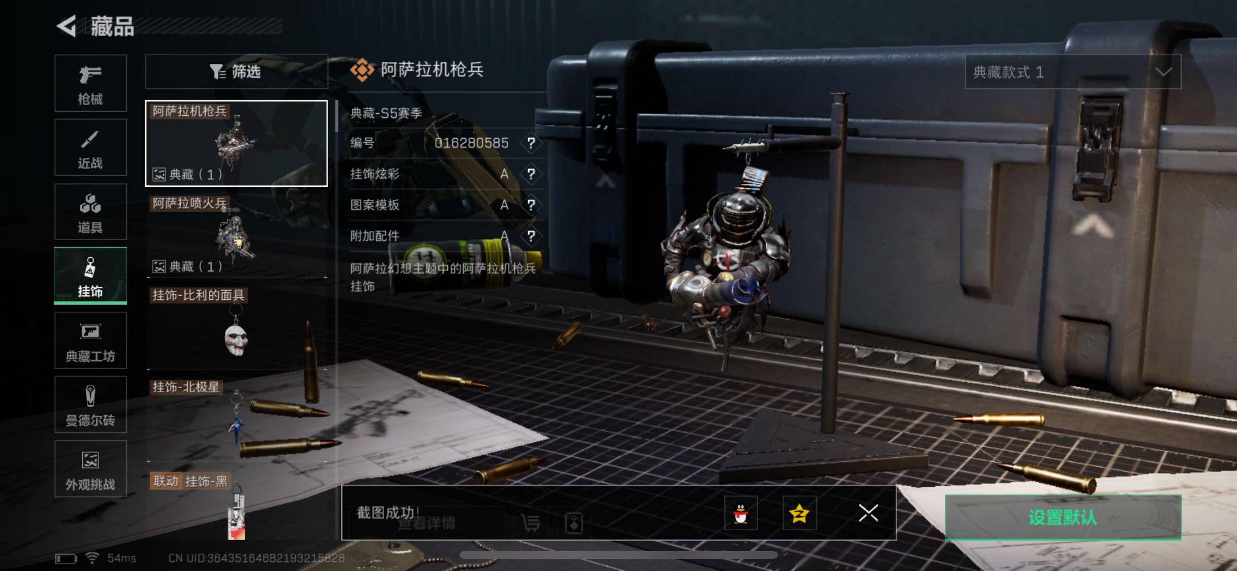 【挂饰】:挂饰-黑,挂饰-北极星,挂饰-幸运鼠鼠,挂饰-阿萨拉机枪兵,挂饰-特斯拉线圈,挂饰-来点薯条,挂饰-晶石回响,挂饰-阿萨拉徽章