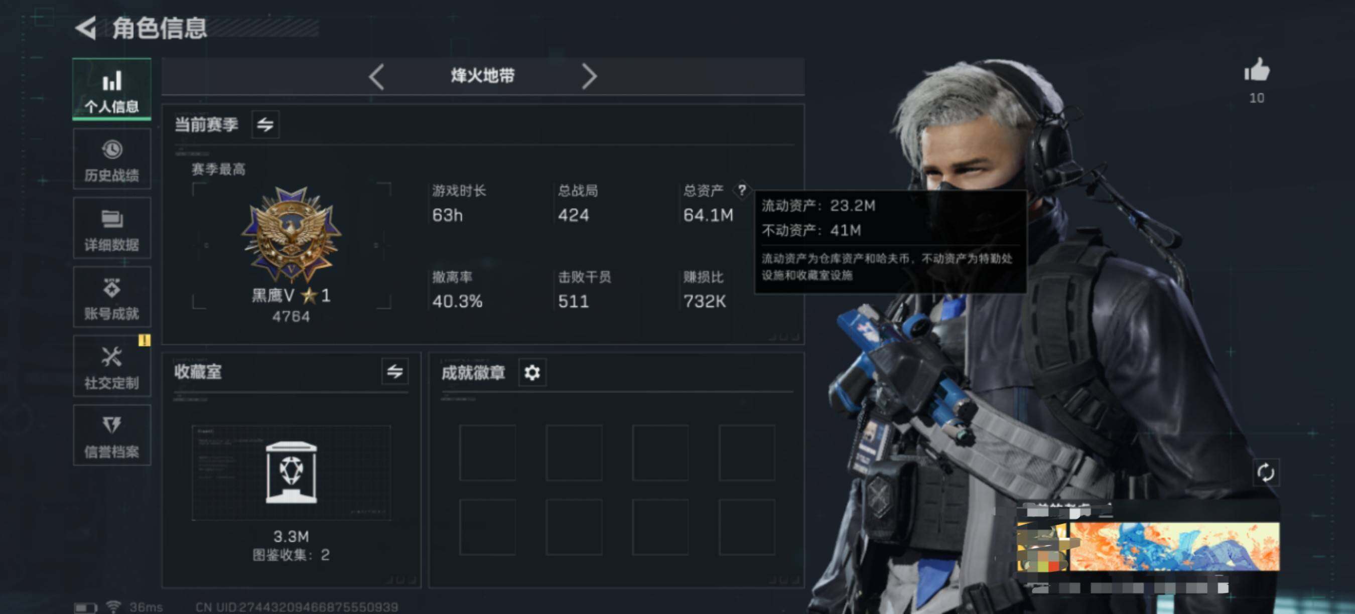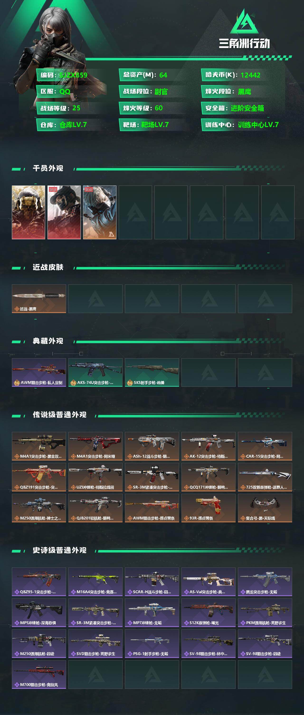 【SJZX859】总资产(M):64.1M/哈夫币(K):12442K/哈夫币(K):12442K/全面战场等级:25_段位:尉官/烽火地带等级:60_段位:黑鹰/红狼-蚀金玫瑰/露娜-黑·天际线/蜂医-送葬人·无题密令/近战-黑鹰/AWM狙击步枪-私人定制/AKS-74U突击步枪-监察/SKS射手步枪-凶兽/M4A1突击步枪-蚀金玫瑰/M4A1突击步枪-阿米娅/ASh-12战斗步枪-鹅鸭杀/AK-12突击步枪-特斯拉线圈/CAR-15突击步枪-阿米娅/腾龙突击步枪-捞点薯条/UZI冲锋枪-特斯拉线圈/SR-3M紧凑突击步枪-特斯拉线圈/QCQ171冲锋枪-鹅鸭杀/725双管霰弹枪-送葬人-无题密令/M250通用机枪-骑士之心/QJB201轻机枪-鹅鸭杀/AWM狙击步枪-捞点薯条/93R-捞点薯条/复合弓-黑·天际线/QBZ95-1突击步枪-曙光/M16A4突击步枪-竞赛选手/SCAR-H战斗步枪-囚徒/AS Val突击步枪-典狱官/腾龙突击步枪-无垢/MP5冲锋枪-深海恐惧/SR-3M紧凑突击步枪-荒野求生/MP7冲锋枪-无垢/S12K霰弹枪-曙光/PKM通用机枪-荒野求生/M250通用机枪-囚徒/SVD狙击步枪-荒野求生/PSG-1射手步枪-无垢/SV-98狙击步枪-林中猎手/SV-98狙击步枪-囚徒/M700狙击步枪-竞技风/AKS-74U突击步枪-前沿科技/K416突击步枪-酷炫狂拽/K416突击步枪-虎啸/SCAR-H战斗步枪-荣耀列队/PTR-32突击步枪-天网/CAR-15突击步枪-前沿科技/腾龙突击步枪-雪崩/K437突击步枪-天狼星/MP5冲锋枪-前沿科技/MP5冲锋枪-弄臣/MP5冲锋枪-虎啸/Vector冲锋枪-先锋/UZI冲锋枪-前沿科技/野牛冲锋枪-前沿科技/SMG-45-行动开启/SMG-45冲锋枪-幻影结构/SMG-45冲锋枪-天网/SR-3M紧凑突击步枪-雪崩/M1014霰弹枪-幻影结构/M249轻机枪-毛鲁斯之力/M250通用机枪-虎啸/M250通用机枪-天网/Mini-14射手步枪-荣耀列队/SKS射手步枪-弄臣/SKS射手步枪-雪崩/SR-25射手步枪-开拓/SR-9射手步枪-街头涂鸦/SV-98狙击步枪-星链科技/G18-星链科技/M4A1突击步枪-粉色涂装/M4A1突击步枪-高雅黑/M4A1突击步枪-海色/AKM突击步枪-彩墨喷涂/QBZ95-1突击步枪-高雅黑/QBZ95-1突击步枪-海浪/QBZ191突击步枪-三角洲力量/K416突击步枪-几何迷彩/K416突击步枪-高雅黑/M16A4突击步枪-三角洲力量/M16A4突击步枪-山林猎人/AUG突击步枪-浅蓝涂装/M7战斗步枪-红色涂装/SG552突击步枪-浅蓝涂装/SG552突击步枪-海浪/SG552突击步枪-彩墨喷涂/SCAR-H战斗步枪-数码迷彩/G3战斗步枪-高雅黑/G3战斗步枪-山林猎人/PTR-32突击步枪-黄蜂/腾龙突击步枪-彩墨喷涂/MP5冲锋枪-海色/MP5冲锋枪-黄蜂/P90冲锋枪-三角洲力量/Vector冲锋枪-几何迷彩/UZI冲锋枪-海色/UZI冲锋枪-山林猎人/野牛冲锋枪-彩墨喷涂/M1014霰弹枪-高雅黑/M1014霰弹枪-海浪/PKM通用机枪-彩墨喷涂/M249轻机枪-黄蜂/QJB201轻机枪-三角洲力量/QJB201轻机枪-山林猎人/Mini-14射手步枪-山林猎人/SR-25射手步枪-黄蜂/SV-98狙击步枪-红色涂装/M700狙击步枪-山林猎人/沙漠之鹰-海浪/军牌-飞驰/军牌-捞点薯条/军牌-特斯拉线圈/军牌-失重/军牌-送葬人·无题密令/军牌-猫咪/军牌-装备修理/军牌-静谧时光/军牌-展示/军牌-永恒/军牌-零号大坝/军牌-肥柴集合/军牌-来点薯条/军牌-修整/军牌-神秘艺术/军牌-幸福国/军牌-信誉优秀/军牌-下午茶/军牌-小心鳄鱼/挂饰-黑金玫瑰/挂饰-黑/挂饰-余烬之影/挂饰-三联装手炮/挂饰-枪匠/挂饰-特斯拉线圈/挂饰-来点薯条/挂饰-晶石回响/挂饰-阿萨拉狙击兵/挂饰-阿萨拉霰弹兵/挂饰-阿萨拉徽章【登录方式: QQ登录】