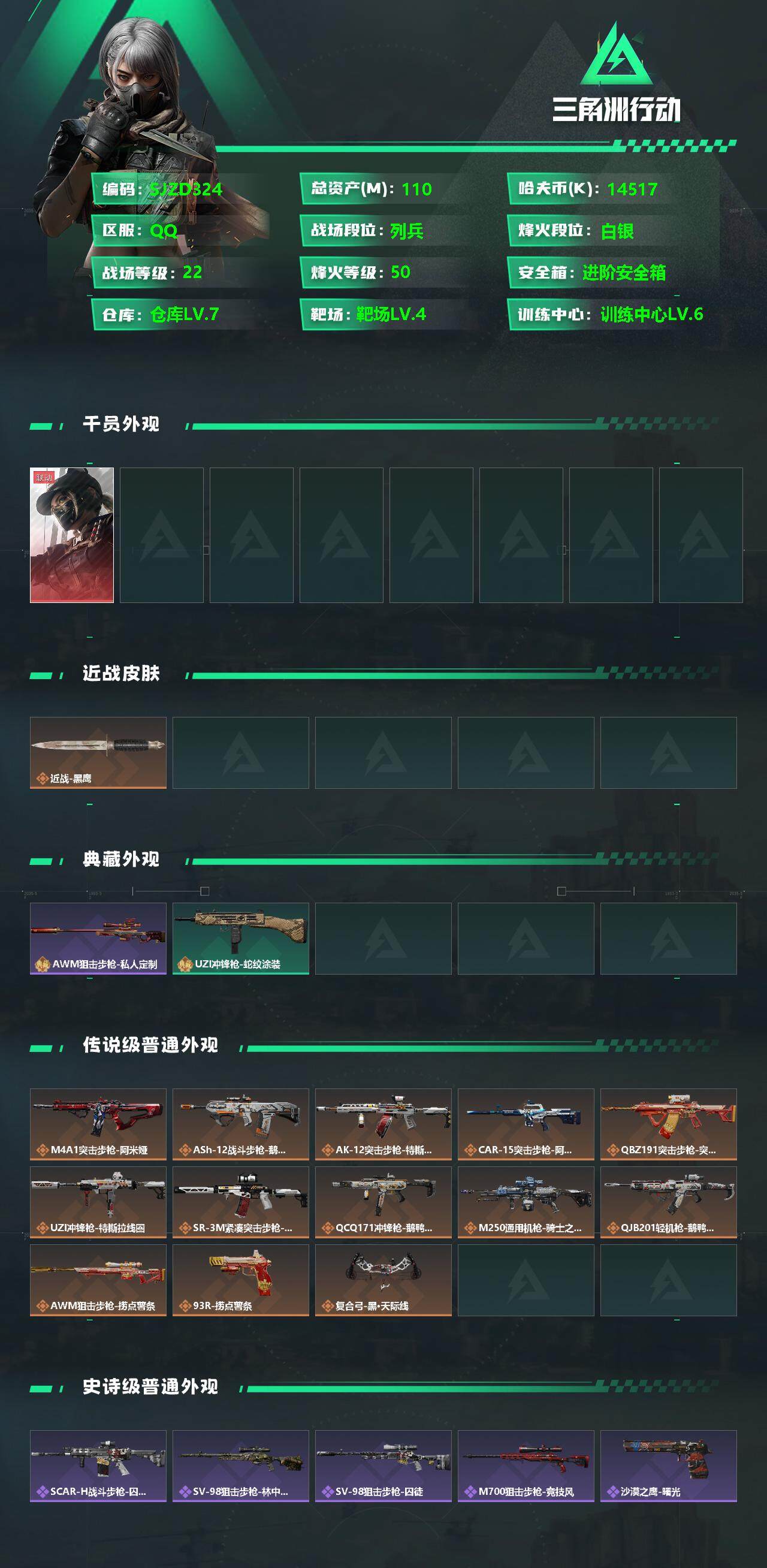 【SJZD324】总资产(M):110.1M/哈夫币(K):14517K/哈夫币(K):14517K/传说枪皮数:17/全面战场等级:22_段位:列兵/烽火地带等级:50_段位:白银/非洲之心/露娜-黑·天际线/近战-黑鹰/AWM狙击步枪-私人定制/UZI冲锋枪-蛇纹涂装/M4A1突击步枪-阿米娅/ASh-12战斗步枪-鹅鸭杀/AK-12突击步枪-特斯拉线圈/CAR-15突击步枪-阿米娅/腾龙突击步枪-捞点薯条/UZI冲锋枪-特斯拉线圈/SR-3M紧凑突击步枪-特斯拉线圈/QCQ171冲锋枪-鹅鸭杀/M250通用机枪-骑士之心/QJB201轻机枪-鹅鸭杀/AWM狙击步枪-捞点薯条/93R-捞点薯条/复合弓-黑·天际线/SCAR-H战斗步枪-囚徒/SV-98狙击步枪-林中猎手/SV-98狙击步枪-囚徒/M700狙击步枪-竞技风/沙漠之鹰-曙光/K416突击步枪-酷炫狂拽/SCAR-H战斗步枪-荣耀列队/MP5冲锋枪-弄臣/MP5冲锋枪-虎啸/Vector冲锋枪-先锋/SMG-45-行动开启/Mini-14射手步枪-荣耀列队/SKS射手步枪-弄臣/SR-25射手步枪-开拓/SV-98狙击步枪-星链科技/G18-星链科技/M4A1突击步枪-粉色涂装/M4A1突击步枪-高雅黑/M4A1突击步枪-海色/QBZ95-1突击步枪-高雅黑/QBZ95-1突击步枪-海浪/QBZ95-1突击步枪-海色/K416突击步枪-几何迷彩/K416突击步枪-高雅黑/M16A4突击步枪-山林猎人/AUG突击步枪-浅蓝涂装/M7战斗步枪-红色涂装/SG552突击步枪-浅蓝涂装/SG552突击步枪-海浪/SCAR-H战斗步枪-数码迷彩/G3战斗步枪-高雅黑/PTR-32突击步枪-黄蜂/MP5冲锋枪-安全工作/MP5冲锋枪-海色/MP5冲锋枪-黄蜂/P90冲锋枪-三角洲力量/P90冲锋枪-安全工作/Vector冲锋枪-几何迷彩/UZI冲锋枪-海色/QCQ171冲锋枪-三角洲力量/M1014霰弹枪-高雅黑/M1014霰弹枪-海浪/PKM通用机枪-彩墨喷涂/M249轻机枪-黄蜂/QJB201轻机枪-三角洲力量/SR-25射手步枪-黄蜂/SV-98狙击步枪-红色涂装/沙漠之鹰-海浪/军牌-捞点薯条/军牌-特斯拉线圈/军牌-装备修理/军牌-静谧时光/军牌-展示/军牌-享受音乐/军牌-永恒/军牌-零号大坝/军牌-来点薯条/军牌-修整/军牌-神秘艺术/军牌-幸福国/军牌-信誉优秀/军牌-小心鳄鱼/挂饰-黑/挂饰-幸运鼠鼠/挂饰-余烬之影/挂饰-特斯拉线圈/挂饰-来点薯条/挂饰-阿萨拉狙击兵【登录方式: QQ登录】