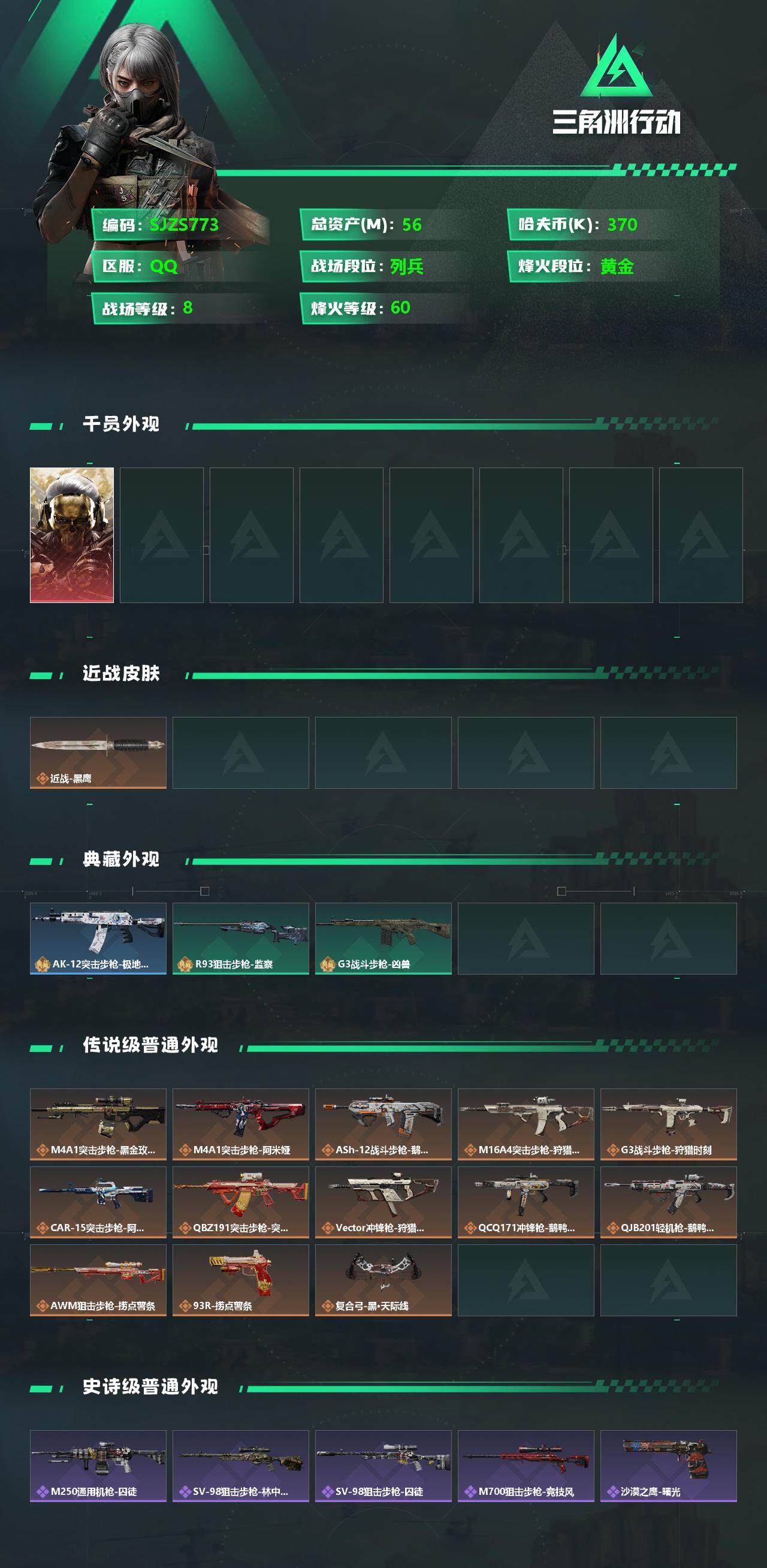 【SJZS773】总资产(M):56.4M/哈夫币(K):370K/哈夫币(K):370K/全面战场等级:8_段位:列兵/烽火地带等级:60_段位:黄金/红狼-蚀金玫瑰/近战-黑鹰/AK-12突击步枪-极地勘察队/R93狙击步枪-监察/G3战斗步枪-凶兽/M4A1突击步枪-蚀金玫瑰/M4A1突击步枪-阿米娅/ASh-12战斗步枪-鹅鸭杀/M16A4突击步枪-狩猎时刻/G3战斗步枪-狩猎时刻/CAR-15突击步枪-阿米娅/腾龙突击步枪-捞点薯条/Vector冲锋枪-狩猎时刻/QCQ171冲锋枪-鹅鸭杀/QJB201轻机枪-鹅鸭杀/AWM狙击步枪-捞点薯条/93R-捞点薯条/复合弓-黑·天际线/M250通用机枪-囚徒/SV-98狙击步枪-林中猎手/SV-98狙击步枪-囚徒/M700狙击步枪-竞技风/沙漠之鹰-曙光/QBZ95-1突击步枪-前沿科技/AUG突击步枪-前沿科技/SCAR-H战斗步枪-荣耀列队/MP5冲锋枪-弄臣/MP5冲锋枪-虎啸/SMG-45-行动开启/SMG-45冲锋枪-天网/勇士冲锋枪-荣耀/M1014霰弹枪-幻影结构/M249轻机枪-毛鲁斯之力/Mini-14射手步枪-荣耀列队/SKS射手步枪-弄臣/SR-25射手步枪-开拓/G18-星链科技/M4A1突击步枪-粉色涂装/M4A1突击步枪-高雅黑/M4A1突击步枪-海色/QBZ95-1突击步枪-高雅黑/QBZ95-1突击步枪-海浪/QBZ95-1突击步枪-海色/QBZ191突击步枪-三角洲力量/K416突击步枪-几何迷彩/K416突击步枪-高雅黑/M16A4突击步枪-山林猎人/AUG突击步枪-浅蓝涂装/M7战斗步枪-红色涂装/SG552突击步枪-浅蓝涂装/SG552突击步枪-海浪/SCAR-H战斗步枪-数码迷彩/G3战斗步枪-高雅黑/PTR-32突击步枪-黄蜂/MP5冲锋枪-海色/MP5冲锋枪-黄蜂/Vector冲锋枪-几何迷彩/UZI冲锋枪-海色/M1014霰弹枪-高雅黑/M1014霰弹枪-海浪/PKM通用机枪-彩墨喷涂/M249轻机枪-黄蜂/QJB201轻机枪-三角洲力量/SR-25射手步枪-黄蜂/SV-98狙击步枪-红色涂装/沙漠之鹰-海浪/军牌-捞点薯条/军牌-猎杀本能/军牌-装备修理/军牌-永恒/军牌-零号大坝/军牌-肥柴集合/军牌-来点薯条/军牌-修整/军牌-神秘艺术/军牌-幸福国/军牌-信誉优秀/军牌-小心鳄鱼/挂饰-黑金玫瑰/挂饰-黑/挂饰-猎杀本能/挂饰-来点薯条/挂饰-阿萨拉狙击兵/挂饰-阿萨拉霰弹兵/挂饰-阿萨拉徽章【登录方式: QQ登录】