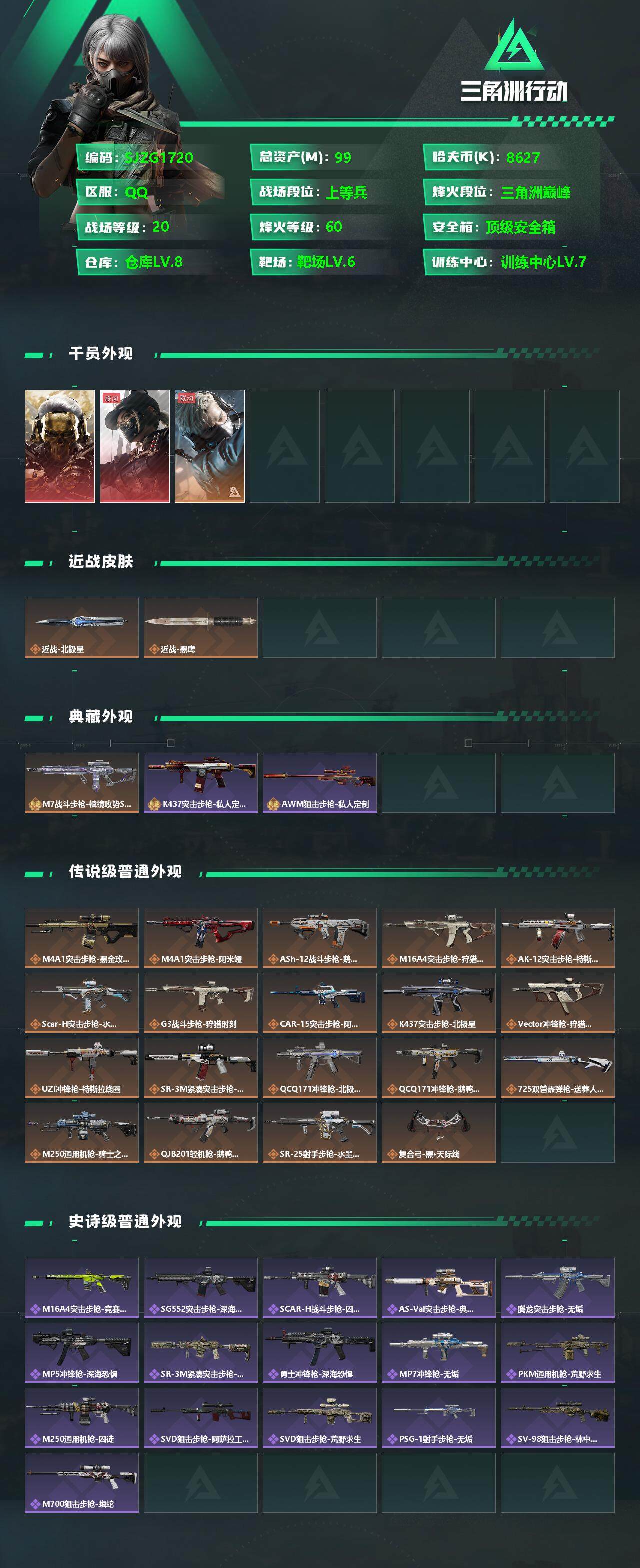 【SJZG1720】总资产(M):99M/哈夫币(K):8627K/哈夫币(K):8627K/传说枪皮数:24/全面战场等级:20_段位:上等兵/烽火地带等级:60_段位:三角洲巅峰/红狼-蚀金玫瑰/露娜-黑·天际线/蜂医-送葬人·无题密令/近战-北极星/近战-黑鹰/M7战斗步枪-棱镜攻势S2/K437突击步枪-私人定制/AWM狙击步枪-私人定制/M4A1突击步枪-蚀金玫瑰/M4A1突击步枪-阿米娅/ASh-12战斗步枪-鹅鸭杀/M16A4突击步枪-狩猎时刻/AK-12突击步枪-特斯拉线圈/SCAR-H战斗步枪-水墨云图/G3战斗步枪-狩猎时刻/CAR-15突击步枪-阿米娅/K437突击步枪-北极星/Vector冲锋枪-狩猎时刻/UZI冲锋枪-特斯拉线圈/SR-3M紧凑突击步枪-特斯拉线圈/QCQ171冲锋枪-北极星/QCQ171冲锋枪-鹅鸭杀/725双管霰弹枪-送葬人-无题密令/M250通用机枪-骑士之心/QJB201轻机枪-鹅鸭杀/SR-25射手步枪-水墨云图/复合弓-黑·天际线/M16A4突击步枪-竞赛选手/SG552突击步枪-深海恐惧/SCAR-H战斗步枪-囚徒/AS Val突击步枪-典狱官/腾龙突击步枪-无垢/MP5冲锋枪-深海恐惧/SR-3M紧凑突击步枪-荒野求生/勇士冲锋枪-深海恐惧/MP7冲锋枪-无垢/PKM通用机枪-荒野求生/M250通用机枪-囚徒/SVD狙击步枪-阿萨拉工艺/SVD狙击步枪-荒野求生/PSG-1射手步枪-无垢/SV-98狙击步枪-林中猎手/M700狙击步枪-蝮蛇/K416突击步枪-虎啸/SCAR-H战斗步枪-荣耀列队/腾龙突击步枪-雪崩/K437突击步枪-前沿科技/MP5冲锋枪-前沿科技/MP5冲锋枪-弄臣/MP5冲锋枪-虎啸/SMG-45冲锋枪-哈夫克卫队/SMG-45-行动开启/SMG-45冲锋枪-天网/SR-3M紧凑突击步枪-雪崩/M1014霰弹枪-幻影结构/M250通用机枪-虎啸/Mini-14射手步枪-荣耀列队/SKS射手步枪-弄臣/SKS射手步枪-雪崩/SR-25射手步枪-开拓/SR-9射手步枪-街头涂鸦/G18-星链科技/M4A1突击步枪-粉色涂装/M4A1突击步枪-高雅黑/M4A1突击步枪-海色/AKM突击步枪-彩墨喷涂/QBZ95-1突击步枪-高雅黑/QBZ95-1突击步枪-海浪/QBZ95-1突击步枪-海色/K416突击步枪-几何迷彩/K416突击步枪-高雅黑/M16A4突击步枪-三角洲力量/M16A4突击步枪-山林猎人/AUG突击步枪-浅蓝涂装/M7战斗步枪-红色涂装/SG552突击步枪-浅蓝涂装/SG552突击步枪-海浪/SG552突击步枪-彩墨喷涂/SCAR-H战斗步枪-数码迷彩/G3战斗步枪-高雅黑/G3战斗步枪-山林猎人/PTR-32突击步枪-黄蜂/腾龙突击步枪-彩墨喷涂/MP5冲锋枪-安全工作/MP5冲锋枪-海色/MP5冲锋枪-黄蜂/P90冲锋枪-安全工作/Vector冲锋枪-几何迷彩/UZI冲锋枪-海色/UZI冲锋枪-山林猎人/野牛冲锋枪-彩墨喷涂/QCQ171冲锋枪-三角洲力量/M1014霰弹枪-高雅黑/M1014霰弹枪-海浪/PKM通用机枪-彩墨喷涂/M249轻机枪-黄蜂/QJB201轻机枪-三角洲力量/QJB201轻机枪-山林猎人/Mini-14射手步枪-山林猎人/SR-25射手步枪-黄蜂/SV-98狙击步枪-红色涂装/M700狙击步枪-山林猎人/沙漠之鹰-海浪/军牌-北极星/军牌-夏日派对/军牌-猎杀本能/军牌-特斯拉线圈/军牌-失重/军牌-送葬人·无题密令/军牌-猫咪/军牌-装备修理/军牌-展示/军牌-永恒/军牌-零号大坝/军牌-肥柴集合/军牌-来点薯条/军牌-修整/军牌-神秘艺术/军牌-幸福国/军牌-信誉优秀/军牌-下午茶/军牌-小心鳄鱼/挂饰-黑金玫瑰/挂饰-黑/挂饰-北极星/挂饰-猎杀本能/挂饰-特斯拉线圈/挂饰-晶石回响【登录方式: QQ登录】