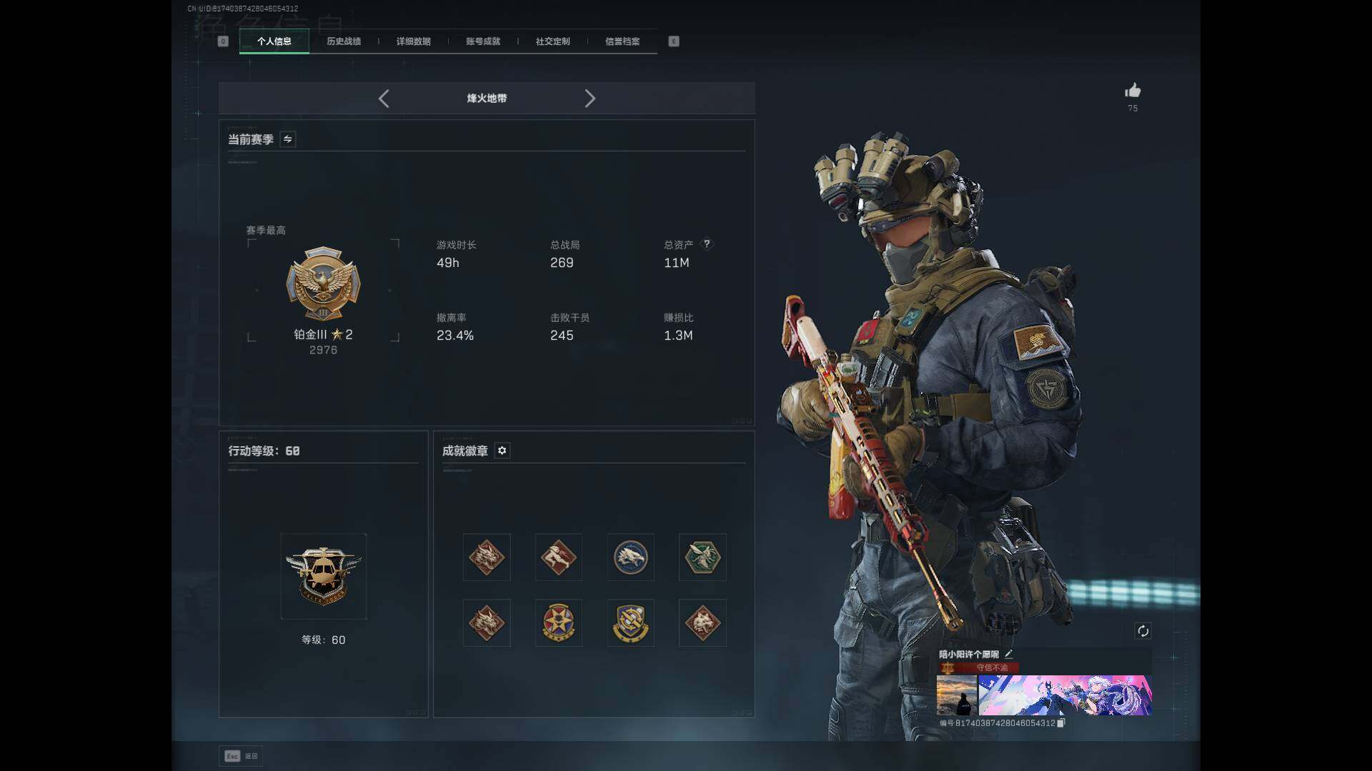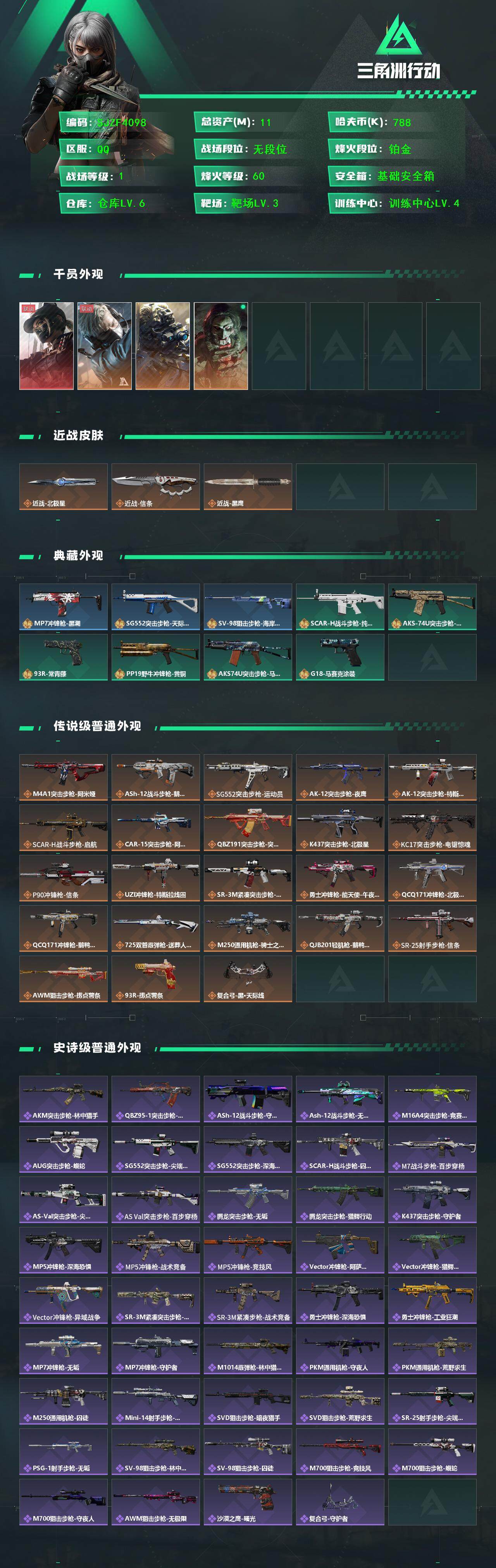 【SJZF4098】总资产(M):11M/哈夫币(K):788K/哈夫币(K):788K/全面战场等级:1_段位:无段位/烽火地带等级:60_段位:铂金/露娜-黑·天际线/蜂医-送葬人·无题密令/无名-夜鹰/红狼-电锯惊魂/近战-北极星/近战-信条/近战-黑鹰/MP7冲锋枪-黑潮/SG552突击步枪-天际线/SV-98狙击步枪-海岸线/SCAR-H战斗步枪-纯白涂装/AKS-74U突击步枪-蛇纹涂装/93R-常青藤/PP19野牛冲锋枪-黄铜/AKS-74U突击步枪-马赛克涂装/G18-马赛克涂装/M4A1突击步枪-阿米娅/ASh-12战斗步枪-鹅鸭杀/SG552突击步枪-运动员/AK-12突击步枪-夜鹰/AK-12突击步枪-特斯拉线圈/SCAR-H战斗步枪-启航/G3战斗步枪-骑士/CAR-15突击步枪-阿米娅/腾龙突击步枪-捞点薯条/K437突击步枪-北极星/KC17突击步枪-电锯惊魂/P90冲锋枪-信条/UZI冲锋枪-特斯拉线圈/SR-3M紧凑突击步枪-特斯拉线圈/勇士冲锋枪-能天使-午夜邮差/QCQ171冲锋枪-北极星/QCQ171冲锋枪-鹅鸭杀/725双管霰弹枪-送葬人-无题密令/M250通用机枪-骑士之心/QJB201轻机枪-鹅鸭杀/SR-25射手步枪-信条/AWM狙击步枪-捞点薯条/93R-捞点薯条/复合弓-黑·天际线/AKM突击步枪-林中猎手/QBZ95-1突击步枪-曙光/ASh-12战斗步枪-守夜人/ASh-12战斗步枪-无极限/M16A4突击步枪-竞赛选手/AUG突击步枪-蝮蛇/SG552突击步枪-尖端治疗/SG552突击步枪-深海恐惧/SCAR-H战斗步枪-囚徒/G3战斗步枪-流沙送葬/AS Val突击步枪-尖端治疗/AS Val突击步枪-百步穿杨/腾龙突击步枪-无垢/腾龙突击步枪-猎鳄行动/K437突击步枪-守护者/MP5冲锋枪-深海恐惧/MP5冲锋枪-战术竞备/MP5冲锋枪-竞技风/Vector冲锋枪-阿萨拉文明/Vector冲锋枪-猎鳄行动/Vector冲锋枪-异域战争/SR-3M紧凑突击步枪-荒野求生/SR-3M紧凑突击步枪-战术竞备/勇士冲锋枪-深海恐惧/勇士冲锋枪-工业狂潮/MP7冲锋枪-无垢/MP7冲锋枪-守护者/M1014霰弹枪-林中猎手/PKM通用机枪-守夜人/PKM通用机枪-荒野求生/M250通用机枪-囚徒/Mini-14射手步枪-守护者/SVD狙击步枪-暗夜猎手/SVD狙击步枪-荒野求生/SR-25射手步枪-尖端治疗/PSG-1射手步枪-无垢/SV-98狙击步枪-林中猎手/SV-98狙击步枪-囚徒/M700狙击步枪-竞技风/M700狙击步枪-蝮蛇/M700狙击步枪-守夜人/AWM狙击步枪-无极限/沙漠之鹰-曙光/复合弓-守护者/K416突击步枪-黑骑士/K416突击步枪-虎啸/M16A4突击步枪-远航/AUG突击步枪-前沿科技/M7战斗步枪-前沿科技/SCAR-H战斗步枪-童趣/SCAR-H战斗步枪-远航/SCAR-H战斗步枪-荣耀列队/PTR-32突击步枪-天网/PTR-32突击步枪-英雄/腾龙突击步枪-雪崩/腾龙突击步枪-前沿科技/K437突击步枪-天狼星/MP5冲锋枪-弄臣/MP5冲锋枪-虎啸/P90冲锋枪-浅鲨小队/P90冲锋枪-新生/Vector冲锋枪-先锋/UZI冲锋枪-前沿科技/野牛冲锋枪-新生/SMG-45-行动开启/SMG-45冲锋枪-幻影结构/SMG-45冲锋枪-天网/SR-3M紧凑突击步枪-雪崩/MP7冲锋枪-幻影结构/M1014霰弹枪-幻影结构/M250通用机枪-虎啸/M250通用机枪-天网/QJB201轻机枪-远航/Mini-14射手步枪-荣耀列队/M14射手步枪-前沿科技/SKS射手步枪-弄臣/SKS射手步枪-雪崩/SR-25射手步枪-开拓/SR-9射手步枪-街头涂鸦/SV-98狙击步枪-星链科技/R93狙击步枪-远航/G18-星链科技/M4A1突击步枪-粉色涂装/M4A1突击步枪-高雅黑/M4A1突击步枪-海色/AKM突击步枪-彩墨喷涂/QBZ95-1突击步枪-高雅黑/QBZ95-1突击步枪-海浪/QBZ95-1突击步枪-海色/QBZ191突击步枪-三角洲力量/K416突击步枪-几何迷彩/K416突击步枪-高雅黑/M16A4突击步枪-山林猎人/AUG突击步枪-浅蓝涂装/AUG突击步枪-落花/M7战斗步枪-红色涂装/M7战斗步枪-落花/SG552突击步枪-浅蓝涂装/SG552突击步枪-海浪/SG552突击步枪-彩墨喷涂/AK-12突击步枪-坚固材料/AK-12突击步枪-落花/SCAR-H战斗步枪-数码迷彩/G3战斗步枪-高雅黑/G3战斗步枪-山林猎人/PTR-32突击步枪-坚固材料/PTR-32突击步枪-黄蜂/腾龙突击步枪-彩墨喷涂/MP5冲锋枪-海色/MP5冲锋枪-黄蜂/P90冲锋枪-落花/Vector冲锋枪-几何迷彩/UZI冲锋枪-海色/UZI冲锋枪-山林猎人/野牛冲锋枪-彩墨喷涂/勇士冲锋枪-坚固材料/M1014霰弹枪-高雅黑/M1014霰弹枪-海浪/PKM通用机枪-彩墨喷涂/M249轻机枪-黄蜂/QJB201轻机枪-三角洲力量/QJB201轻机枪-山林猎人/Mini-14射手步枪-山林猎人/M14射手步枪-落花/SKS射手步枪-坚固材料/SR-25射手步枪-黄蜂/SR-9射手步枪-落花/SV-98狙击步枪-红色涂装/M700狙击步枪-山林猎人/沙漠之鹰-海浪/M1911-坚固材料/军牌-北极星/军牌-虚拟世界/军牌-夜鹰/军牌-捞点薯条/军牌-特斯拉线圈/军牌-失重/军牌-送葬人·无题密令/军牌-猫咪/军牌-装备修理/军牌-静谧时光/军牌-展示/军牌-享受音乐/军牌-永恒/军牌-夕阳/军牌-零号大坝/军牌-肥柴集合/军牌-来点薯条/军牌-修整/军牌-神秘艺术/军牌-幸福国/军牌-信誉优秀/军牌-下午茶/军牌-小心鳄鱼/挂饰-北极星/挂饰-黑/挂饰-重装记者/挂饰-阿萨拉狙击兵/挂饰-阿萨拉霰弹兵/挂饰-诡影狙击兵/挂饰-诡影喷火兵/挂饰-崩岩重炮/挂饰-暗行哨兵/挂饰-特斯拉线圈/挂饰-来点薯条/挂饰-晶石幻想/挂饰-彩蛋/挂饰-小羊/挂饰-启程/挂饰-乐队纪念/挂饰-阿萨拉徽章【登录方式: QQ登录】