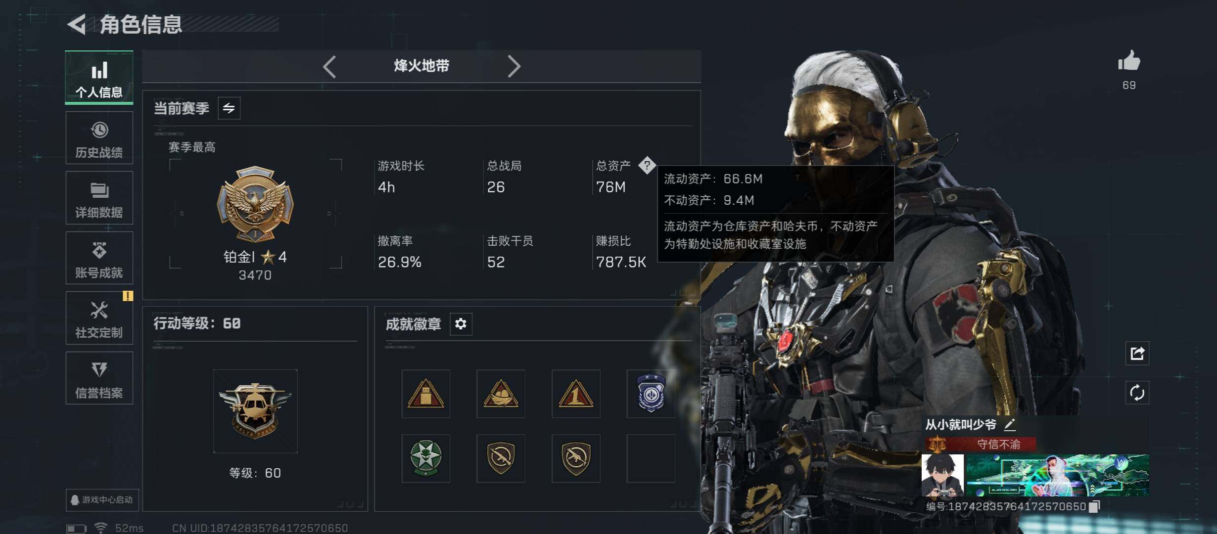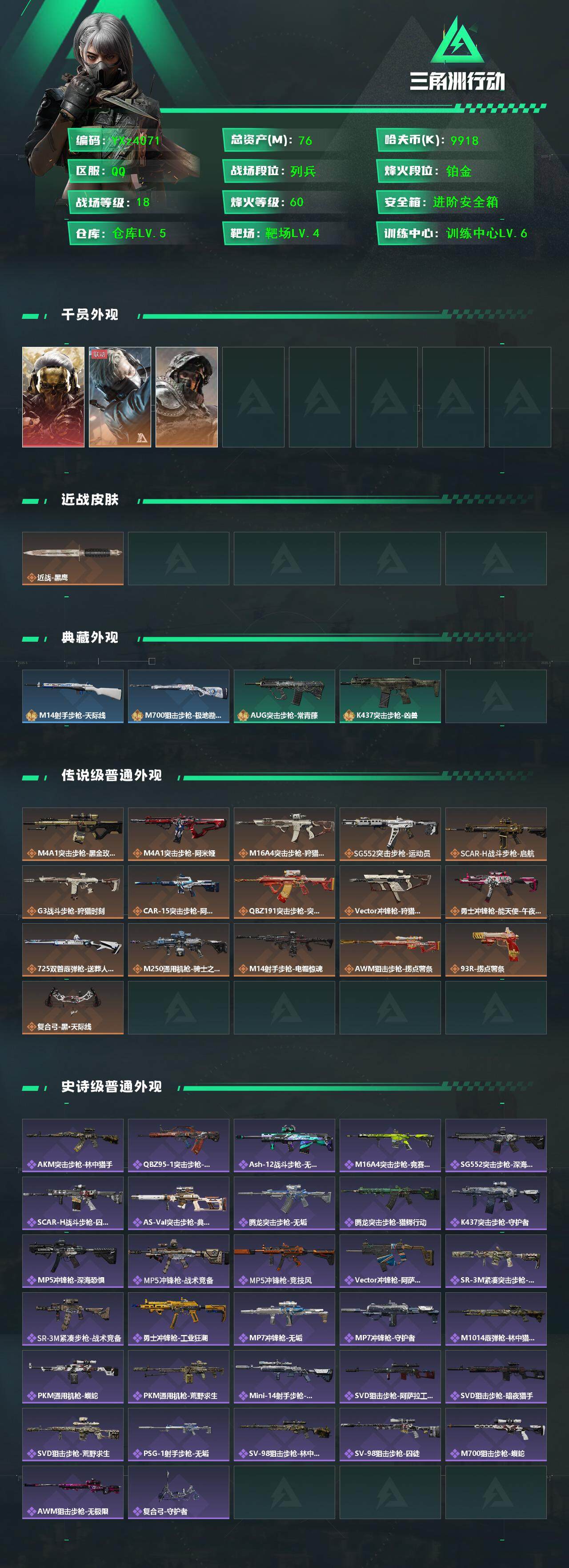 【裸蚀金玫瑰号,76M资产,新手入坑首选】【Q区三端互通】【【无二次协助处理】】YXz4071-特勤处:仓库5级/靶场4级/训练中心6级-总资产76m-哈夫币991w-烽火等级:60级