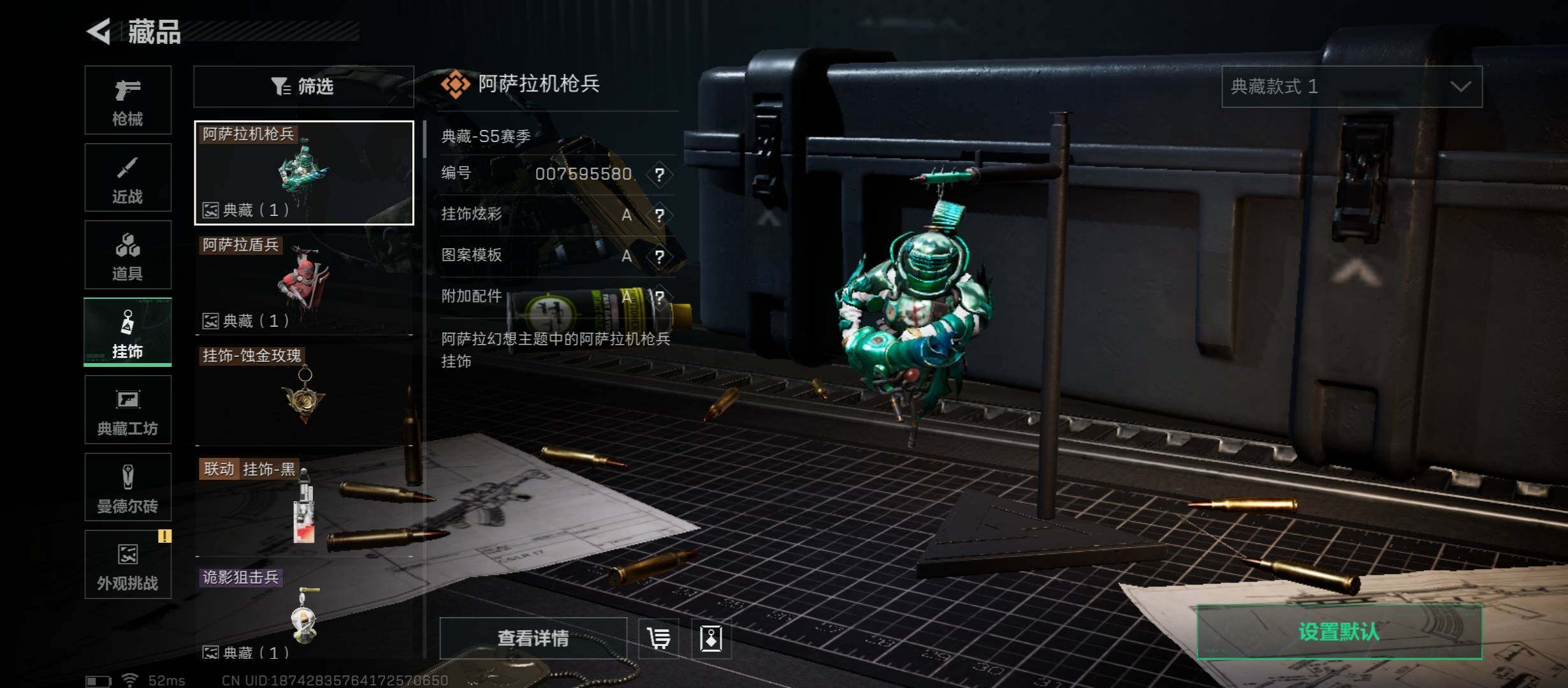 【挂饰】:挂饰-阿萨拉盾兵,挂饰-阿萨拉机枪兵,挂饰-蚀金玫瑰,挂饰-黑,挂饰-演出导演,挂饰-阿萨拉狙击兵,挂饰-阿萨拉霰弹兵,挂饰-诡影狙击兵,挂饰-诡影喷火兵,挂饰-来点薯条,挂饰-狩猎时刻,挂饰-晶石幻想,挂饰-彩蛋,挂饰-启程,挂饰-猎杀本能,挂饰-阿萨拉徽章