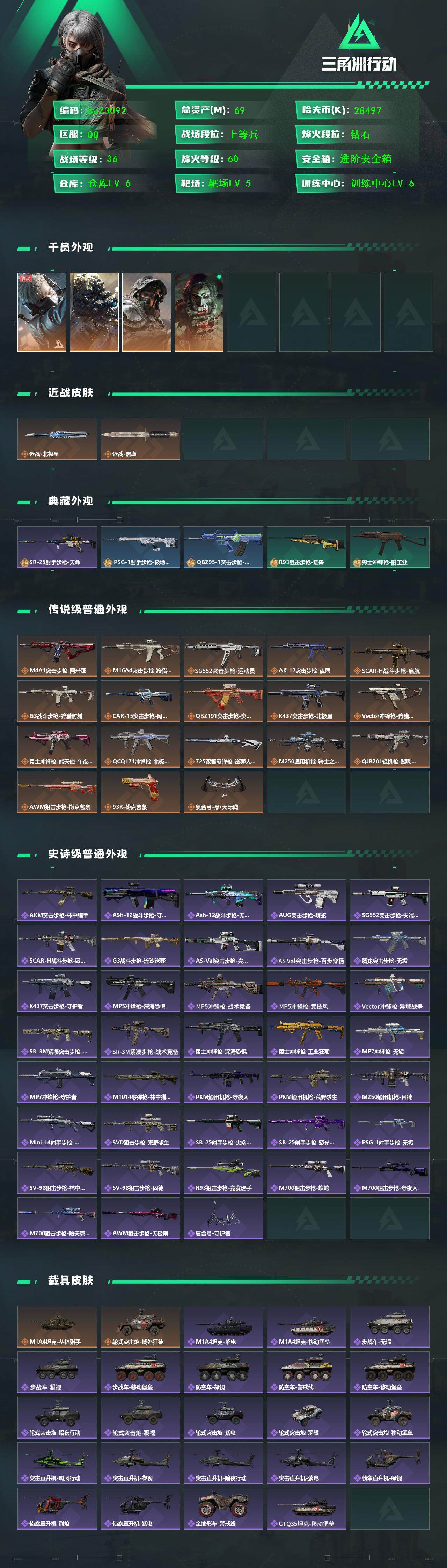 【SJZ3092】总资产(M):69M/哈夫币(K):28497K/哈夫币(K):28497K/全面战场等级:36_段位:上等兵/烽火地带等级:60_段位:钻石/蜂医-送葬人·无题密令/无名-夜鹰/深蓝-不破誓约/红狼-电锯惊魂/近战-北极星/近战-黑鹰/SR-25射手步枪-天命/PSG-1射手步枪-极地勘察队/QBZ95-1突击步枪-海岸线/R93狙击步枪-猛兽/勇士冲锋枪-旧工业/M4A1突击步枪-阿米娅/M16A4突击步枪-狩猎时刻/SG552突击步枪-运动员/AK-12突击步枪-夜鹰/SCAR-H战斗步枪-启航/G3战斗步枪-狩猎时刻/CAR-15突击步枪-阿米娅/腾龙突击步枪-捞点薯条/K437突击步枪-北极星/Vector冲锋枪-狩猎时刻/勇士冲锋枪-能天使-午夜邮差/QCQ171冲锋枪-北极星/725双管霰弹枪-送葬人-无题密令/M250通用机枪-骑士之心/QJB201轻机枪-鹅鸭杀/AWM狙击步枪-捞点薯条/93R-捞点薯条/复合弓-黑·天际线/AKM突击步枪-林中猎手/ASh-12战斗步枪-守夜人/ASh-12战斗步枪-无极限/AUG突击步枪-蝮蛇/SG552突击步枪-尖端治疗/SCAR-H战斗步枪-囚徒/G3战斗步枪-流沙送葬/AS Val突击步枪-尖端治疗/AS Val突击步枪-百步穿杨/腾龙突击步枪-无垢/K437突击步枪-守护者/MP5冲锋枪-深海恐惧/MP5冲锋枪-战术竞备/MP5冲锋枪-竞技风/Vector冲锋枪-异域战争/SR-3M紧凑突击步枪-荒野求生/SR-3M紧凑突击步枪-战术竞备/勇士冲锋枪-深海恐惧/勇士冲锋枪-工业狂潮/MP7冲锋枪-无垢/MP7冲锋枪-守护者/M1014霰弹枪-林中猎手/PKM通用机枪-守夜人/PKM通用机枪-荒野求生/M250通用机枪-囚徒/Mini-14射手步枪-守护者/SVD狙击步枪-荒野求生/SR-25射手步枪-尖端治疗/SR-25射手步枪-聚光灯/PSG-1射手步枪-无垢/SV-98狙击步枪-林中猎手/SV-98狙击步枪-囚徒/R93狙击步枪-竞赛选手/M700狙击步枪-蝮蛇/M700狙击步枪-守夜人/M700狙击步枪-哈夫克警备/AWM狙击步枪-无极限/复合弓-守护者/AKM突击步枪-战术演练/AKM突击步枪-肃杀/QBZ95-1突击步枪-公平竞技/K416突击步枪-虎啸/M16A4突击步枪-远航/M16A4突击步枪-街头涂鸦/M7战斗步枪-捣蛋鬼/SCAR-H战斗步枪-童趣/SCAR-H战斗步枪-远航/SCAR-H战斗步枪-荣耀列队/SCAR-H战斗步枪-黄昏/G3战斗步枪-战术演练/G3战斗步枪-主宰/PTR-32突击步枪-天网/腾龙突击步枪-雪崩/腾龙突击步枪-冰天雪地/MP5冲锋枪-弄臣/MP5冲锋枪-虎啸/MP5冲锋枪-哈夫克卫队/P90冲锋枪-浅鲨小队/P90冲锋枪-新生/P90冲锋枪-黄昏/Vector冲锋枪-先锋/UZI冲锋枪-亚特兰蒂斯/野牛冲锋枪-新生/SMG-45-行动开启/SMG-45冲锋枪-幻影结构/SMG-45冲锋枪-天网/SR-3M紧凑突击步枪-雪崩/勇士冲锋枪-主宰/勇士冲锋枪-冰天雪地/M1014霰弹枪-幻影结构/M1014霰弹枪-童趣/S12K霰弹枪-战术演练/M250通用机枪-虎啸/QJB201轻机枪-远航/QJB201轻机枪-黄昏/QJB201轻机枪-哈夫克卫队/Mini-14射手步枪-荣耀列队/VSS射手步枪-童趣/SKS射手步枪-弄臣/SKS射手步枪-雪崩/SR-25射手步枪-开拓/SR-9射手步枪-街头涂鸦/SV-98狙击步枪-星链科技/SV-98狙击步枪-哈夫克航天/SV-98狙击步枪-精英联盟/R93狙击步枪-远航/G18-星链科技/G18-哈夫克航天/M4A1突击步枪-粉色涂装/M4A1突击步枪-高雅黑/M4A1突击步枪-海色/AKM突击步枪-彩墨喷涂/QBZ95-1突击步枪-高雅黑/QBZ95-1突击步枪-海浪/QBZ95-1突击步枪-海色/K416突击步枪-几何迷彩/K416突击步枪-高雅黑/M16A4突击步枪-三角洲力量/M16A4突击步枪-山林猎人/M16A4突击步枪-高雅黑/AUG突击步枪-浅蓝涂装/AUG突击步枪-落花/M7战斗步枪-红色涂装/M7战斗步枪-落花/SG552突击步枪-浅蓝涂装/SG552突击步枪-海浪/SG552突击步枪-彩墨喷涂/AK-12突击步枪-坚固材料/AK-12突击步枪-落花/SCAR-H战斗步枪-数码迷彩/SCAR-H战斗步枪-电路图/G3战斗步枪-高雅黑/G3战斗步枪-山林猎人/PTR-32突击步枪-坚固材料/PTR-32突击步枪-黄蜂/PTR-32突击步枪-条纹/CAR-15突击步枪-电路图/CAR-15突击步枪-变色龙/腾龙突击步枪-彩墨喷涂/MP5冲锋枪-海色/MP5冲锋枪-黄蜂/P90冲锋枪-落花/P90冲锋枪-电路图/Vector冲锋枪-几何迷彩/UZI冲锋枪-海色/UZI冲锋枪-山林猎人/野牛冲锋枪-彩墨喷涂/野牛冲锋枪-高雅黑/SMG-45冲锋枪-条纹/SR-3M紧凑突击步枪-变色龙/勇士冲锋枪-坚固材料/QCQ171冲锋枪-三角洲力量/M1014霰弹枪-高雅黑/M1014霰弹枪-海浪/725双管霰弹枪-条纹/PKM通用机枪-彩墨喷涂/M249轻机枪-黄蜂/M250通用机枪-条纹/QJB201轻机枪-山林猎人/QJB201轻机枪-磐石/Mini-14射手步枪-山林猎人/SVD狙击步枪-高雅黑/SVD狙击步枪-电路图/M14射手步枪-落花/SKS射手步枪-坚固材料/SR-25射手步枪-黄蜂/SR-9射手步枪-落花/SV-98狙击步枪-红色涂装/SV-98狙击步枪-条纹/R93狙击步枪-变色龙/M700狙击步枪-山林猎人/QSZ92G-电路图/QSZ92G-条纹/沙漠之鹰-海浪/沙漠之鹰-高雅黑/M1911-坚固材料/M1A4坦克-丛林猎手/轮式突击炮-域外狂徒/M1A4坦克-紫电/M1A4坦克-移动堡垒/步战车-无瑕/步战车-凝视/步战车-移动堡垒/防空车-凝视/防空车-警戒线/防空车-移动堡垒/轮式突击炮-暗夜行动/轮式突击炮-凝视/轮式突击炮-紫电/轮式突击炮-荣耀/轮式突击炮-移动堡垒/突击直升机-飓风行动/突击直升机-凝视/突击直升机-暗夜行动/突击直升机-紫电/侦察直升机-凝视/侦察直升机-烈焰/侦察直升机-紫电/全地形车-警戒线/GTQ35坦克-移动堡垒/军牌-北极星/军牌-虚拟世界/军牌-夜鹰/军牌-捞点薯条/军牌-猎杀本能/军牌-失重/军牌-送葬人·无题密令/军牌-猫咪/军牌-三角小子/军牌-装备修理/军牌-静谧时光/军牌-展示/军牌-享受音乐/军牌-永恒/军牌-夕阳/军牌-零号大坝/军牌-来点薯条/军牌-修整/军牌-钻石皇后酒店/军牌-神秘艺术/军牌-