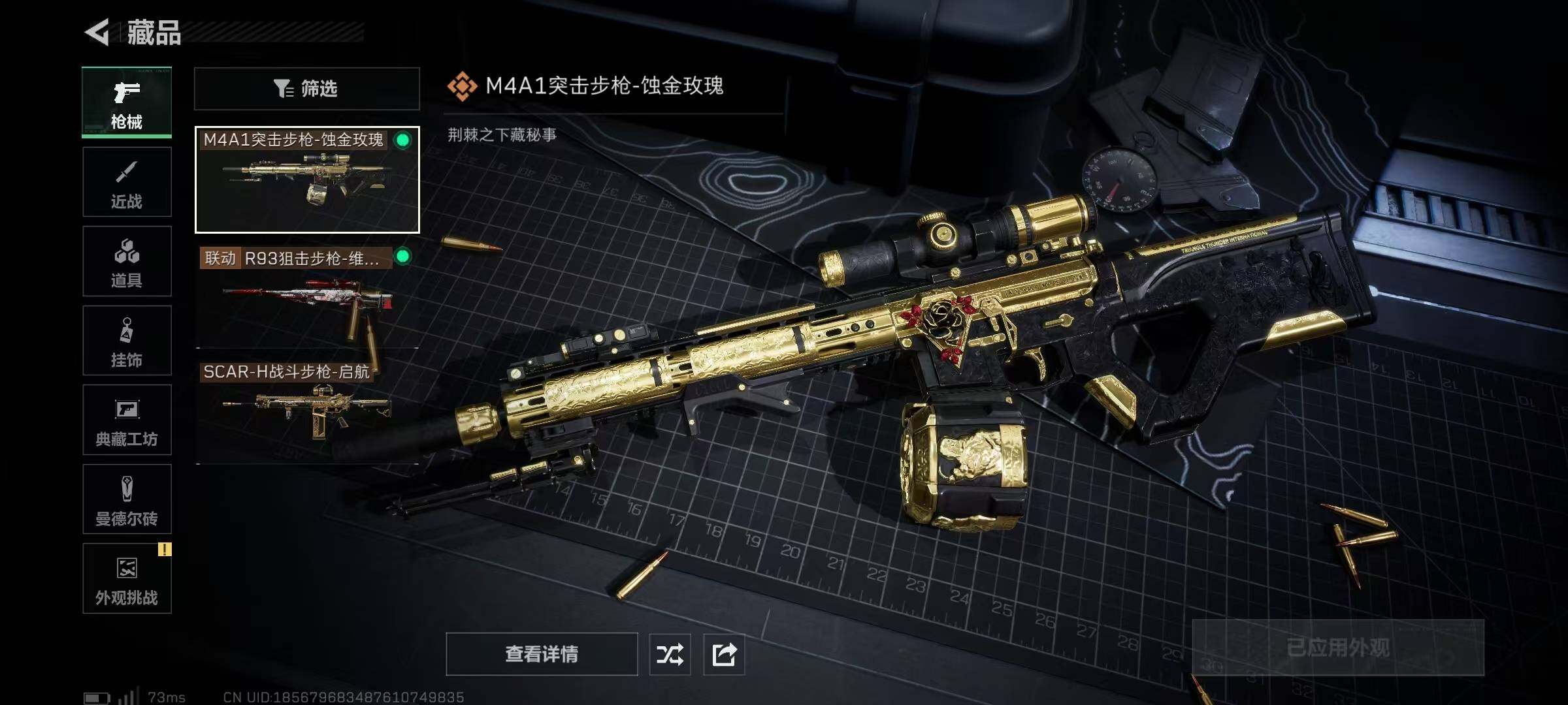 【传说级普通外观】:M4A1突击步枪-蚀金玫瑰,SCAR-H战斗步枪-启航,R93狙击步枪-维什戴尔