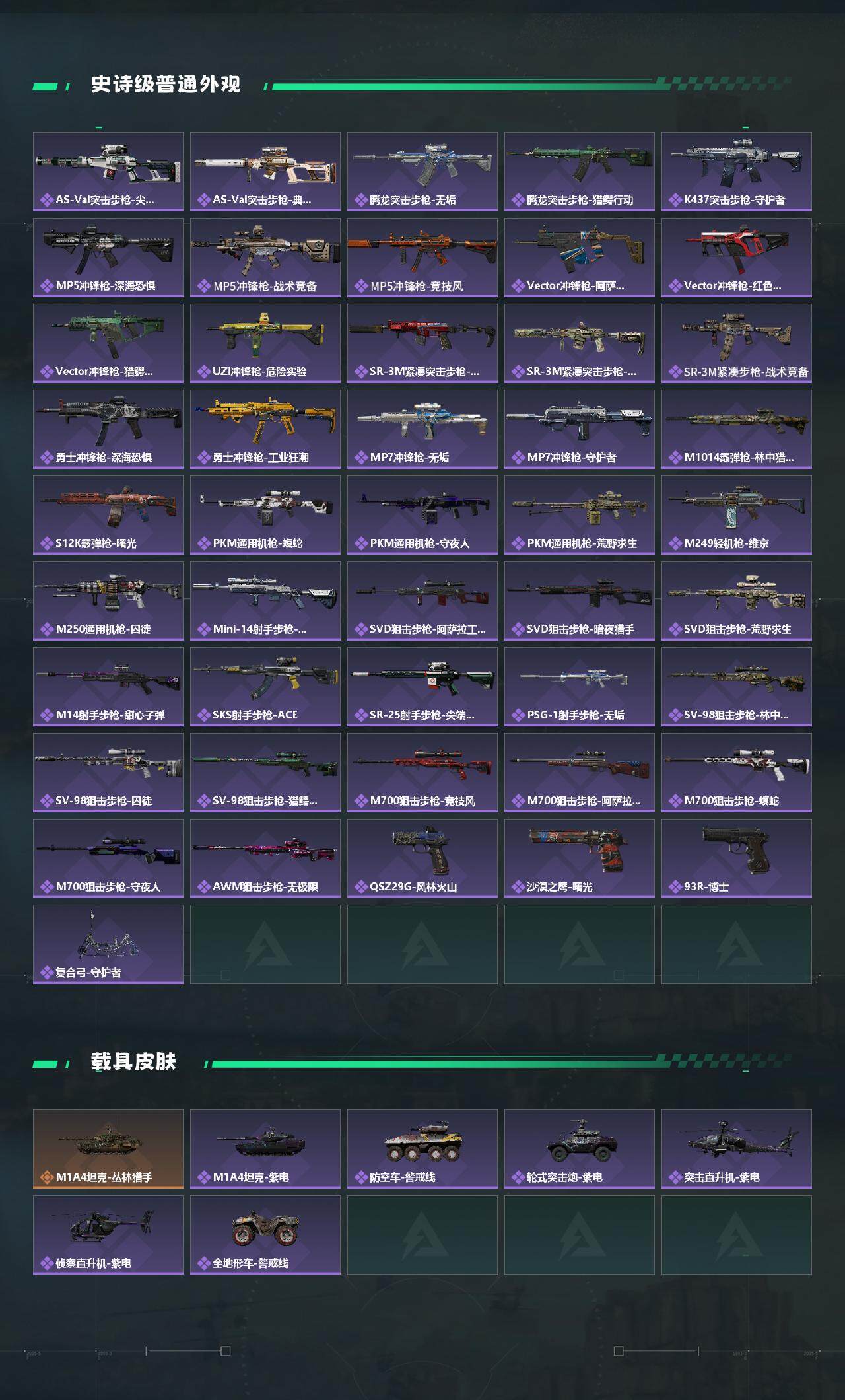 【史诗级普通外观】:M4A1突击步枪-特勤执行,AKM突击步枪-林中猎手,QBZ95-1突击步枪-曙光,QBZ95-1突击步枪-ACE,ASh-12战斗步枪-守夜人,ASh-12战斗步枪-无极限,K416突击步枪-竞技风,M16A4突击步枪-竞赛选手,AUG突击步枪-蝮蛇,AUG突击步枪-特勤执行,SG552突击步枪-尖端治疗,SG552突击步枪-深海恐惧,SCAR-H战斗步枪-国风,SCAR-H战斗步枪-猎鳄行动,SCAR-H战斗步枪-危险实验,SCAR-H战斗步枪-囚徒,G3战斗步枪-阿萨拉工艺,G3战斗步枪-战场英杰,PTR-32突击步枪-ACE,AS Val突击步枪-刀锋,AS Val突击步枪-尖端治疗,AS Val突击步枪-典狱官,腾龙突击步枪-无垢,腾龙突击步枪-猎鳄行动,K437突击步枪-守护者,MP5冲锋枪-深海恐惧,MP5冲锋枪-战术竞备,MP5冲锋枪-竞技风,Vector冲锋枪-阿萨拉文明,Vector冲锋枪-红色彗星,Vector冲锋枪-猎鳄行动,UZI冲锋枪-危险实验,SR-3M紧凑突击步枪-英雄,SR-3M紧凑突击步枪-荒野求生,SR-3M紧凑突击步枪-战术竞备,勇士冲锋枪-深海恐惧,勇士冲锋枪-工业狂潮,MP7冲锋枪-无垢,MP7冲锋枪-守护者,M1014霰弹枪-林中猎手,S12K霰弹枪-曙光,PKM通用机枪-蝮蛇,PKM通用机枪-守夜人,PKM通用机枪-荒野求生,M249轻机枪-维京,M250通用机枪-囚徒,Mini-14射手步枪-守护者,SVD狙击步枪-阿萨拉工艺,SVD狙击步枪-暗夜猎手,SVD狙击步枪-荒野求生,M14射手步枪-甜心子弹,SKS射手步枪-ACE,SR-25射手步枪-尖端治疗,PSG-1射手步枪-无垢,SV-98狙击步枪-林中猎手,SV-98狙击步枪-囚徒,SV-98狙击步枪-猎鳄行动,M700狙击步枪-竞技风,M700狙击步枪-阿萨拉工艺,M700狙击步枪-蝮蛇,M700狙击步枪-守夜人,AWM狙击步枪-无极限,QSZ92G-风林火山,沙漠之鹰-曙光,93R-博士,复合弓-守护者