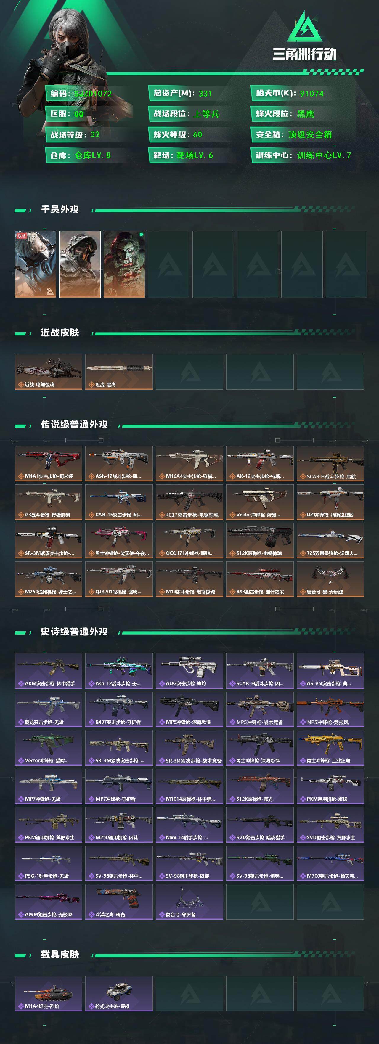 【SJZD1072】总资产(M):331M/哈夫币(K):91074K/哈夫币(K):91074K/全面战场等级:32_段位:上等兵/烽火地带等级:60_段位:黑鹰/蜂医-送葬人·无题密令/深蓝-不破誓约/红狼-电锯惊魂/近战-电锯惊魂/近战-黑鹰/M4A1突击步枪-阿米娅/ASh-12战斗步枪-鹅鸭杀/M16A4突击步枪-狩猎时刻/AK-12突击步枪-特斯拉线圈/SCAR-H战斗步枪-启航/G3战斗步枪-狩猎时刻/CAR-15突击步枪-阿米娅/KC17突击步枪-电锯惊魂/Vector冲锋枪-狩猎时刻/UZI冲锋枪-特斯拉线圈/SR-3M紧凑突击步枪-特斯拉线圈/勇士冲锋枪-能天使-午夜邮差/QCQ171冲锋枪-鹅鸭杀/S12K霰弹枪-电锯惊魂/725双管霰弹枪-送葬人-无题密令/M250通用机枪-骑士之心/QJB201轻机枪-鹅鸭杀/M14射手步枪-电锯惊魂/R93狙击步枪-维什戴尔/复合弓-黑·天际线/AKM突击步枪-林中猎手/ASh-12战斗步枪-无极限/AUG突击步枪-蝮蛇/SCAR-H战斗步枪-囚徒/AS Val突击步枪-典狱官/腾龙突击步枪-无垢/K437突击步枪-守护者/MP5冲锋枪-深海恐惧/MP5冲锋枪-战术竞备/MP5冲锋枪-竞技风/Vector冲锋枪-猎鳄行动/SR-3M紧凑突击步枪-荒野求生/SR-3M紧凑突击步枪-战术竞备/勇士冲锋枪-深海恐惧/勇士冲锋枪-工业狂潮/MP7冲锋枪-无垢/MP7冲锋枪-守护者/M1014霰弹枪-林中猎手/S12K霰弹枪-曙光/PKM通用机枪-蝮蛇/PKM通用机枪-荒野求生/M250通用机枪-囚徒/Mini-14射手步枪-守护者/SVD狙击步枪-暗夜猎手/SVD狙击步枪-荒野求生/PSG-1射手步枪-无垢/SV-98狙击步枪-林中猎手/SV-98狙击步枪-囚徒/SV-98狙击步枪-猎鳄行动/M700狙击步枪-哈夫克警备/AWM狙击步枪-无极限/沙漠之鹰-曙光/复合弓-守护者/野牛冲锋枪-黑潮/M4A1突击步枪-精英联盟/AKM突击步枪-战术演练/AKM突击步枪-肃杀/QBZ95-1突击步枪-公平竞技/K416突击步枪-虎啸/M16A4突击步枪-街头涂鸦/M7战斗步枪-捣蛋鬼/AK-12突击步枪-前沿科技/SCAR-H战斗步枪-荣耀列队/SCAR-H战斗步枪-黄昏/G3战斗步枪-战术演练/G3战斗步枪-主宰/PTR-32突击步枪-天网/腾龙突击步枪-雪崩/腾龙突击步枪-精英联盟/腾龙突击步枪-前沿科技/腾龙突击步枪-冰天雪地/K437突击步枪-天狼星/MP5冲锋枪-弄臣/MP5冲锋枪-虎啸/MP5冲锋枪-哈夫克卫队/P90冲锋枪-浅鲨小队/P90冲锋枪-黄昏/P90冲锋枪-捣蛋鬼/Vector冲锋枪-先锋/UZI冲锋枪-亚特兰蒂斯/SMG-45-行动开启/SMG-45冲锋枪-幻影结构/SMG-45冲锋枪-天网/SR-3M紧凑突击步枪-雪崩/勇士冲锋枪-前沿科技/勇士冲锋枪-精英联盟/勇士冲锋枪-冰天雪地/M1014霰弹枪-幻影结构/S12K霰弹枪-战术演练/M250通用机枪-虎啸/M250通用机枪-天网/QJB201轻机枪-黄昏/QJB201轻机枪-哈夫克卫队/Mini-14射手步枪-荣耀列队/SKS射手步枪-弄臣/SKS射手步枪-雪崩/SR-25射手步枪-开拓/SV-98狙击步枪-星链科技/SV-98狙击步枪-哈夫克航天/SV-98狙击步枪-精英联盟/G18-星链科技/G18-哈夫克航天/M700狙击步枪-纯白涂装/M4A1突击步枪-粉色涂装/M4A1突击步枪-高雅黑/M4A1突击步枪-海色/AKM突击步枪-彩墨喷涂/QBZ95-1突击步枪-高雅黑/QBZ95-1突击步枪-海浪/QBZ95-1突击步枪-海色/QBZ191突击步枪-三角洲力量/K416突击步枪-几何迷彩/K416突击步枪-高雅黑/M16A4突击步枪-山林猎人/M16A4突击步枪-高雅黑/AUG突击步枪-浅蓝涂装/M7战斗步枪-红色涂装/SG552突击步枪-浅蓝涂装/SG552突击步枪-海浪/SG552突击步枪-彩墨喷涂/AK-12突击步枪-落花/SCAR-H战斗步枪-红色涂装/SCAR-H战斗步枪-数码迷彩/SCAR-H战斗步枪-电路图/G3战斗步枪-高雅黑/G3战斗步枪-山林猎人/PTR-32突击步枪-黄蜂/PTR-32突击步枪-条纹/CAR-15突击步枪-电路图/腾龙突击步枪-彩墨喷涂/MP5冲锋枪-海色/MP5冲锋枪-黄蜂/P90冲锋枪-电路图/Vector冲锋枪-几何迷彩/UZI冲锋枪-海色/UZI冲锋枪-山林猎人/野牛冲锋枪-彩墨喷涂/野牛冲锋枪-高雅黑/SMG-45冲锋枪-条纹/QCQ171冲锋枪-三角洲力量/M1014霰弹枪-高雅黑/M1014霰弹枪-海浪/725双管霰弹枪-条纹/PKM通用机枪-彩墨喷涂/M249轻机枪-黄蜂/M250通用机枪-条纹/QJB201轻机枪-三角洲力量/QJB201轻机枪-山林猎人/Mini-14射手步枪-山林猎人/SVD狙击步枪-高雅黑/SVD狙击步枪-电路图/SR-25射手步枪-黄蜂/SV-98狙击步枪-红色涂装/SV-98狙击步枪-条纹/M700狙击步枪-山林猎人/QSZ92G-电路图/QSZ92G-条纹/沙漠之鹰-海浪/沙漠之鹰-高雅黑/M1911-坚固材料/M1A4坦克-烈焰/轮式突击炮-荣耀/军牌-飞驰/军牌-猎杀本能/军牌-特斯拉线圈/军牌-失重/军牌-送葬人·无题密令/军牌-猫咪/军牌-装备修理/军牌-静谧时光/军牌-展示/军牌-享受音乐/军牌-永恒/军牌-零号大坝/军牌-肥柴集合/军牌-来点薯条/军牌-修整/军牌-神秘艺术/军牌-幸福国/军牌-信誉优秀/军牌-下午茶/军牌-小心鳄鱼/挂饰-阿萨拉机枪兵/挂饰-比利的面具/挂饰-黑/挂饰-崩岩重炮/挂饰-磁吸炸弹/挂饰-特斯拉线圈/挂饰-狩猎时刻/挂饰-晶石幻想/挂饰-枪匠/挂饰-彩蛋/挂饰-启程/挂饰-猎杀本能【登录方式: QQ登录】