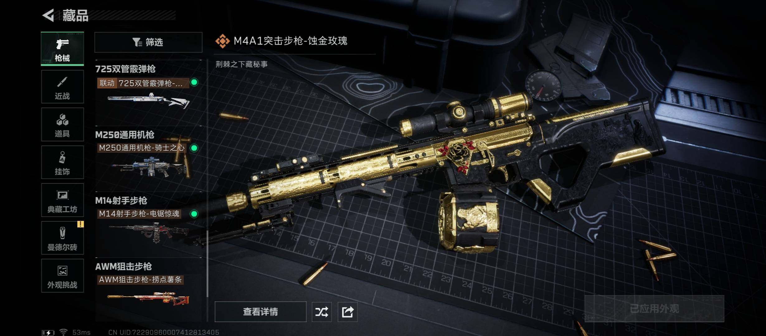 【典藏外观】:AWM狙击步枪-私人定制,AKM突击步枪-阿萨拉卫队,AKM突击步枪-青纹,AK-12突击步枪-青纹,QBZ95-1突击步枪-花岗岩,AUG突击步枪-花岗岩,Vector冲锋枪-花岗岩,MP5冲锋枪-星之彩,P90冲锋枪-星之彩,SG552突击步枪-天际线,QBZ95-1突击步枪-海岸线,UZI冲锋枪-蛇纹涂装,M14射手步枪-蛇纹涂装,AKM突击步枪-黄铜,CAR-15突击步枪-监察,K437突击步枪-凶兽