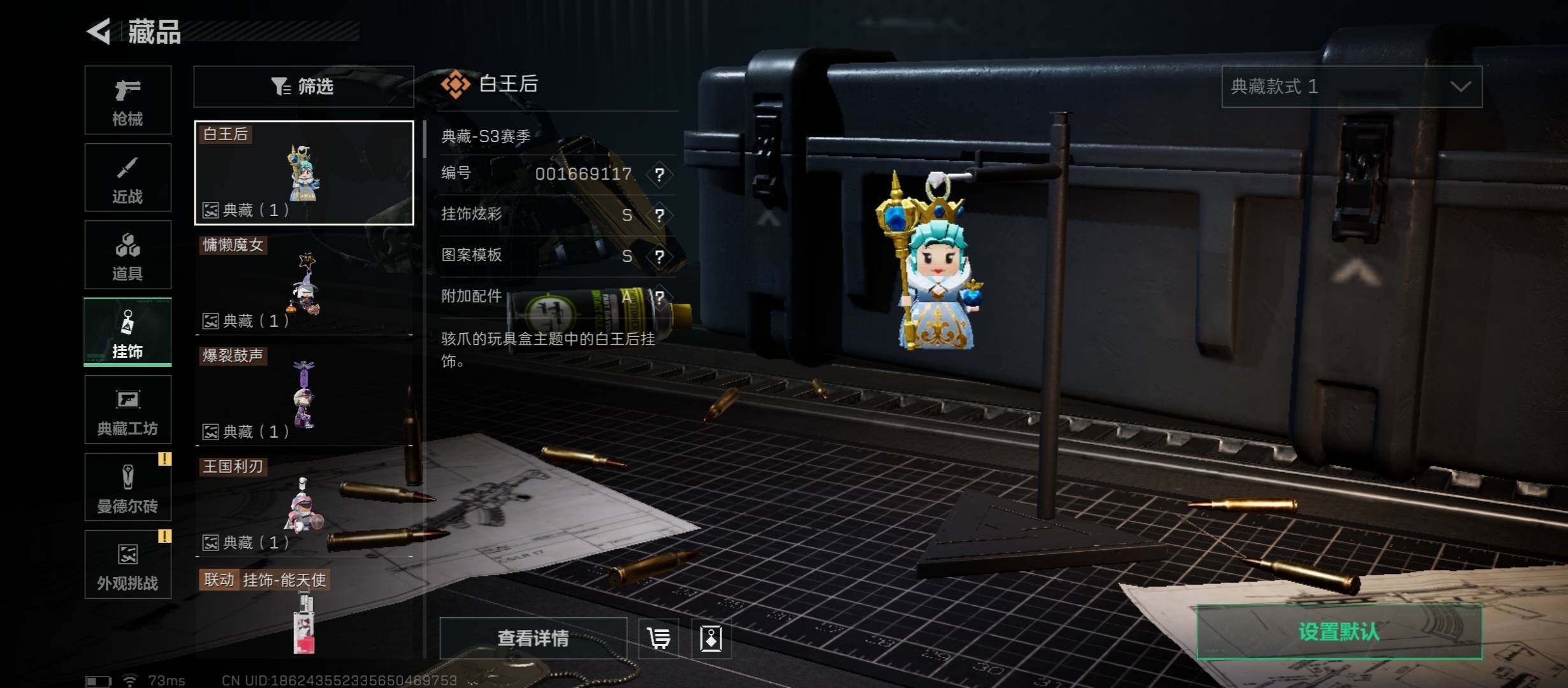 【挂饰】:挂饰-白王后,挂饰-王国利刃,挂饰-慵懒魔女,挂饰-爆裂鼓声,挂饰-能天使,挂饰-影锋,挂饰-北极星,挂饰-黄金坦克,挂饰-蚀金玫瑰,挂饰-黑,挂饰-阿萨拉狙击兵,挂饰-诡影狙击兵,挂饰-诡影喷火兵,挂饰-特斯拉线圈,挂饰-晶石幻想,挂饰-保持专注,挂饰-枪匠,挂饰-彩蛋,挂饰-小羊,挂饰-Relink,挂饰-维京,挂饰-王牌座驾,挂饰-启程,挂饰-阿萨拉徽章