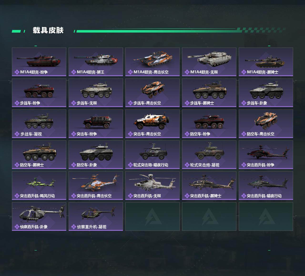 【载具皮肤】:M1A4坦克-纷争,M1A4坦克-狮王,M1A4坦克-鹰击长空,M1A4坦克-无瑕,M1A4坦克-黑骑士,步战车-纷争,步战车-无瑕,步战车-鹰击长空,步战车-黑骑士,步战车-卦象,步战车-凝视,突击车-纷争,突击车-鹰击长空,防空车-纷争,防空车-鹰击长空,防空车-黑骑士,防空车-卦象,轮式突击炮-暗夜行动,轮式突击炮-凝视,突击直升机-纷争,突击直升机-飓风行动,突击直升机-鹰击长空,突击直升机-无瑕,突击直升机-黑骑士,突击直升机-暗夜行动,侦察直升机-卦象,侦察直升机-凝视