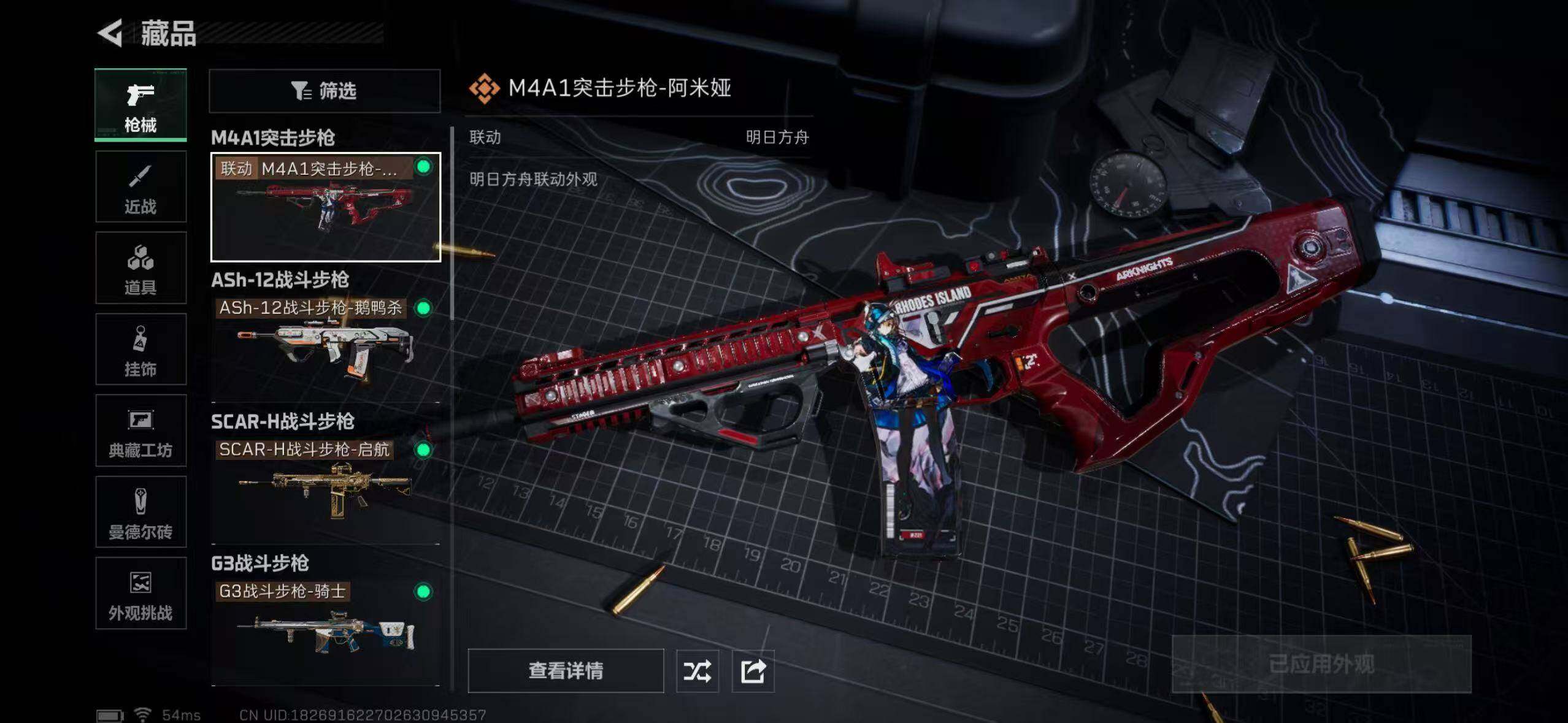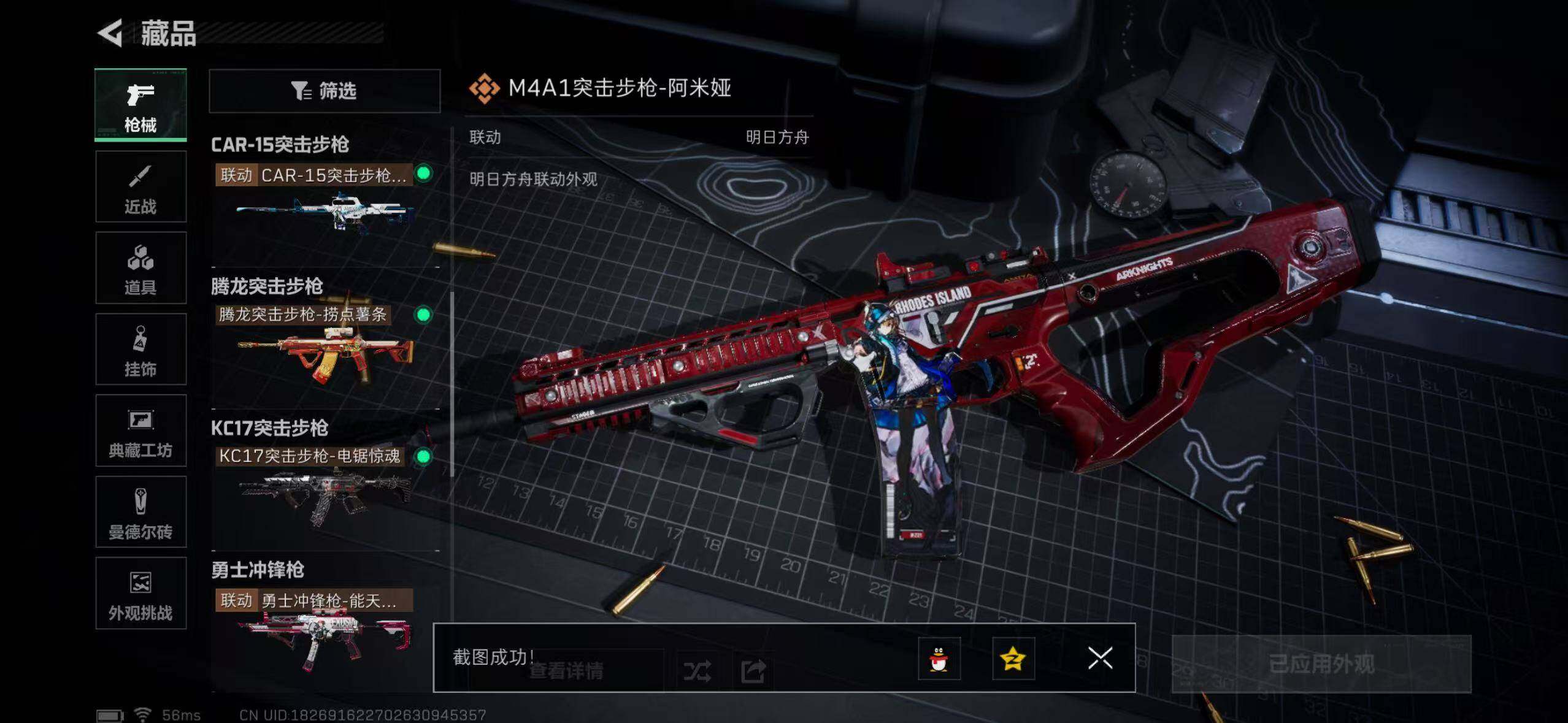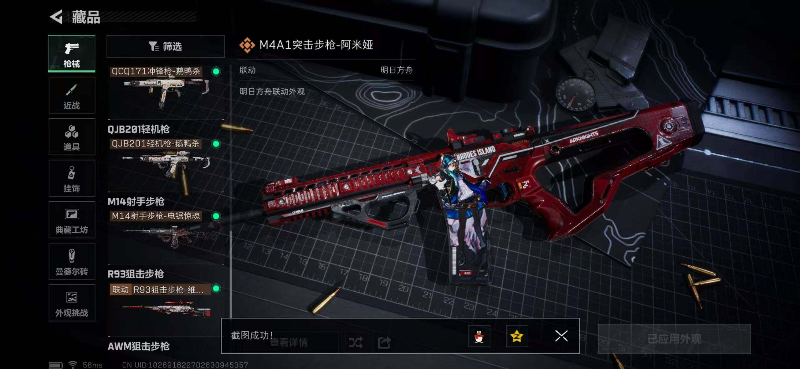 【传说外观】:M4A1突击步枪-阿米娅,ASh-12战斗步枪-鹅鸭杀,SCAR-H战斗步枪-启航,G3战斗步枪-骑士,CAR-15突击步枪-阿米娅,腾龙突击步枪-捞点薯条,KC17突击步枪-电锯惊魂,勇士冲锋枪-能天使-午夜邮差,QCQ171冲锋枪-鹅鸭杀,QJB201轻机枪-鹅鸭杀,M14射手步枪-电锯惊魂,R93狙击步枪-维什戴尔,AWM狙击步枪-捞点薯条,93R-捞点薯条