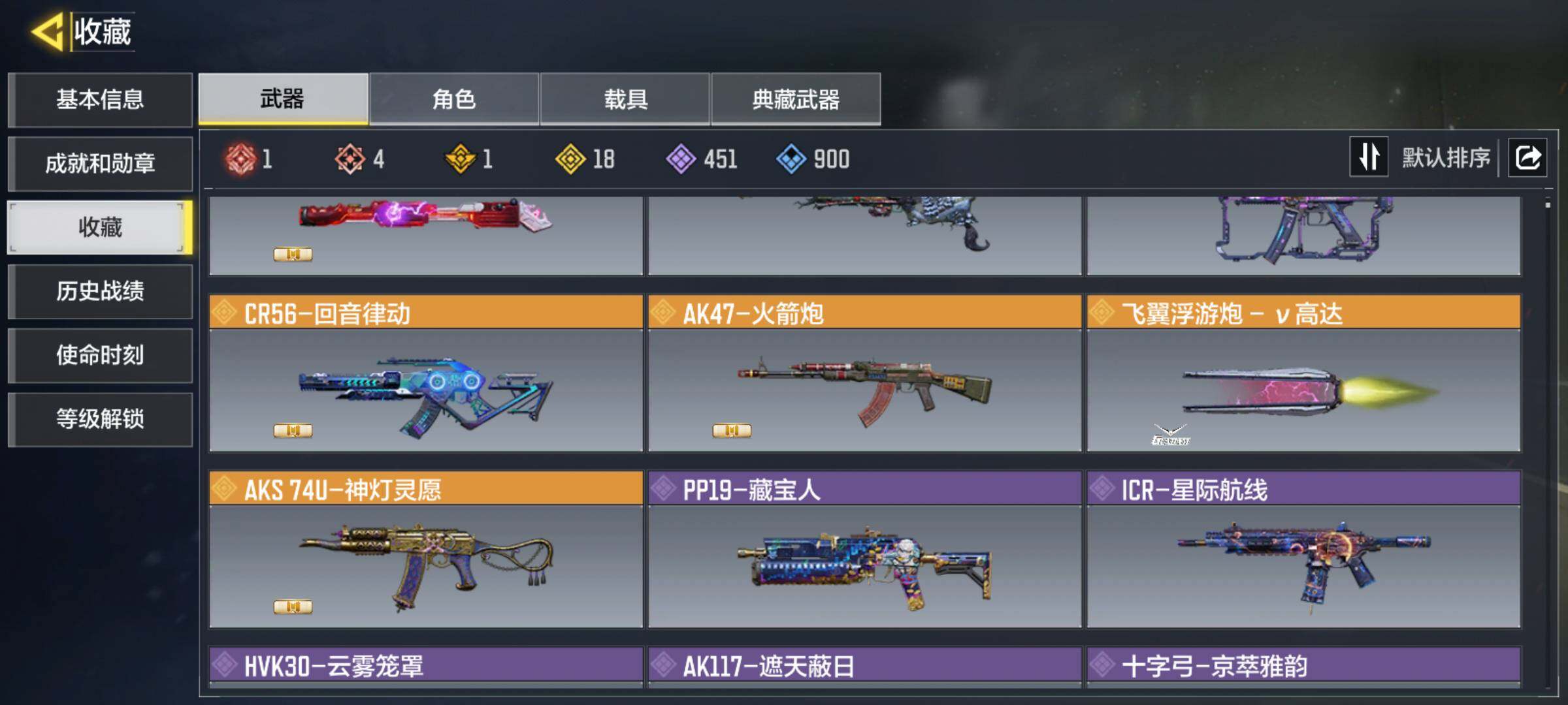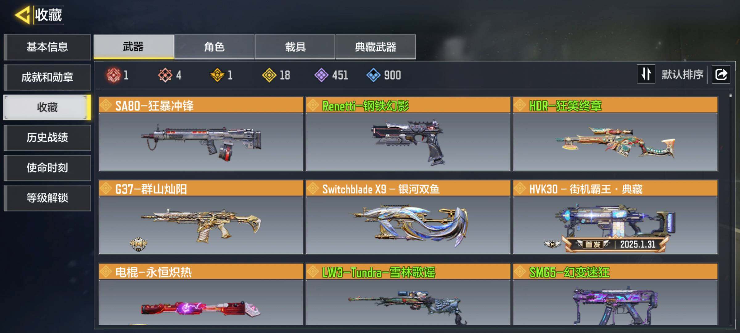 【传说武器】:M4-皇家黑魂,Type25-赤焰复仇,M4-愚人小丑,DRH-蝮蛇潜渊,M13-花晨月夕,SA80-狂暴冲锋,HDR-狂笑终章,Renetti-钢铁幻影,G37-群山灿阳,Switchblade X9-银河双鱼,电棍-永恒炽热,LW3-Tundra-雪林歌谣,SMG5-幻变迷狂,CR56-回音律动,AK47-火箭炮