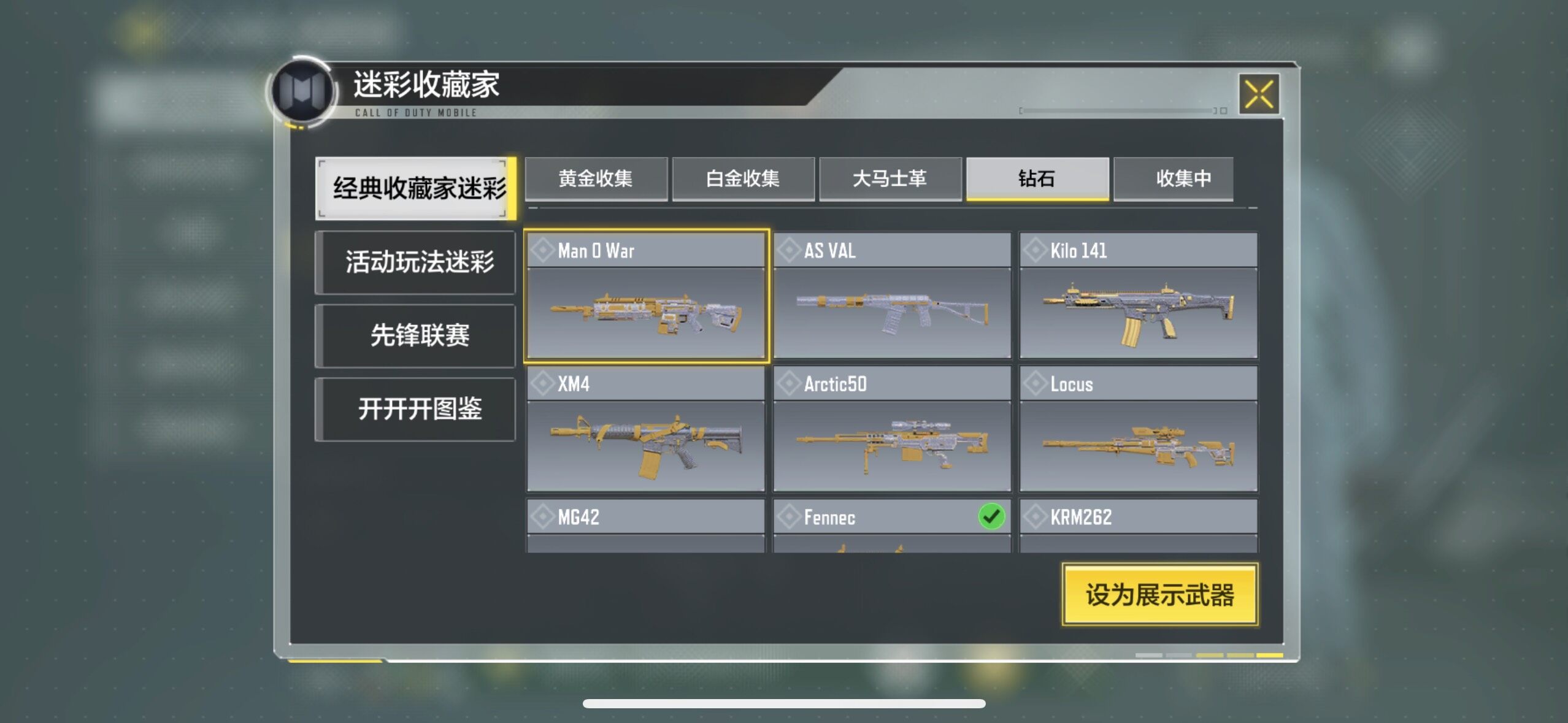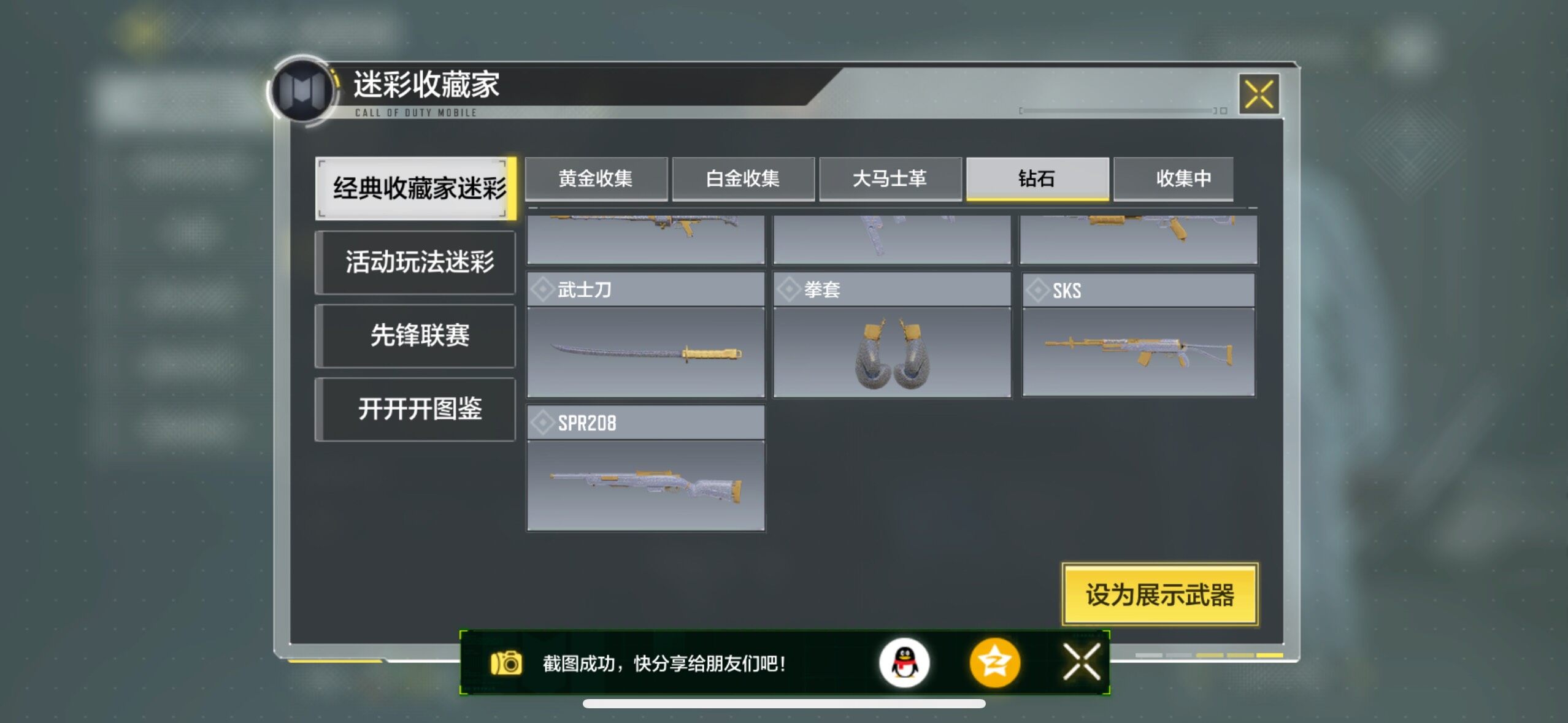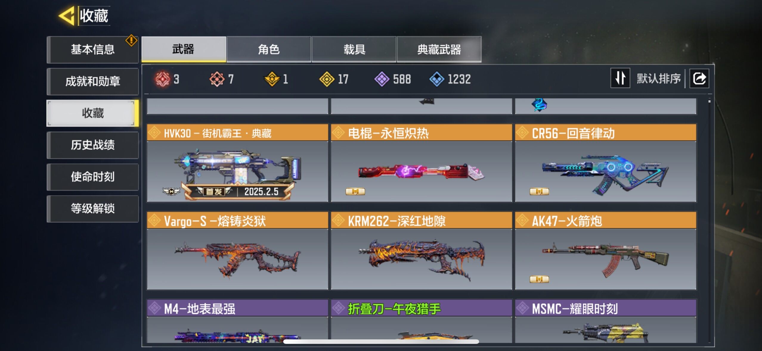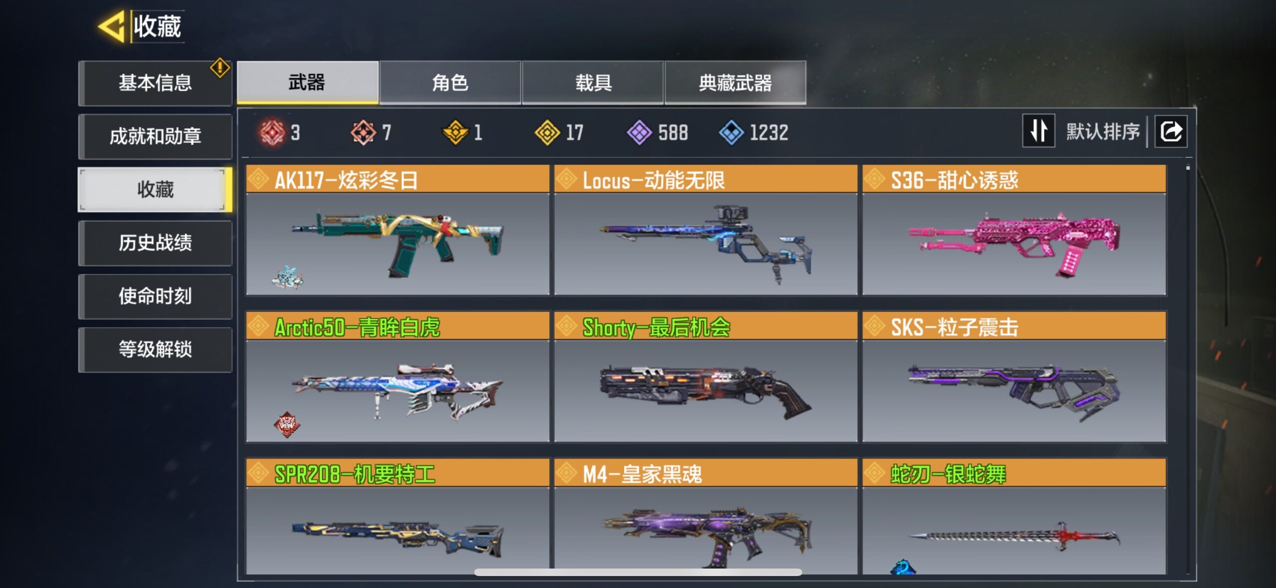 ,MG42-永别,XM4-天策含光,Krig6-冰霜巨龙,AS VAL-双刃剑圣,Kilo141-暗夜奏鸣曲,Fennec-无畏,AK117-熔岩,Man 0 War-灵魂低语,AK117-炫彩冬日,Locus-动能无限,SPR208-机要特工,Arctic50-青眸白虎,Shorty-最后机会,蛇刃-银蛇舞,SKS-粒子震击,HVK30-街机霸王·典藏,幻影-不朽传说,幽灵-复仇行动【按实名: 可二次】