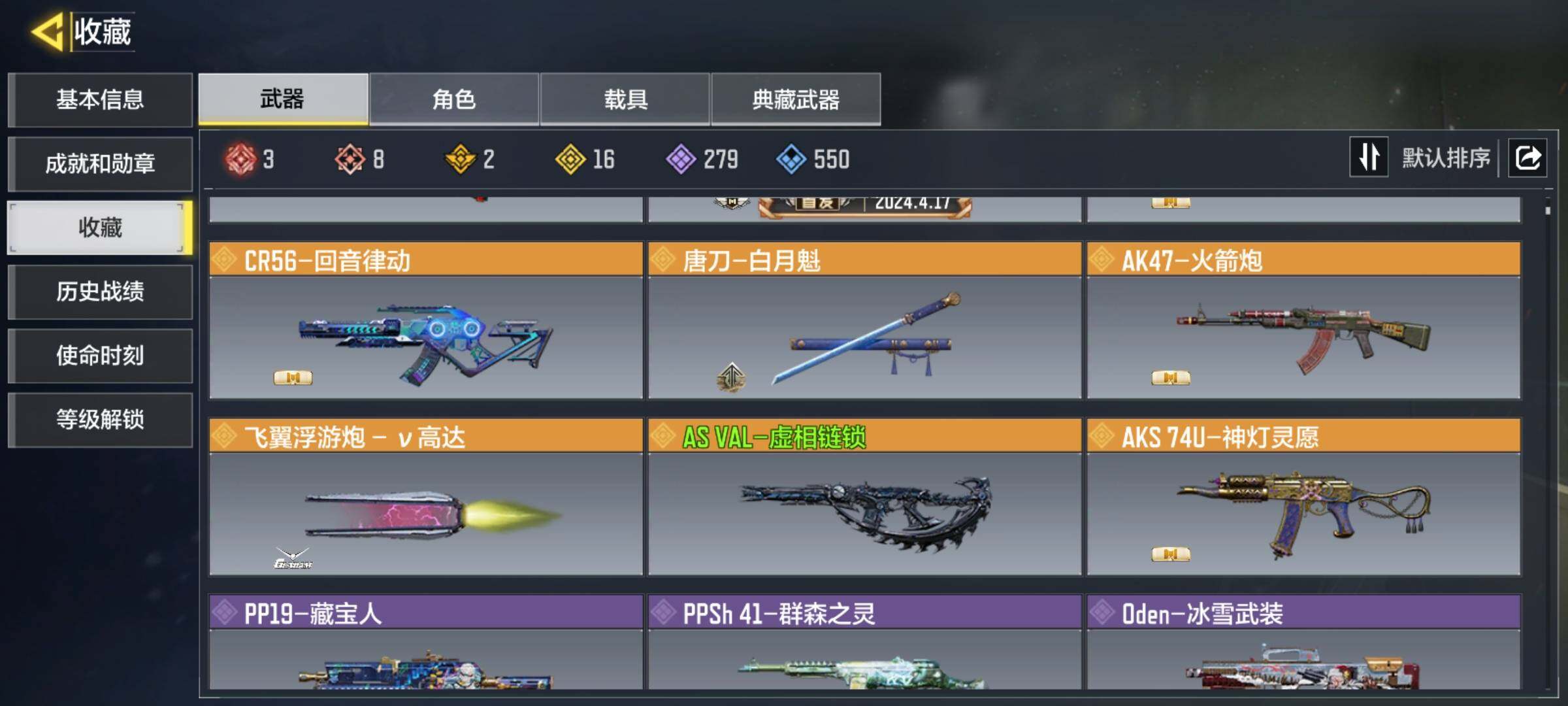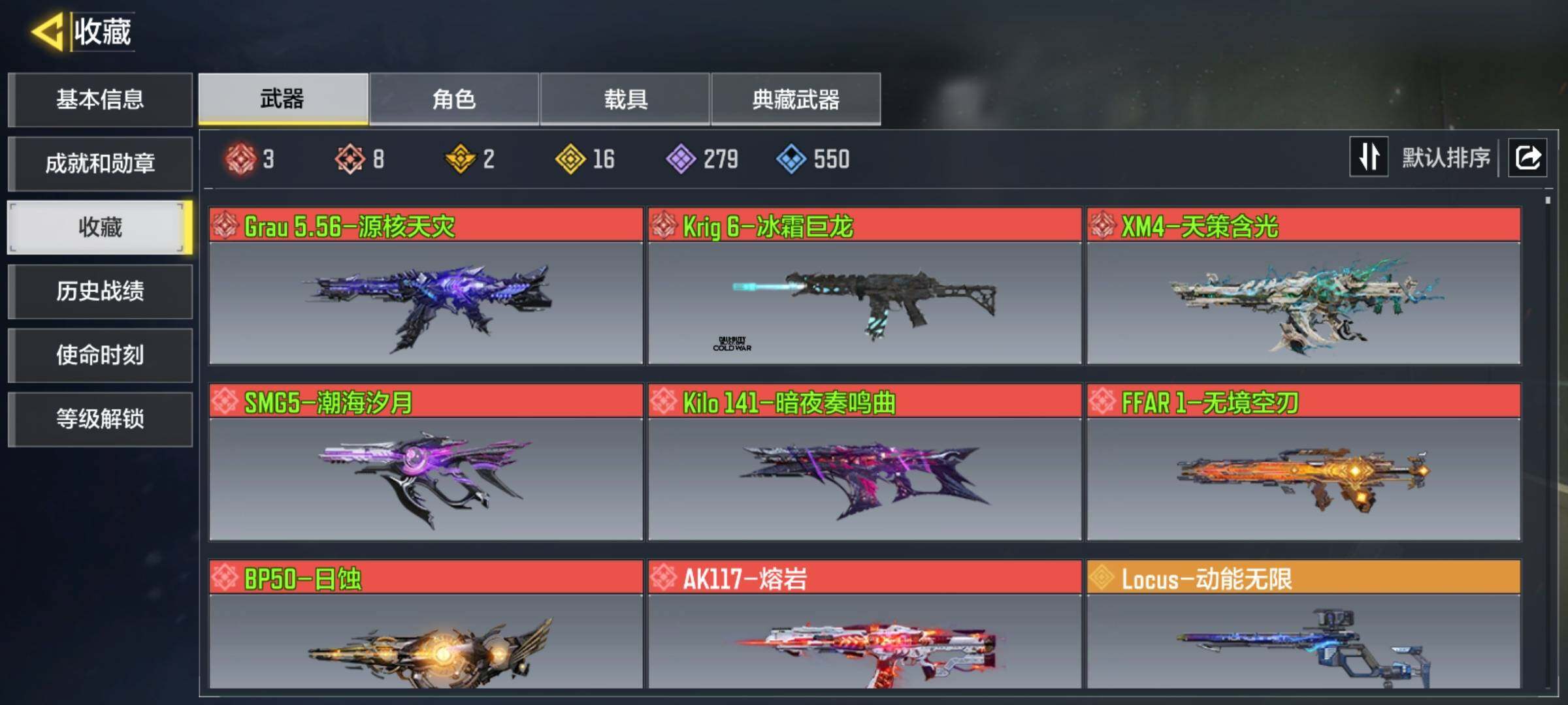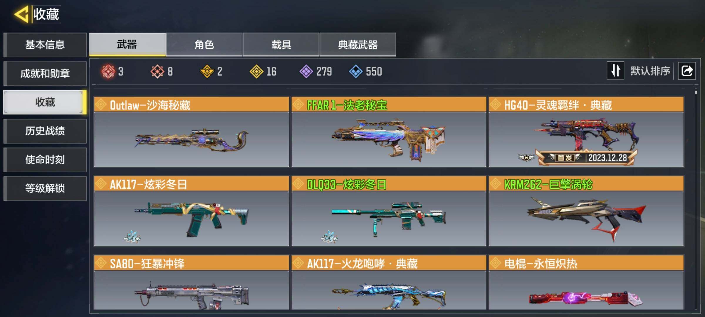 ,HG40-灵魂羁绊·典藏,AK117-火龙咆哮·典藏,Krig6-冰霜巨龙,Grau 5.56-源核天灾,XM4-天策含光,Kilo141-暗夜奏鸣曲,SMG5-潮海汐月,FFAR 1-无境空刃,BP50-日蚀,AK117-熔岩,Locus-动能无限,KRM262-巨擎涡轮,DLQ33-炫彩冬日,AK117-炫彩冬日,唐刀-白月魁,FFAR 1-法老秘宝【按实名: 可二次】