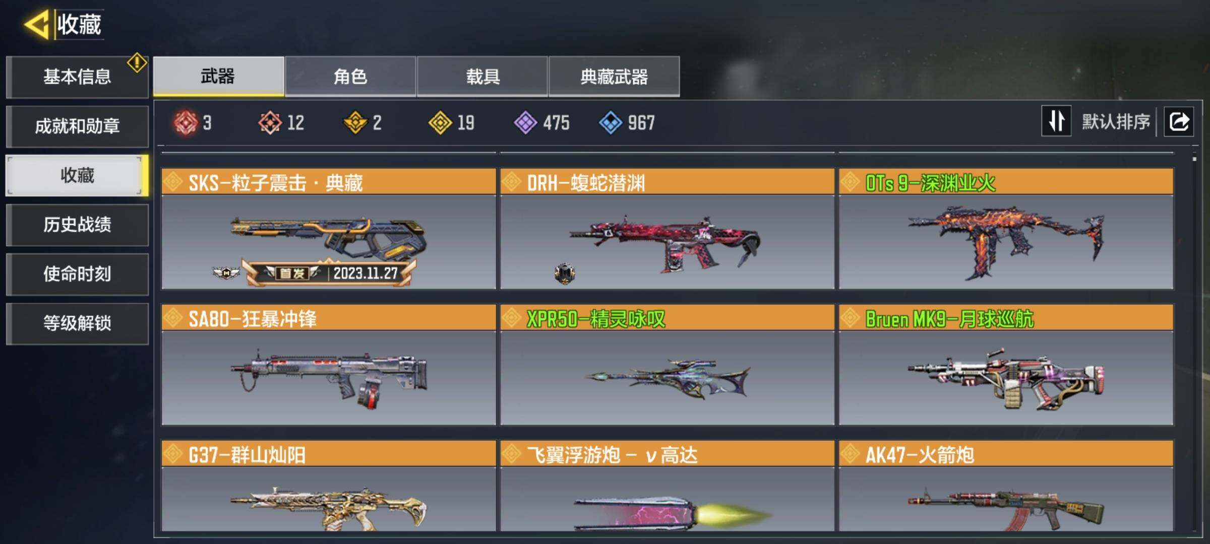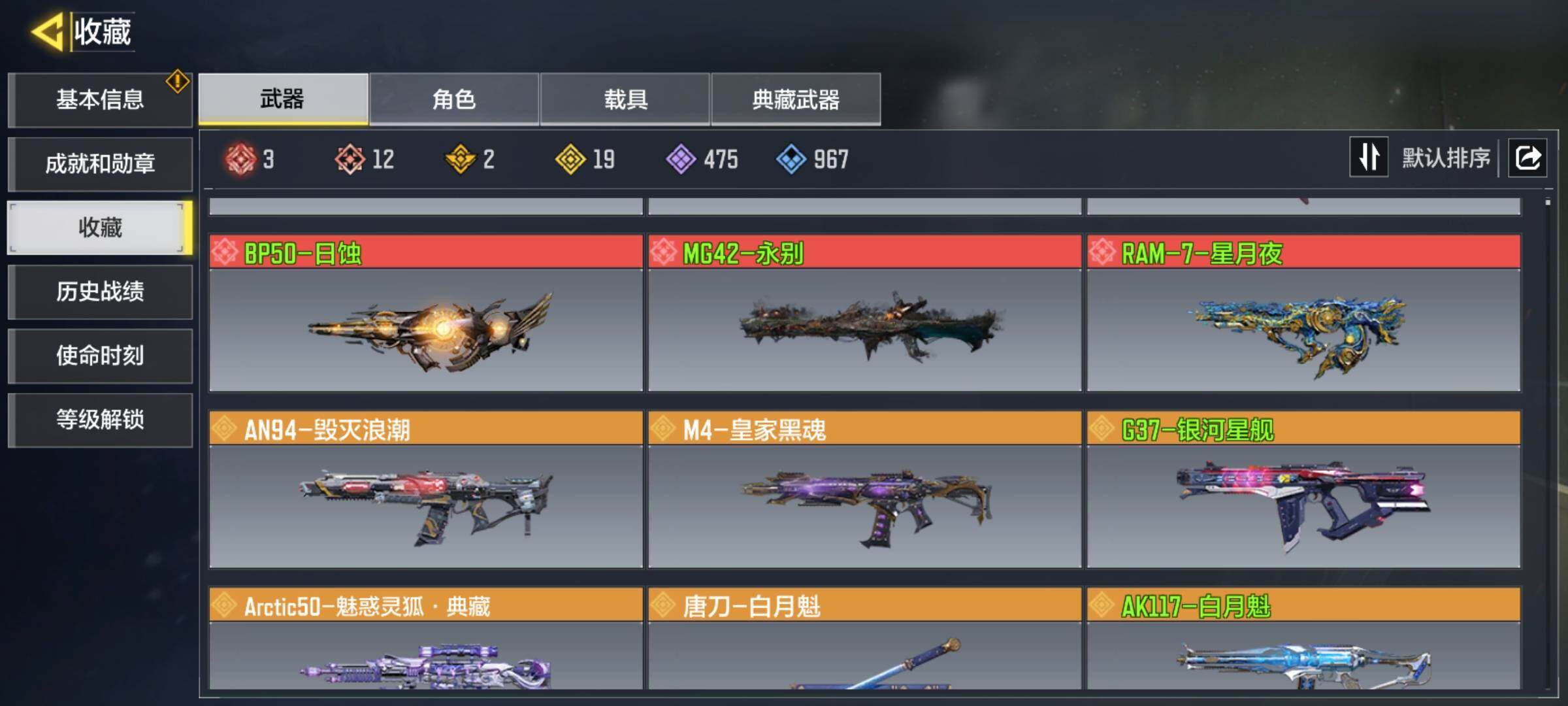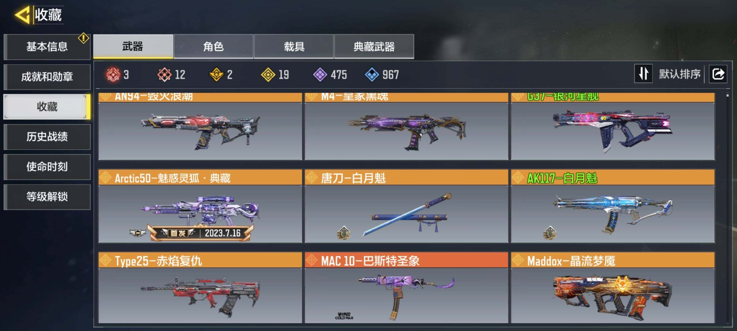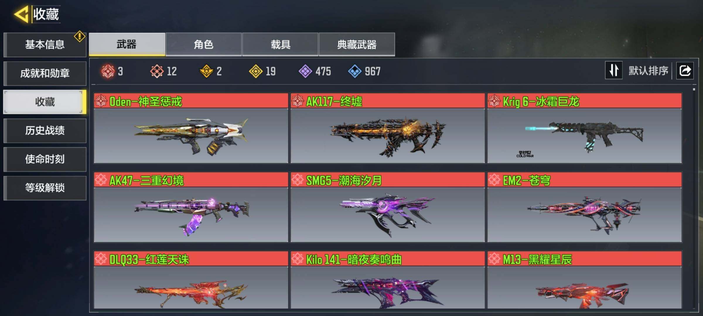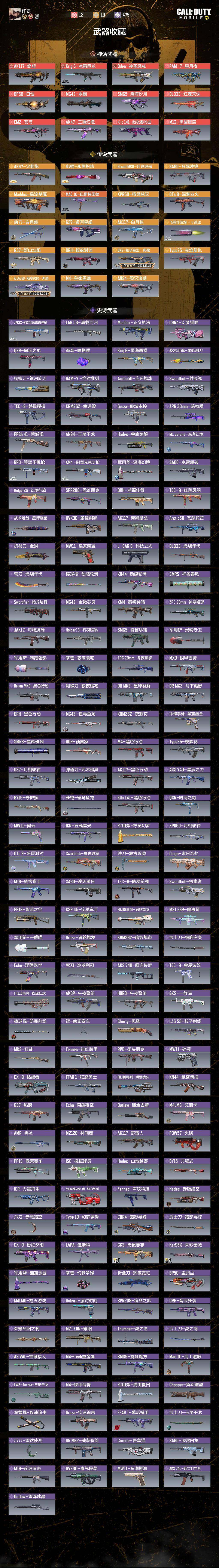 ,Oden-神圣惩戒,Krig6-冰霜巨龙,AK117-终墟,AK47-三重幻境,EM2-苍穹,SMG5-潮海汐月,DLQ33-红莲天诛,Kilo141-暗夜奏鸣曲,M13-黑耀星辰,BP50-日蚀,MG42-永别,RAM-7-星月夜,G37-银河星舰,AK117-白月魁,唐刀-白月魁,Arctic50-魅惑灵狐·典藏,Mac 10-巴斯特圣象,SKS-粒子震击·典藏,XPR50-精灵咏叹,OTs 9-深渊业火【按实名: 可二次】