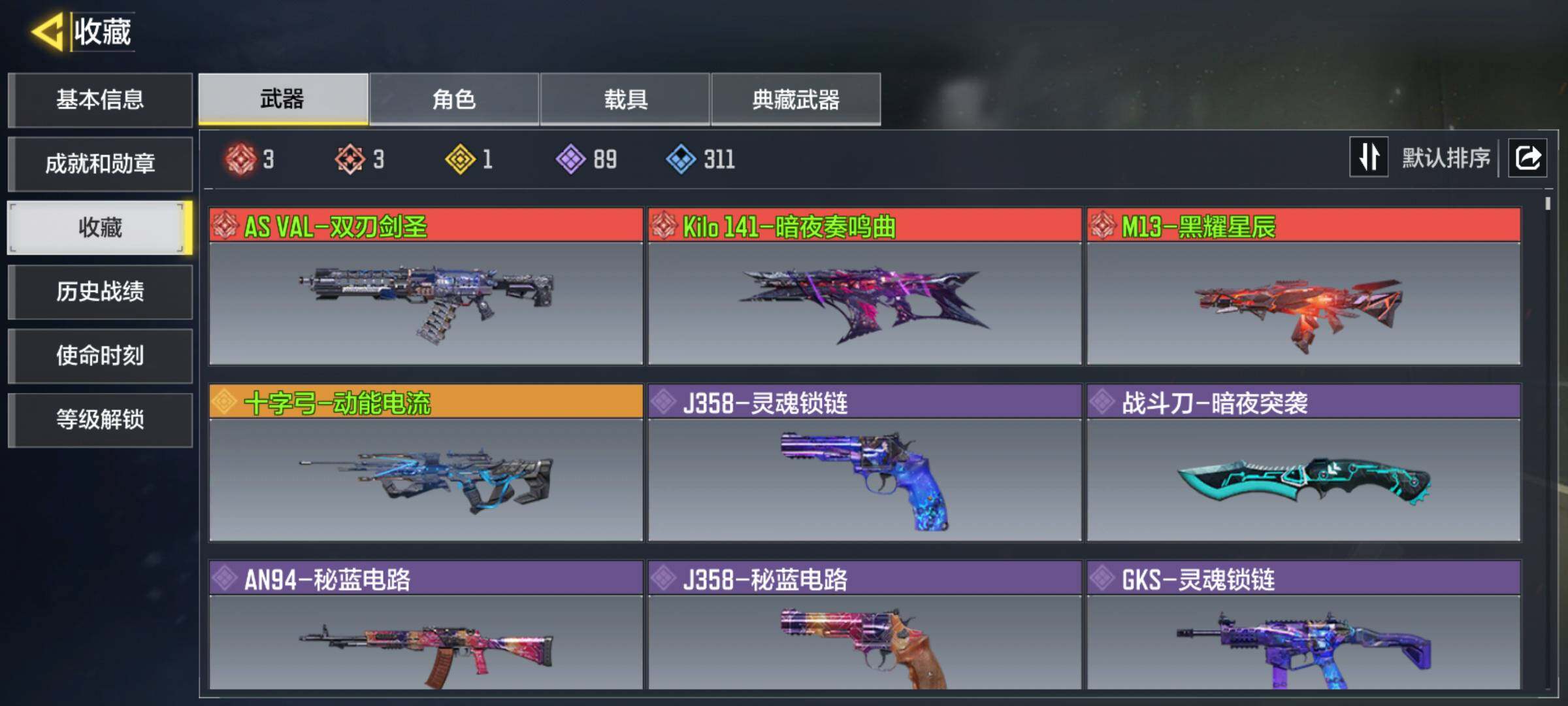 [12813718]Xr41445-可修改-安Q-具体看截图-【神话武器】:AS VAL-双刃剑圣,Kilo141-暗夜奏鸣曲,M13-黑耀星辰 【传说武器】:十字弓-动能电流【按实名: 可二次】 【按防沉迷: 无防沉迷】 【段位: 黄金】