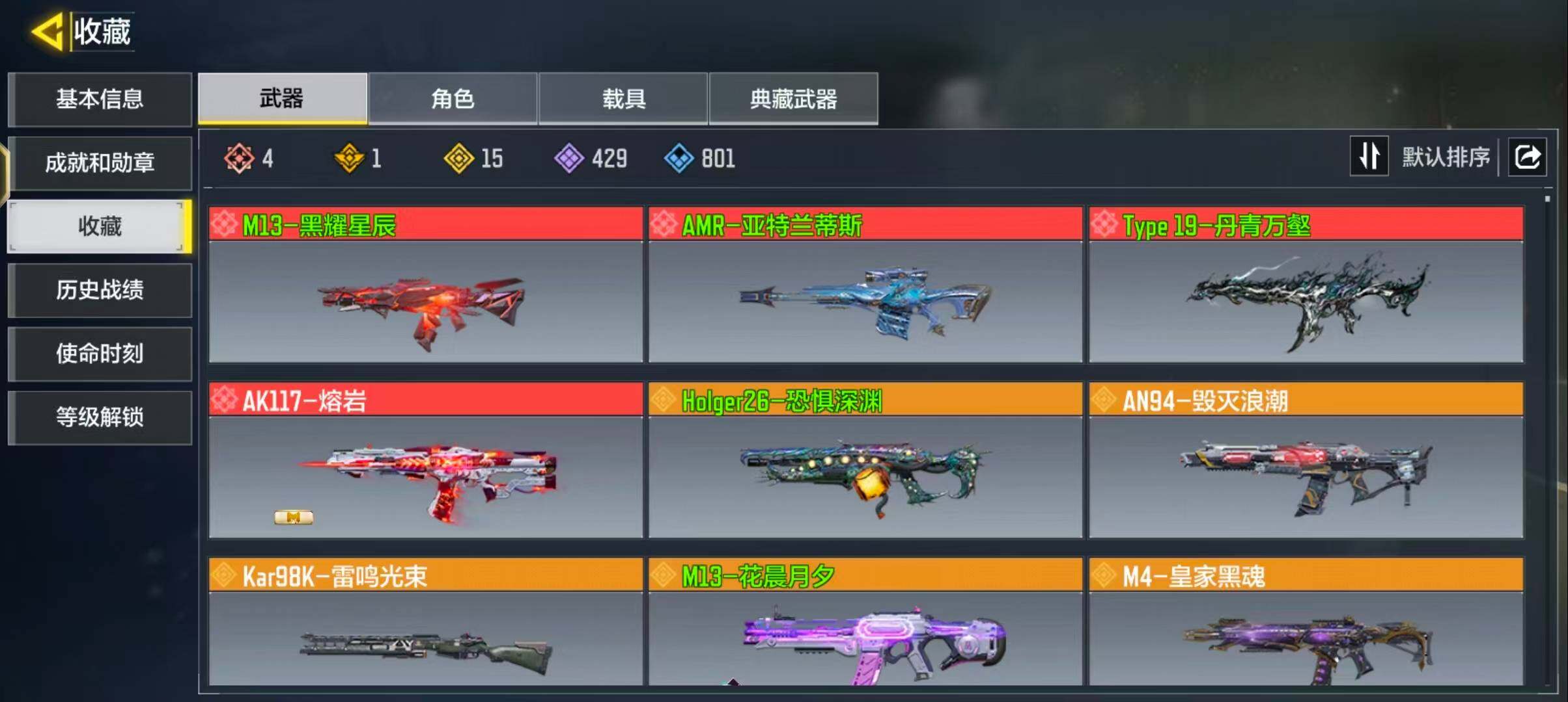 [13114393]有二次 4红15金 ,M13-黑耀星辰,AMR-亚特兰蒂斯,AK117-熔岩,Type19-丹青万壑