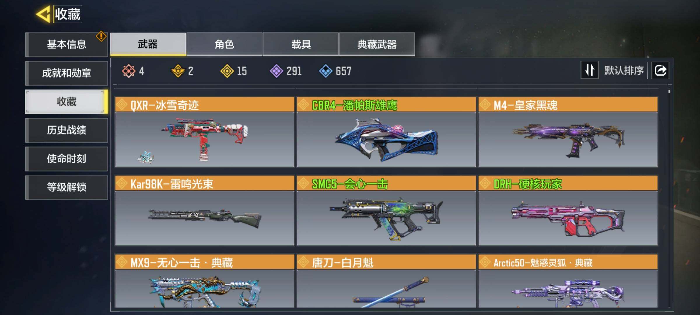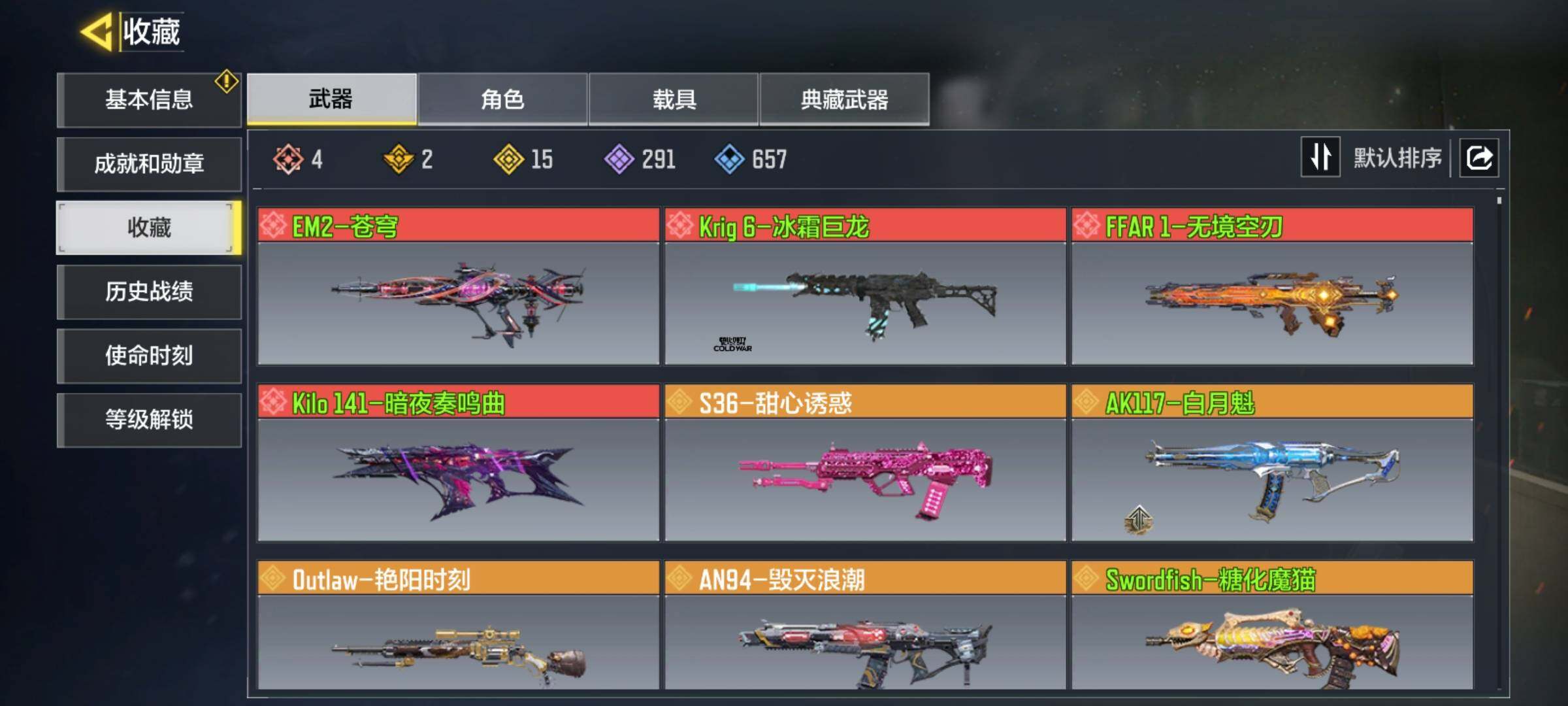 [13274207]有二次 4红15金,FFAR 1-无境空刃,EM2-苍穹,Krig6-冰霜巨龙,Kilo141-暗夜奏鸣曲,Kar98K-雷鸣光束,唐刀-白月魁,Outlaw-艳阳时刻【按实名: 可二次】