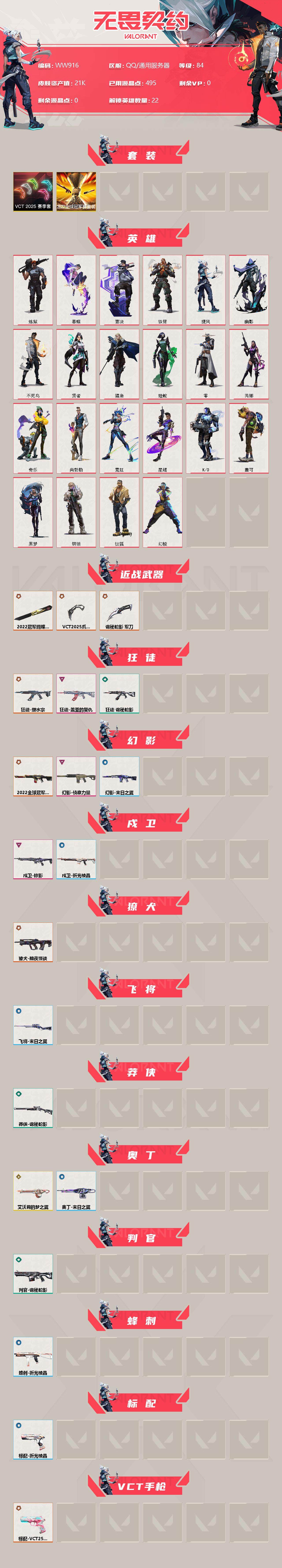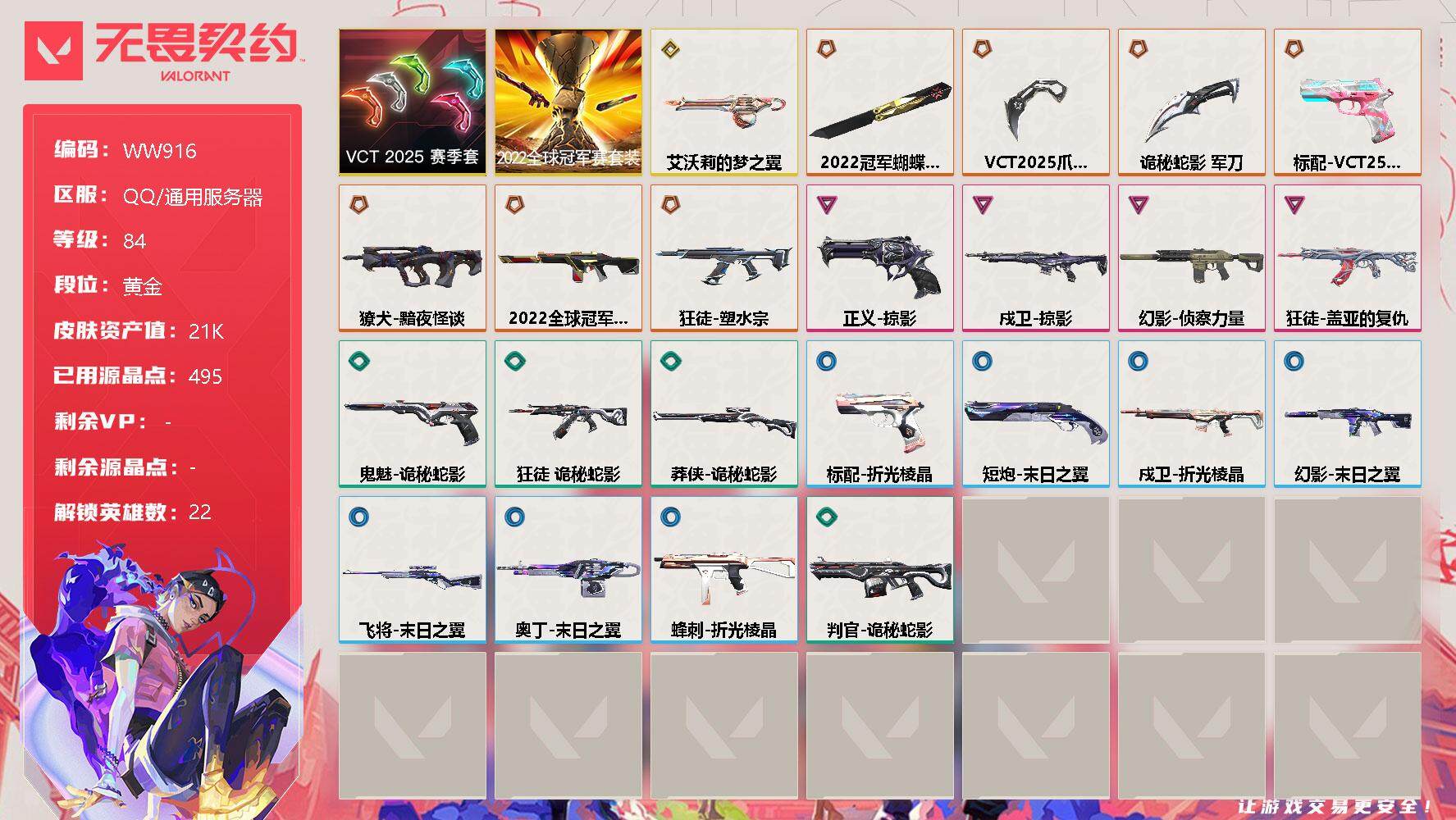 【WW916】终极*8/传奇*1/卓越*4/皮肤*37/等级*84/段位:黄金/2022全球冠军赛套装/VCT 2025 赛季套装/幻棱/炼狱/暮蝶/钛狐/壹决/铁臂/捷风/幽影/不死鸟/贤者/猎枭/蝰蛇/零/芮娜/奇乐/尚勃勒/霓虹/星礈/K/O/盖可/黑梦/钢锁/近战武器-2022全球冠军赛 蝴蝶刀/近战武器-VCT 2025 爪刀/近战武器-诡秘蛇影 军刀/狂徒-塑水宗/狂徒-盖亚的复仇/狂徒-诡秘蛇影/幻影-2022全球冠军赛/幻影-侦察力量/幻影-末日之翼/戍卫-掠影/戍卫-折光棱晶/獠犬-黯夜怪谈/飞将-末日之翼/莽侠-诡秘蛇影/奥丁-艾沃莉的梦之翼/奥丁-末日之翼/判官-诡秘蛇影/蜂刺-折光棱晶/标配-折光棱晶/标配-VCT25 x BLG/正义-掠影/鬼魅-诡秘蛇影/短炮-末日之翼/精灵大战 卡面/欢迎来到底城 卡面/南瓜盛典 卡面/正义的化身 卡面/无畏契约GO!第一卷:零 卡面/代号红色 卡面/新兵报到 卡面/V契约 卡面/无畏契约 卡面/都算到了 喷漆/控场勿近 喷漆/买装还是存钱 喷漆/胜利属于无畏契约 喷漆/GLHF 喷漆/无畏契约 喷漆/伞绳 挂饰/第九季//第三幕 纪念币 挂饰/无畏契约GO!第一卷 芮娜 挂饰/无畏契约GO!第一卷 零 挂饰/第九季//第二幕 纪念币 挂饰/无畏契约 纪念币 挂饰【账号类型: QQ】