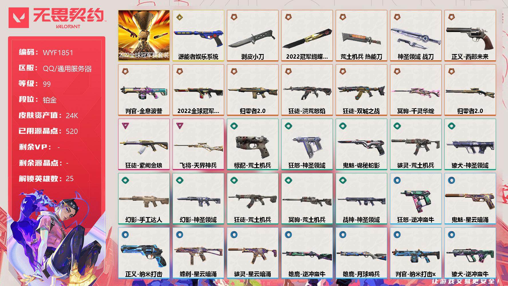 【WYF1851】终极*12/传奇*1/卓越*2/皮肤*42/等级*99/段位:铂金/2022全球冠军赛套装/幻棱/炼狱/维斯/暮蝶/钛狐/壹决/铁臂/捷风/雷兹/幽影/不死鸟/贤者/猎枭/蝰蛇/零/芮娜/奇乐/尚勃勒/霓虹/斯凯/夜露/星礈/K/O/盖可/钢锁/近战武器-2022全球冠军赛 蝴蝶刀/近战武器-剥皮小刀/近战武器-荒土机兵 热能刀/近战武器-神圣领域 战刀/狂徒-洪荒怒焰/狂徒-双城之战/狂徒-紫阙金琅/狂徒-荒土机兵/幻影-2022全球冠军赛/幻影-归零者//2.0/幻影-手工达人/幻影-神圣领域/幻影-纳米打击/戍卫-逆冲蛮牛/戍卫-月球哨兵/獠犬-神圣领域/獠犬-逆冲蛮牛/冥驹-千灵华绽/冥驹-荒土机兵/冥驹-星云暗涌/飞将-天界神兵/莽侠-归零者//2.0/莽侠-月球哨兵/战神-神圣领域/奥丁-纳米打击/判官-全息波普/判官-纳米打击x/雄鹿-逆冲蛮牛/雄鹿-月球哨兵/骇灵-荒土机兵/骇灵-星云暗涌/蜂刺-星云暗涌/标配-荒土机兵/正义-西部未来/正义-纳米打击/正义-月球哨兵/鬼魅-源能者娱乐系统/鬼魅-诡秘蛇影/鬼魅-星云暗涌/狂怒-神圣领域/狂怒-逆冲蛮牛/终章:激斗汉堡 卡面/进入射程 卡面/分崩离析 卡面/纳米打击 卡面/抑制技术 卡面/激斗汉堡 卡面/瓦娃脸雪糕 P2 卡面/从黄昏到黎明 卡面/荒土机兵 卡面/银弹猎手 卡面/逆冲蛮牛 卡面/《双城之战》拥抱 卡面/精灵大战 卡面/欢迎来到底城 卡面/南瓜盛典 卡面/修车达人 卡面/正义的化身 卡面/Clutch 卡面/无畏契约GO!第一卷:芮娜 卡面/无畏契约GO!第一卷:零 卡面/代号红色 卡面/新兵报到 卡面/V契约 卡面/无畏契约 卡面/小小心意 喷漆/战“素”兔 喷漆/宇宙的指引 喷漆/请求重启 喷漆/逆冲蛮牛 喷漆/纳米打击 喷漆/鼻尖上的蝴蝶 喷漆/简笔画黯兽 喷漆/独守蝰腹 喷漆/他们将落荒而逃 喷漆/通缉:战术企鹅 喷漆/荒土机兵 喷漆/别挡我吃球! 喷漆/嗨宝南瓜灯 喷漆/嘭! 喷漆/都算到了 喷漆/控场勿近 喷漆/熊抱 喷漆/捷风差距 喷漆/买装还是存钱 喷漆/无畏契约GO!第一卷:零 喷漆/胜利属于无畏契约 喷漆/GLHF 喷漆/无畏契约 喷漆/终章:猫猫木乃伊 挂饰/荒土机兵 挂饰/悠闲鸡块 挂饰/猫猫木乃伊 挂饰/水壶 挂饰/纳米打击 挂饰/逆冲蛮牛 挂饰/可爱糖糖 挂饰/伞绳 挂饰/《双城之战》小蛋糕 挂饰/第九季//第三幕 纪念币 挂饰/熔岩灯 挂饰/瞬云履 挂饰/第九季//第二幕 纪念币 挂饰/Z世代特饮 挂饰/天外飞客 挂饰/无畏契约 纪念币 挂饰【账号类型: QQ】