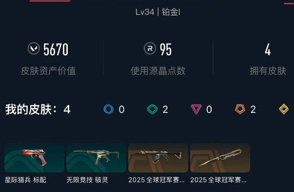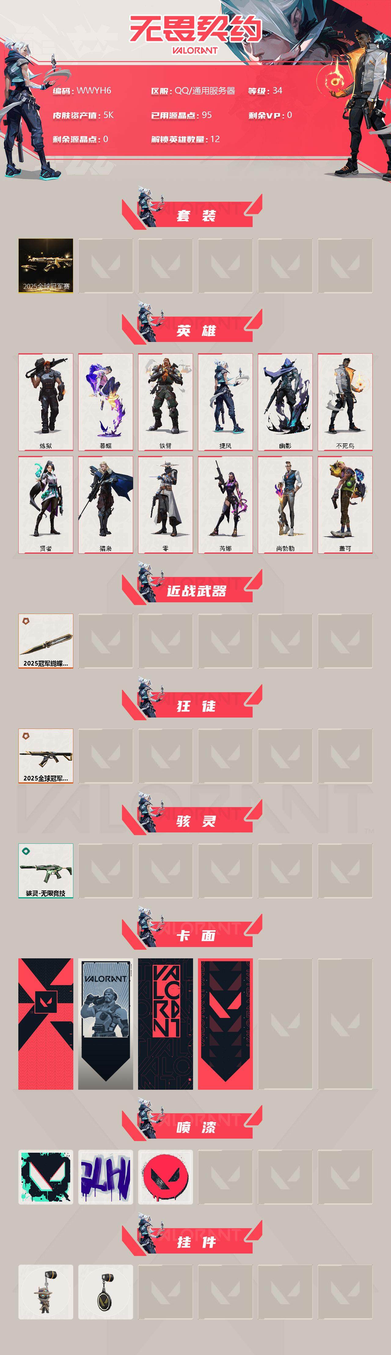 【WWYH6】终极*2/皮肤*4/等级*34/段位:铂金/2025全球冠军赛套装/炼狱/暮蝶/铁臂/捷风/幽影/不死鸟/贤者/猎枭/零/芮娜/尚勃勒/盖可/近战武器-2025全球冠军赛 蝴蝶刀/狂徒-2025全球冠军赛/骇灵-无限竞技/代号红色 卡面/新兵报到 卡面/V契约 卡面/无畏契约 卡面/胜利属于无畏契约 喷漆/GLHF 喷漆/无畏契约 喷漆/无畏契约GO!第一卷 零 挂饰/无畏契约 纪念币 挂饰【账号类型: QQ】