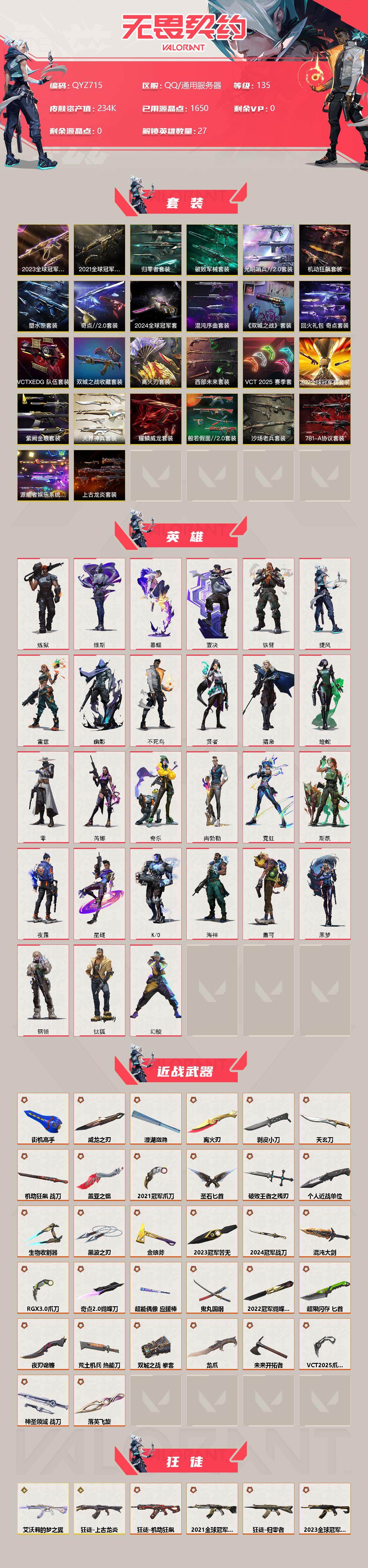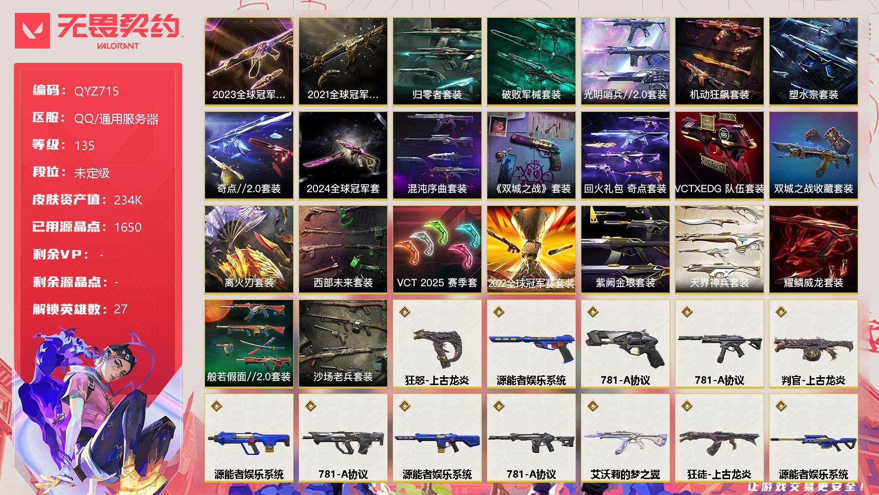 【QYZ715】终极*86/传奇*13/卓越*23/皮肤*231/等级*135/段位:未定级/2024全球冠军赛套装/2023全球冠军赛套装/2022全球冠军赛套装/2021全球冠军赛套装/源能者娱乐系统套装/781-A协议套装/上古龙炎套装/VCT 2025 赛季套装/西部未来套装/混沌序曲套装/塑水宗套装/离火刃套装/《英雄联盟:双城之战》套装/《双城之战》收藏套装/光明哨兵//2.0套装/奇点//2.0套装/归零者套装/破败军械套装/机动狂飙套装/VCTxEDG 队伍套装/回火礼包:奇点套装/般若假面//2.0套装/耀鳞威龙套装/紫阙金琅套装/天界神兵套装/沙场老兵套装/幻棱/炼狱/维斯/暮蝶/钛狐/壹决/铁臂/捷风/雷兹/幽影/不死鸟/贤者/猎枭/蝰蛇/零/芮娜/奇乐/尚勃勒/霓虹/斯凯/夜露/星礈/K/O/海神/盖可/黑梦/钢锁/近战武器-2024全球冠军赛 战刀/近战武器-2023全球冠军赛苦无/近战武器-2022全球冠军赛 蝴蝶刀/近战武器-2021全球冠军赛 爪刀/近战武器-剥皮小刀/近战武器-奇点//2.0 蝴蝶刀/近战武器-VCT 2025 爪刀/近战武器-RGX 11z Pro//3.0 爪刀/近战武器-离火刃/近战武器-黑波之刃/近战武器-落英飞旋/近战武器-威龙之刃/近战武器-澄湖潋滟/近战武器-鬼丸国纲/近战武器-双城之战 拳套/近战武器-未来开拓者/近战武器-龙爪/近战武器-混沌大剑/近战武器-超能偶像 应援棒/近战武器-超限闪存 匕首/近战武器-盖亚之愠/近战武器-个人近战单位/近战武器-荒土机兵 热能刀/近战武器-机动狂飙 战刀/近战武器-街机高手/近战武器-金琅斧/近战武器-破败王者之残刃/近战武器-生物收割器/近战武器-圣石匕首/近战武器-天玄刀/近战武器-夜刃诡镰/近战武器-神圣领域 战刀/狂徒-艾沃莉的梦之翼/狂徒-上古龙炎/狂徒-2023全球冠军赛/狂徒-2021全球冠军赛/狂徒-光明哨兵/狂徒-归零者/狂徒-洪荒怒焰/狂徒-混沌序曲/狂徒-机动狂飙/狂徒-奇点//2.0/狂徒-双城之战/狂徒-塑水宗/狂徒-创·纪元/狂徒-般若假面//2.0/狂徒-冰点凝冻/狂徒-堕天遗武/狂徒-掠影/狂徒-盖亚的复仇/狂徒-海洋之星/狂徒-耀鳞威龙/狂徒-紫阙金琅/狂徒-超能偶像/狂徒-弧光异彩/狂徒-荒土机兵/幻影-781-A协议/幻影-源能者娱乐系统/幻影-2022全球冠军赛/幻影-2024全球冠军赛/幻影-光明哨兵//2.0/幻影-洪荒怒焰/幻影-破败军械/幻影-奇点/幻影-千灵华绽/幻影-西部未来/幻影-般若假面/幻影-侦察力量/幻影-超限闪存/幻影-神圣领域/幻影-聚合之力/幻影-纳米打击/幻影-战术小伙伴/戍卫-破败军械/戍卫-天界神兵/戍卫-紫阙金琅/戍卫-超能偶像/戍卫-钢轨卫士/戍卫-彩梦之城/戍卫-浮光跃金/戍卫-萌彩剪影/戍卫-逆冲蛮牛/戍卫-沙场老兵/戍卫-月球哨兵/獠犬-781-A协议/獠犬-源能者娱乐系统/獠犬-归零者/獠犬-般若假面//2.0/獠犬-神圣领域/獠犬-采蜜小蜂队/獠犬-胡桃狂想/獠犬-模拟赫兹/獠犬-逆冲蛮牛/冥驹-源能者娱乐系统/冥驹-上古龙炎/冥驹-归零者/冥驹-混沌序曲/冥驹-偃月苍龙/冥驹-堕天遗武/冥驹-荒土机兵/冥驹-胡桃狂想/冥驹-模拟赫兹/冥驹-沙场老兵/冥驹-星云暗涌/飞将-塑水宗/飞将-西部未来/飞将-天界神兵/飞将-沙尘幻旅/飞将-聚合之力/飞将-光导纤维/莽侠-归零者//2.0/莽侠-超限闪存/莽侠-月球哨兵/战神-奇点/战神-般若假面//2.0/战神-神圣领域/战神-采蜜小蜂队/战神-浮光跃金/战神-萌彩剪影/战神-沙场老兵/奥丁-光明哨兵//2.0/奥丁-砰砰X特攻队/奥丁-西部未来/奥丁-纳米打击/奥丁-信手涂鸦/奥丁-战术小伙伴/判官-上古龙炎/判官-偃月苍龙/判官-超能偶像/判官-采蜜小蜂队/判官-萌彩剪影/判官-纳米打击x/判官-数码咒术/雄鹿-机动狂飙/雄鹿-彩梦之城/雄鹿-模拟赫兹/雄鹿-逆冲蛮牛/雄鹿-月球哨兵/骇灵-781-A协议/骇灵-光明哨兵//2.0/骇灵-破败军械/骇灵-奇点/骇灵-塑水宗/骇灵-紫阙金琅/骇灵-荒土机兵/骇灵-沙尘幻旅/骇灵-浮光跃金/骇灵-光导纤维/骇灵-花漾粉红/骇灵-沙场老兵/骇灵-信手涂鸦/骇灵-星云暗涌/蜂刺-混沌序曲/蜂刺-机动狂飙/蜂刺-天界神兵/蜂刺-超限闪存/蜂刺-合金战车/蜂刺-弧光异彩/蜂刺-胡桃狂想/蜂刺-聚合之力/蜂刺-战术小伙伴/蜂刺-星云暗涌/标配-黯夜怪谈/标配-紫阙金琅/标配-超能偶像/标配-荒土机兵/标配-彩梦之城/标配-浮光跃金/标配-光导纤维/标配-VCT x EDG/标配-VCT25 x EDG/正义-781-A协议/正义-机动狂飙/正义-奇点/正义-千灵华绽/正义-双城之战/正义-塑水宗/正义-西部未来/正义-超限闪存/正义-合金战车/正义-传奇制造/正义-纳米打击/正义-月球哨兵/鬼魅-源能者娱乐系统/鬼魅-破败军械/鬼魅-奇点//2.0/鬼魅-盖亚的复仇/鬼魅-天界神兵/鬼魅-耀鳞威龙/鬼魅-采蜜小蜂队/鬼魅-胡桃狂想/鬼魅-模拟赫兹/鬼魅-沙场老兵/鬼魅-信手涂鸦/鬼魅-星云暗涌/狂怒-上古龙炎/狂怒-般若假面//2.0/狂怒-钢轨卫士/狂怒-神圣领域/狂怒-花漾粉红/狂怒-聚合之力/狂怒-萌彩剪影/狂怒-逆冲蛮牛/短炮-光明哨兵//2.0/短炮-归零者/短炮-混沌序曲/短炮-钢轨卫士/终章:激斗汉堡 卡面/进入射程 卡面/分崩离析 卡面/纳米打击 卡面/抑制技术 卡面/激斗汉堡 卡面/瓦娃脸雪糕 P2 卡面/从黄昏到黎明 卡面/荒土机兵 卡面/银弹猎手 卡面/逆冲蛮牛 卡面/《双城之战》拥抱 卡面/精灵大战 卡面/欢迎来到底城 卡面/南瓜盛典 卡面/VCT CN首冠 卡面/唱片的故事 卡面/钢弓与箭弦 卡面/无畏契约:暮蝶 卡面/排除故障 卡面/奇点//2.0 卡面/战术桌游 卡面/悠享食光 卡面/修车达人 卡面/热舞环节 卡面/模拟赫兹 卡面/浮光跃金 卡面/超限闪存 卡面