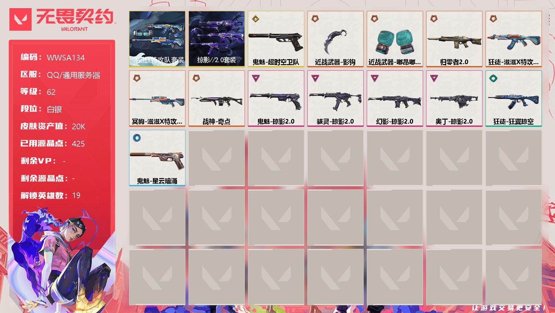 【WWSA134】终极*7/传奇*1/卓越*4/皮肤*26/等级*62/段位:白银/滋滋X特攻队套装/掠影//2.0套装/幻棱/炼狱/暮蝶/钛狐/壹决/铁臂/捷风/雷兹/幽影/不死鸟/贤者/猎枭/蝰蛇/芮娜/尚勃勒/斯凯/星礈/盖可/钢锁/近战武器-嘟昂嘟昂超弹力水球拳套/近战武器-影钩/狂徒-滋滋X特攻队/狂徒-狂翼掠空/幻影-归零者//2.0/幻影-掠影//2.0/冥驹-滋滋X特攻队/战神-奇点/奥丁-掠影//2.0/骇灵-掠影//2.0/鬼魅-超时空卫队/鬼魅-掠影//2.0/鬼魅-星云暗涌/树懒大作战 卡面/红鳞松叶 卡面/无畏契约GO!第一卷:零 卡面/无垠星环 卡面/《双城之战》金克丝 卡面/钢锁vs盖可 卡面/代号红色 卡面/新兵报到 卡面/V契约 卡面/无畏契约 卡面/审判之爪 喷漆/买装还是存钱 喷漆/关门放狗 喷漆/酷熊冲浪 喷漆/松叶 喷漆/无畏契约GO!第一卷:奇乐 喷漆/放下武器 喷漆/胜利属于无畏契约 喷漆/GLHF 喷漆/无畏契约 喷漆/鱼骨头 挂饰/薰衣草之心 挂饰/动力机箱 挂饰/天外飞客 挂饰/无畏契约 纪念币 挂饰【账号类型: QQ】