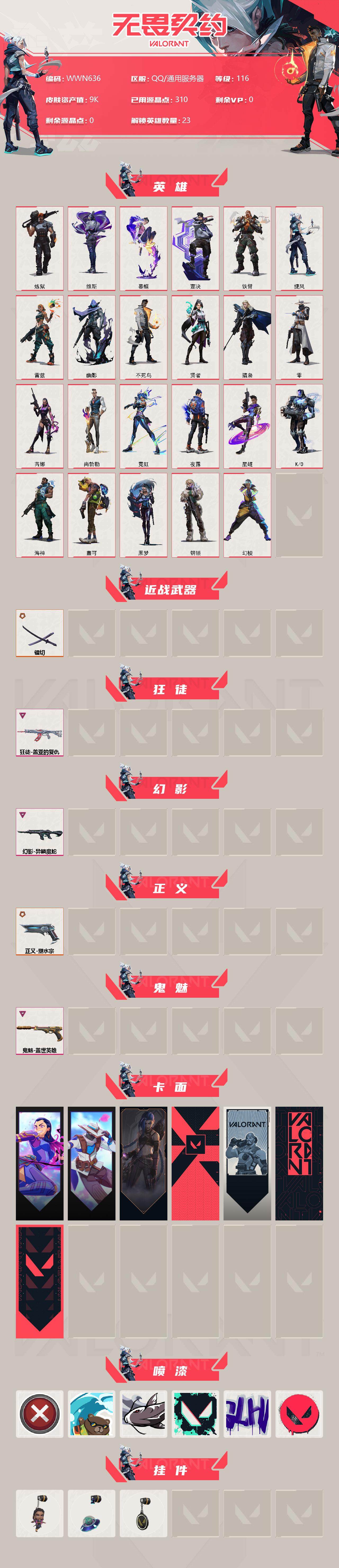 【WWN636】终极*3/卓越*3/皮肤*20/等级*116/段位:白银/幻棱/炼狱/维斯/暮蝶/壹决/铁臂/捷风/雷兹/幽影/不死鸟/贤者/猎枭/零/芮娜/尚勃勒/霓虹/夜露/星礈/K/O/海神/盖可/黑梦/钢锁/近战武器-镭切/狂徒-盖亚的复仇/幻影-异鳞魔蛇/正义-塑水宗/鬼魅-盖世英雄/无畏契约GO!第一卷:芮娜 卡面/无畏契约GO!第一卷:零 卡面/《双城之战》金克丝 卡面/代号红色 卡面/新兵报到 卡面/V契约 卡面/无畏契约 卡面/买装还是存钱 喷漆/酷熊冲浪 喷漆/松叶 喷漆/胜利属于无畏契约 喷漆/GLHF 喷漆/无畏契约 喷漆/无畏契约GO!第一卷 芮娜 挂饰/天外飞客 挂饰/无畏契约 纪念币 挂饰【账号类型: QQ】