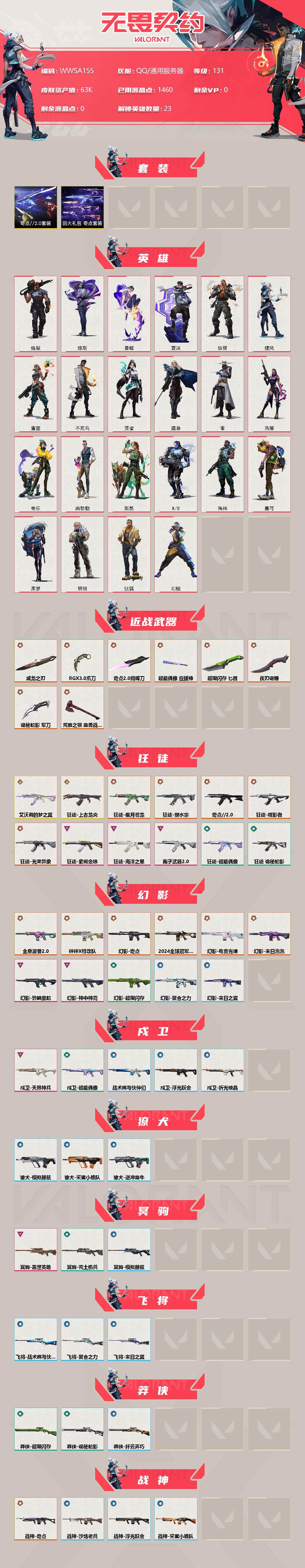 【WWSA155】终极*29/传奇*2/卓越*9/皮肤*107/等级*131/段位:青铜/奇点//2.0套装/回火礼包:奇点套装/幻棱/炼狱/维斯/暮蝶/钛狐/壹决/铁臂/捷风/雷兹/不死鸟/贤者/猎枭/零/芮娜/奇乐/尚勃勒/斯凯/K/O/海神/盖可/黑梦/钢锁/近战武器-奇点//2.0 蝴蝶刀/近战武器-RGX 11z Pro//3.0 爪刀/近战武器-威龙之刃/近战武器-荒狼之颚 蛮勇战斧/近战武器-超能偶像 应援棒/近战武器-超限闪存 匕首/近战武器-夜刃诡镰/近战武器-诡秘蛇影 军刀/狂徒-艾沃莉的梦之翼/狂徒-上古龙炎/狂徒-奇点//2.0/狂徒-塑水宗/狂徒-偃月苍龙/狂徒-噬影者/狂徒-光荣异象/狂徒-海洋之星/狂徒-紫阙金琅/狂徒-离子武器//2.0/狂徒-超能偶像/狂徒-诡秘蛇影/幻影-2024全球冠军赛/幻影-砰砰X特攻队/幻影-奇点/幻影-全息波普//2.0/幻影-电音光谱/幻影-末日泡泡/幻影-异鳞魔蛇/幻影-神中神罚/幻影-超限闪存/幻影-聚合之力/幻影-末日之翼/戍卫-天界神兵/戍卫-超能偶像/戍卫-浮光跃金/戍卫-战术熊与伙伴们/戍卫-折光棱晶/獠犬-采蜜小蜂队/獠犬-模拟赫兹/獠犬-逆冲蛮牛/冥驹-盖世英雄/冥驹-荒土机兵/冥驹-模拟赫兹/飞将-聚合之力/飞将-战术熊与伙伴们/飞将-末日之翼/莽侠-超限闪存/莽侠-诡秘蛇影/莽侠-纤云弄巧/战神-奇点/战神-采蜜小蜂队/战神-浮光跃金/战神-沙场老兵/奥丁-毁灭骑士/奥丁-流星兵团/奥丁-纳米打击/奥丁-末日之翼/判官-超能偶像/判官-诡秘蛇影/判官-采蜜小蜂队/判官-纳米打击x/雄鹿-模拟赫兹/雄鹿-逆冲蛮牛/骇灵-破败军械/骇灵-奇点/骇灵-神中神罚/骇灵-荒土机兵/骇灵-流星兵团/骇灵-无限竞技/骇灵-浮光跃金/蜂刺-超限闪存/蜂刺-聚合之力/蜂刺-纤云弄巧/蜂刺-折光棱晶/标配-电音光谱/标配-超能偶像/标配-荒土机兵/标配-浮光跃金/标配-战术熊与伙伴们/标配-折光棱晶/标配-VCT25 x DRG/正义-奇点/正义-塑水宗/正义-超限闪存/鬼魅-奇点//2.0/鬼魅-天界神兵/鬼魅-诡秘蛇影/鬼魅-采蜜小蜂队/鬼魅-模拟赫兹/狂怒-聚合之力/狂怒-逆冲蛮牛/狂怒-战术熊与伙伴们/短炮-纤云弄巧/短炮-末日之翼/纳米打击 卡面/抑制技术 卡面/激斗汉堡 卡面/瓦娃脸雪糕 P2 卡面/荒土机兵 卡面/银弹猎手 卡面/《双城之战》拥抱 卡面/精灵大战 卡面/欢迎来到底城 卡面/南瓜盛典 卡面/唱片的故事 卡面/钢弓与箭弦 卡面/排除故障 卡面/奇点//2.0 卡面/战术桌游 卡面/悠享食光 卡面/修车达人 卡面/模拟赫兹 卡面/浮光跃金 卡面/超限闪存 卡面/维斯工牌 卡面/正义的化身 卡面/终章:生意人麦宝 卡面/铁之华 卡面/失而复得 卡面/时间到 卡面/最高舞台 卡面/复活专家 卡面/归乡 // 蝰蛇 卡面/超能偶像 卡面/生意人麦宝 卡面/音熊登场 卡面/树懒大作战 卡面/声感陷阱设计图 卡面/红鳞松叶 卡面/钢锁工牌 卡面/战术小伙伴的夏日 卡面/采蜜小蜂队 卡面/聚合之力 卡面/梦幻奶茶 卡面/暮蝶工牌 卡面/战术熊与伙伴们 卡面/源能反应 卡面/流星兵团 卡面/纤云弄巧 卡面/暂别喧嚣 卡面/打造专属狂徒 卡面/零点嗅探设计图 卡面/无畏契约GO!第一卷:芮娜 卡面/清除名单 卡面/无畏契约GO!第一卷:零 卡面/无垠星环 卡面/《双城之战》金克丝 卡面/蝰蛇vs幽影 卡面/同步耍酷 卡面/无畏契约GO!第一卷:贤者 卡面/铁臂vs雷兹 卡面/钢锁vs盖可 卡面/别冒尖 卡面/代号红色 卡面/新兵报到 卡面/V契约 卡面/无畏契约 卡面/请求重启 喷漆/纳米打击 喷漆/简笔画黯兽 喷漆/独守蝰腹 喷漆/他们将落荒而逃 喷漆/通缉:战术企鹅 喷漆/荒土机兵 喷漆/别挡我吃球! 喷漆/嘭! 喷漆/都算到了 喷漆/控场勿近 喷漆/皮蛋呼呼 喷漆/像素星礈 喷漆/图谋不轨的零 喷漆/小丑猫 喷漆/模拟赫兹 喷漆/高丽风情小熊 喷漆/奇点//2.0 喷漆/蹲到一个 喷漆/全力集中 喷漆/超限闪存 喷漆/RUA一下 喷漆/熊抱 喷漆/高丽风情小虎 喷漆/记在小本本 喷漆/防弹企鹅 喷漆/高丽风情小蛙 喷漆/又被闪了 喷漆/终极羞辱 喷漆/超级粉丝 喷漆/黯兽卖萌 喷漆/捷风差距 喷漆/惊声尖叫 喷漆/2021冠军巡回赛花火 喷漆/五人成星 喷漆/超能偶像 喷漆/放我出去 喷漆/战术熊的巴拉莱卡琴 喷漆/审判之爪 喷漆/掩护我 喷漆/大佬发枪 喷漆/边缘试探 喷漆/拼一枪 喷漆/聚合之力 喷漆/采蜜小蜂队 喷漆/梦幻小队 喷漆/五个全都齐了 喷漆/开心到爆炸 喷漆/头号粉丝 喷漆/吸一口快乐 喷漆/永远的答案 喷漆/再来一次? 喷漆/别挡我的路! 喷漆/我的刀呢? 喷漆/当然可以 喷漆/流星兵团 喷漆/战术熊与伙伴们 喷漆/禁止喷漆 喷漆/纤云弄巧 喷漆/霓光四射 喷漆/买装还是存钱 喷漆/关门放狗 喷漆/酷熊冲浪 喷漆/胜利属于无畏契约 喷漆/GLHF 喷漆/无畏契约 喷漆/猫猫木乃伊 挂饰/水壶 挂饰/纳米打击 挂饰/逆冲蛮牛 挂饰/伞绳 挂饰/《双城之战》小蛋糕 挂饰/第九季//第三幕 纪念币 挂饰/拳击战术熊 挂饰/工具腰带 挂饰/无畏契约GO!第一卷 零 挂饰/暗藏猫腻 挂饰/高丽风情 挂饰/奇点//2.0 挂饰/鱼骨头 挂饰/熔岩灯 挂饰/超限闪存 挂饰/迷你K/O 挂饰/模拟赫兹 挂饰/第九季//第二幕 纪念币 挂饰/薰衣草之心 挂饰/终章:这瓜保熟 挂饰/炼狱雪糕 挂饰/糖葫芦 挂饰/袖珍捷风 挂饰/冲上云霄 挂饰/超能偶像 挂饰/迷你浓缩 挂饰/尤克里里 挂饰/这瓜保熟 挂饰/采蜜小蜂队 挂饰/第九季//第一幕 纪念币 挂饰/聚合之力 挂饰/迷你机甲 挂饰/荧光棒 挂饰/章鱼烧先生 挂饰/流星兵团 挂饰/云开见日 挂饰/第八季//第三幕 纪念币 挂饰/天外飞客 挂饰/《