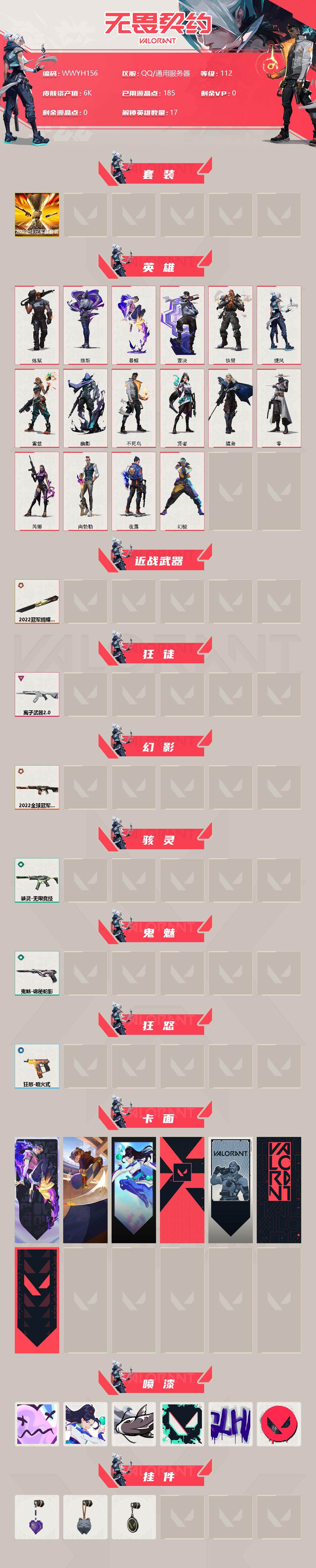 【WWYH156】终极*3/卓越*1/皮肤*21/等级*112/段位:钻石/2022全球冠军赛套装/幻棱/炼狱/维斯/暮蝶/壹决/铁臂/捷风/雷兹/幽影/不死鸟/贤者/猎枭/零/芮娜/尚勃勒/夜露/近战武器-2022全球冠军赛 蝴蝶刀/狂徒-离子武器//2.0/幻影-2022全球冠军赛/骇灵-无限竞技/鬼魅-诡秘蛇影/狂怒-喷火式/无畏契约:暮蝶 卡面/Clutch 卡面/无畏契约GO!第一卷:贤者 卡面/代号红色 卡面/新兵报到 卡面/V契约 卡面/无畏契约 卡面/伤心心 喷漆/无畏契约GO!第一卷:贤者 喷漆/松叶 喷漆/胜利属于无畏契约 喷漆/GLHF 喷漆/无畏契约 喷漆/薰衣草之心 挂饰/《双城之战》魄罗 挂饰/无畏契约 纪念币 挂饰【账号类型: QQ】